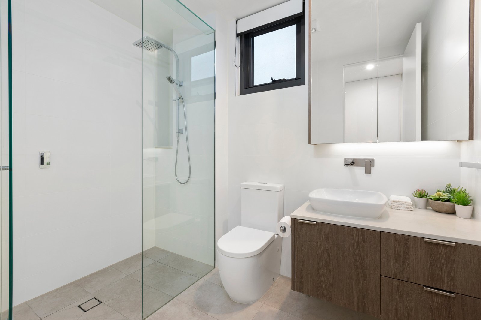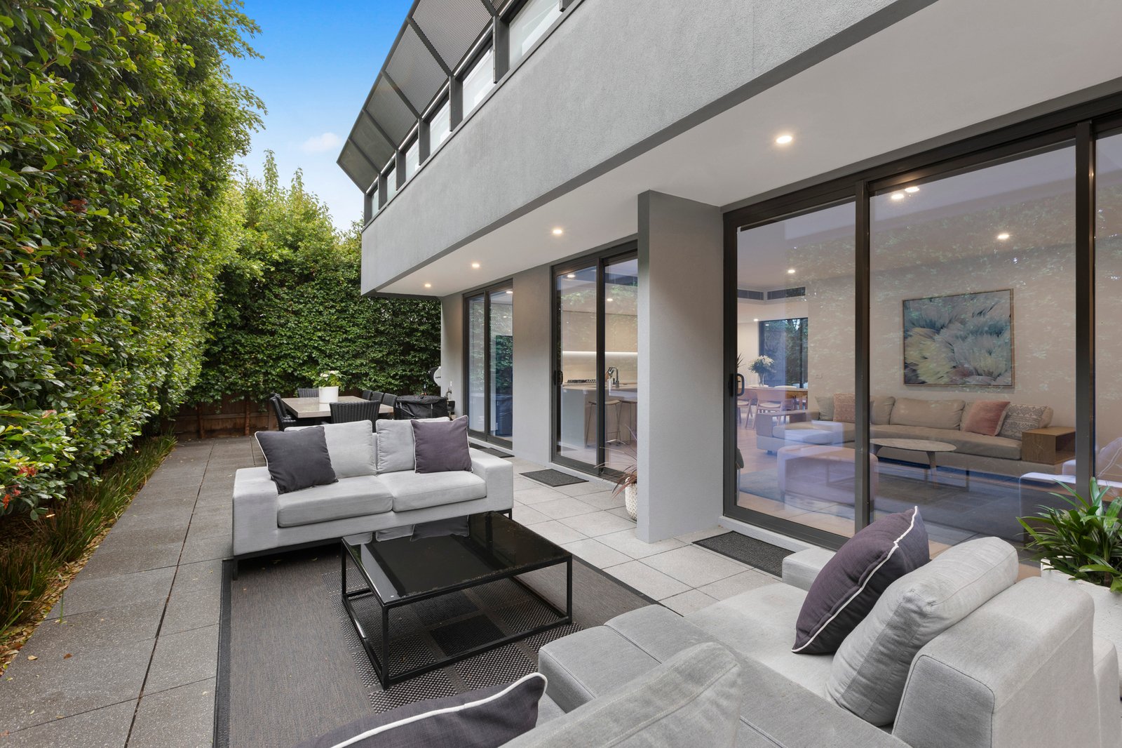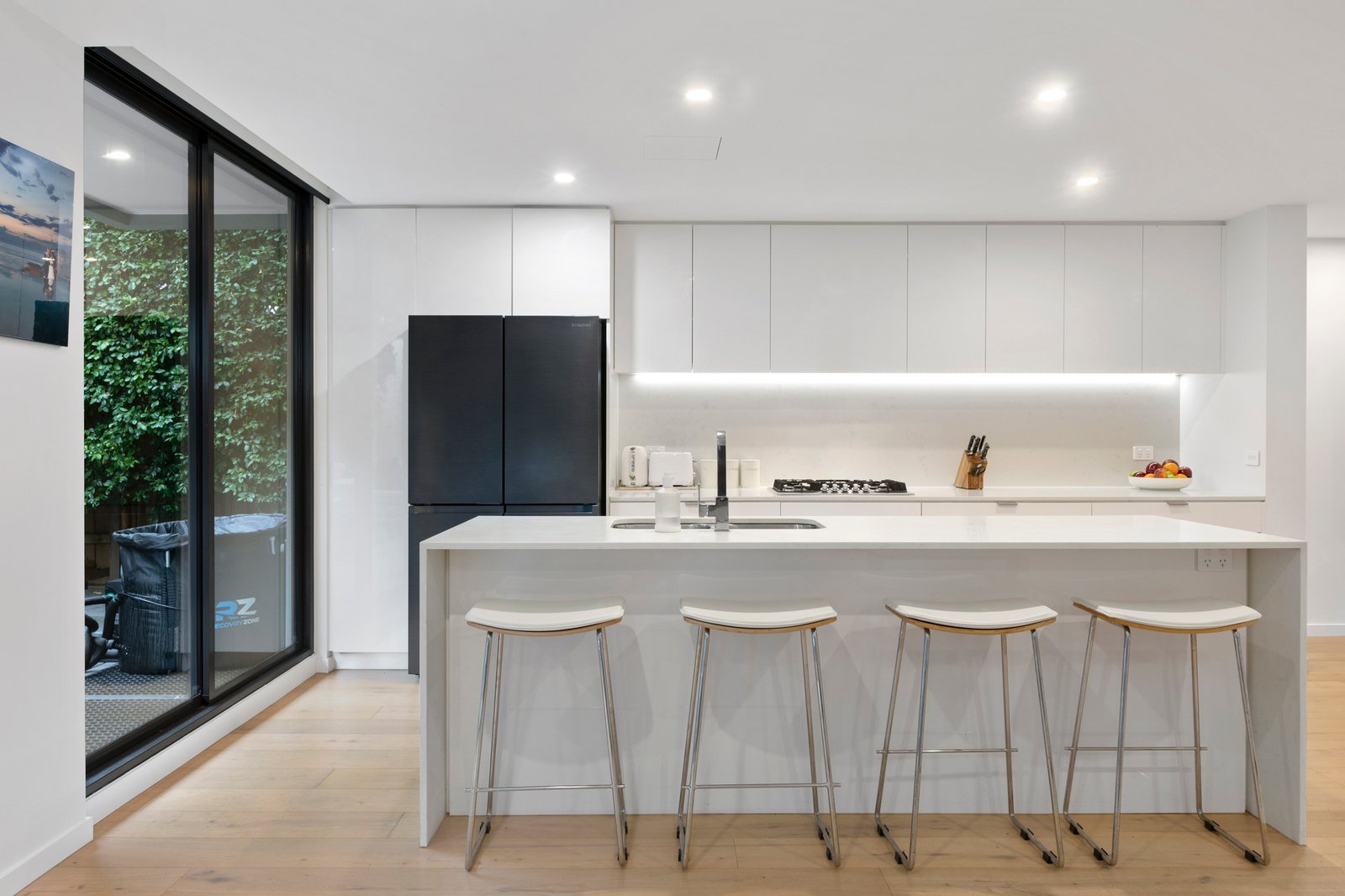 Following a demanding architectural specification with floor-to-ceiling 5-Star tiled bathrooms, the home’s cool coastal interiors feature premium stone benchtops, textural Oak floors, and streamlined cabinetry including custom-fitted robes. Immensely practical with individual climate-control to every room and blinds for every window (automated for most), the residence is doubly secured by video-intercom and multi-lobby entry with and lift-access to two-car basement garaging (with two large walk-in storage areas)...and the rare privacy of rear lane access shared with just two neighbors.