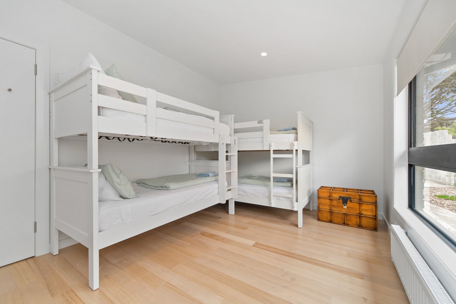 Solid timber floors and vaulted ceilings define the open-plan living and dining domain, where natural light enhances the sense of space. The streamlined kitchen is appointed with white Corian benchtops and matching cabinetry, balancing minimalist design with practical functionality.