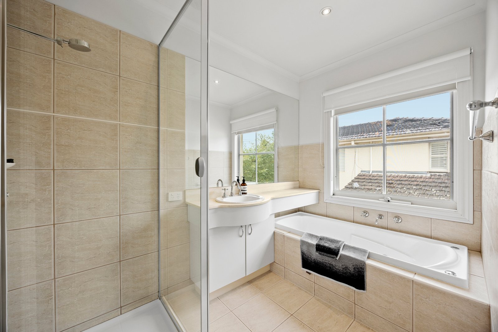 Distinguished by its dual master suite options hosted across both levels, the home also boasts sparkling bathrooms (one with tub), a guest powder room and ducted climate control.