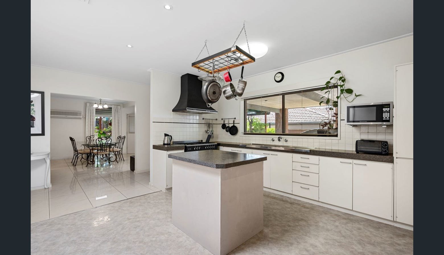 -Open plan large kitchen, with plenty of bench space, formal dining/meals area both complimented with polished porcelain tiles.