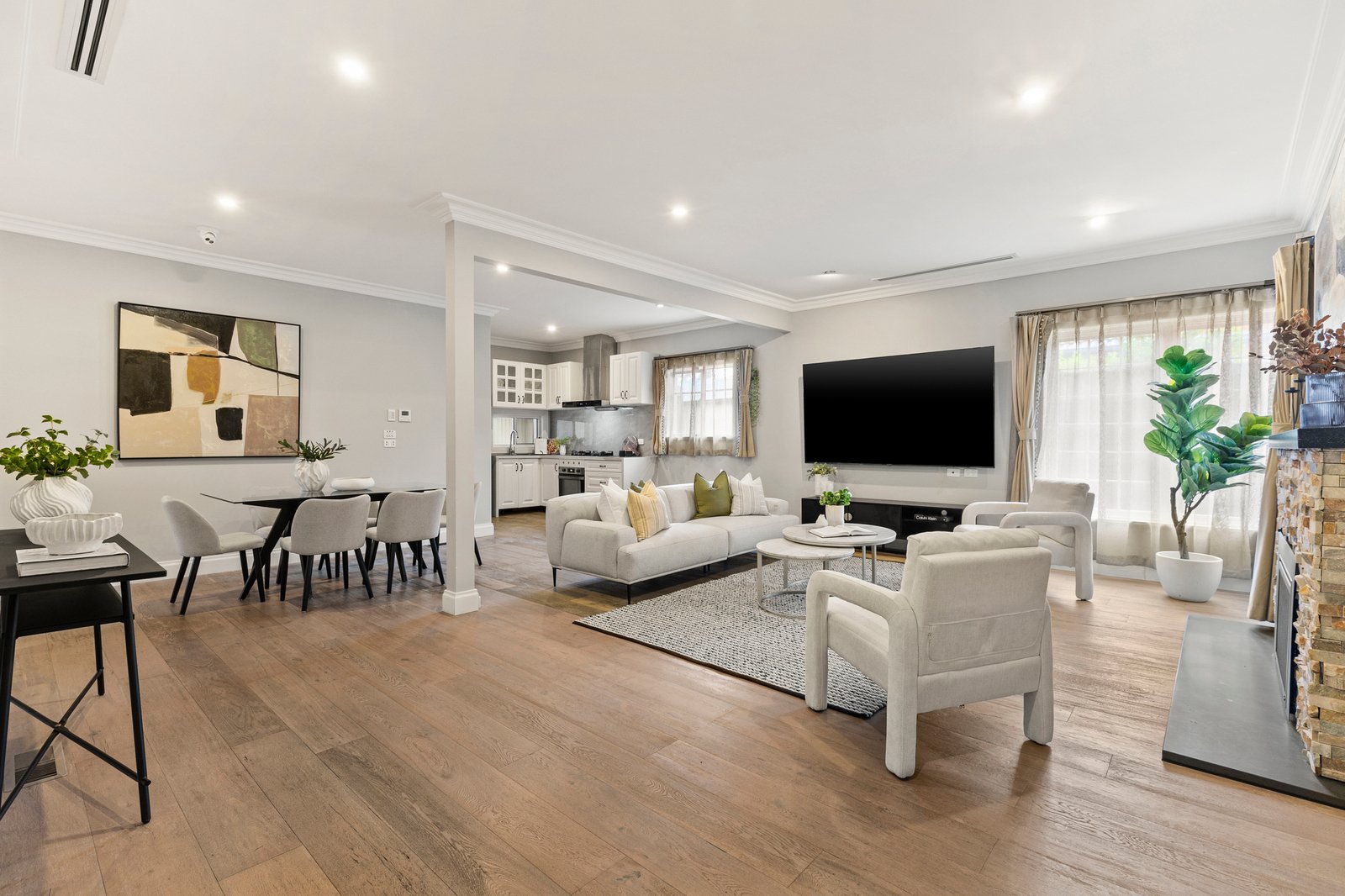 It delivers exceptional family accommodation with five generously sized bedrooms and timber floorboards throughout. The open plan living area connects seamlessly with the kitchen and dining zone, creating a practical and inviting space ideal for everyday living and entertaining. Comfort is assured year-round with central air-conditioning, while energy efficiency is enhanced by a 9,000-watt solar panel system.