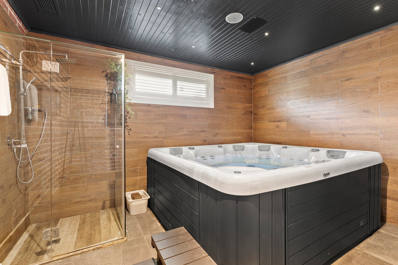 The main bedroom enjoys its own private ensuite, while a central bathroom services the remaining bedrooms. A dedicated spa room with jacuzzi provides a luxurious retreat for relaxation and wellbeing.