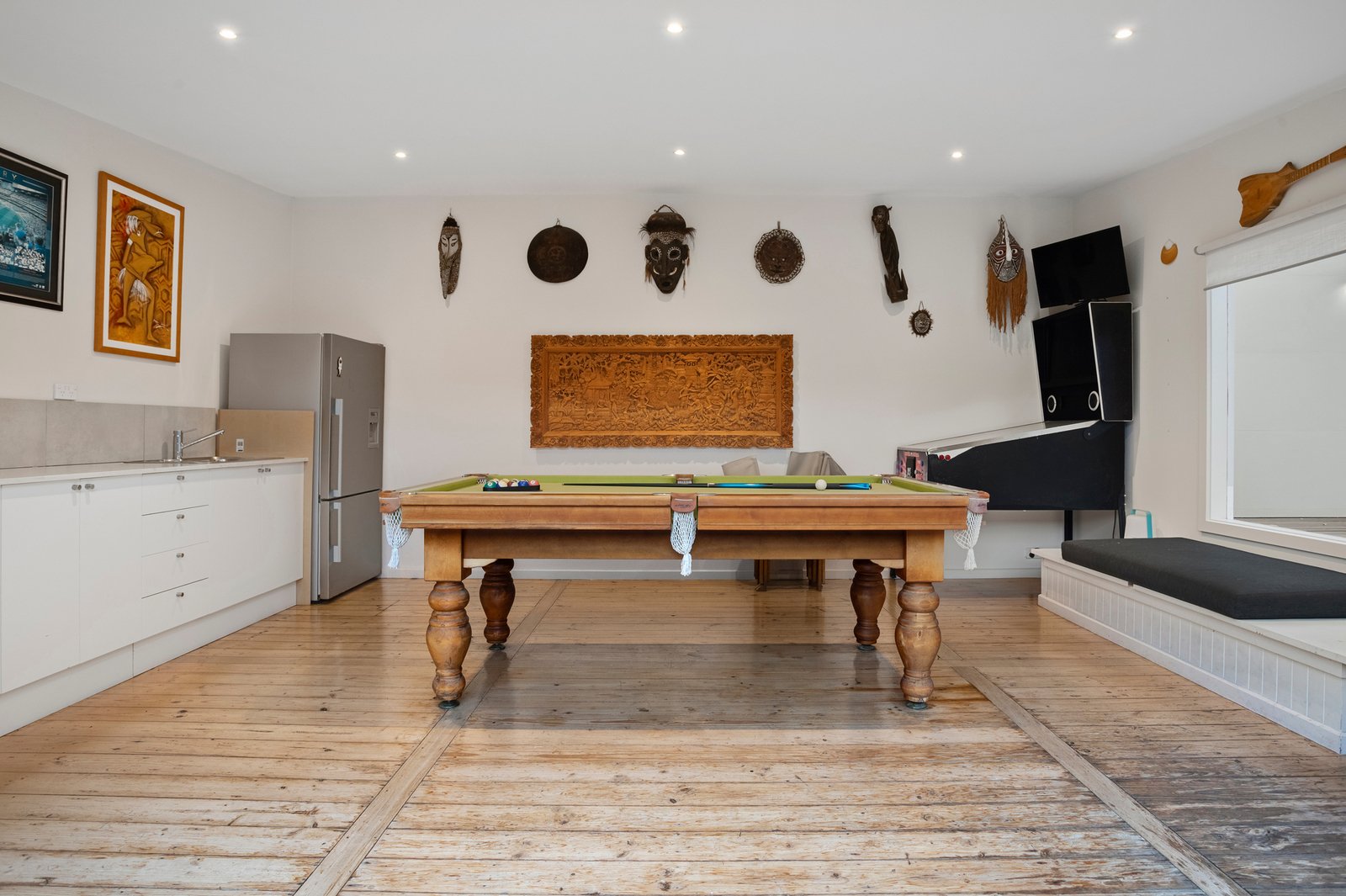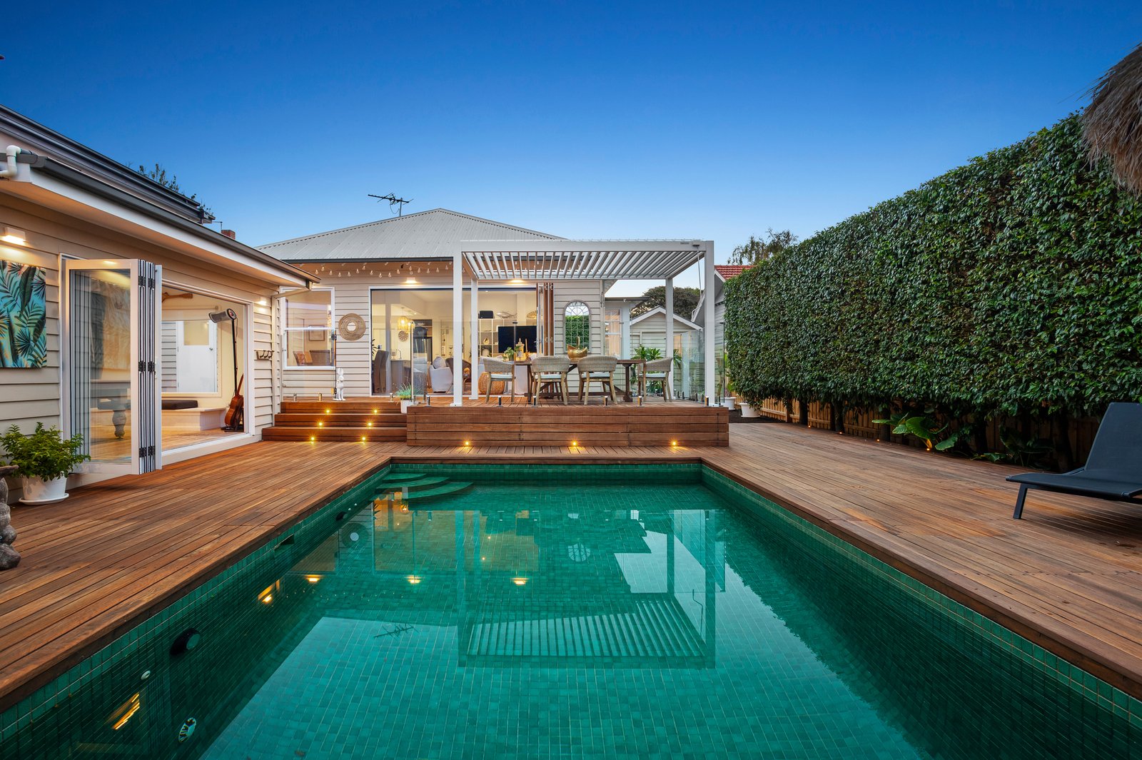 Outdoors, the home transforms into a private resort. Framed by mature hedging and drenched in northern sun, the poolside setting feels like a world of its own. Timber decking wraps the solar-heated tiled pool and cabana, while a vergola-shaded al fresco zone invites long lunches and twilight gatherings. Bi-fold doors blur the line between inside and out, linking the family domain and air-conditioned pool house with wet area to this blissful oasis for a holiday-at-home experience.