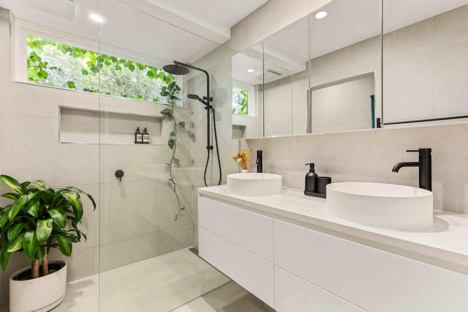 Generously proportioned bedrooms, two with extensive built-in robes, also offer the flexibility for a spacious home office if desired. The oversized main bedroom sits alongside a luxurious day-spa inspired bathroom framed by greenery, featuring large-format tiling, a stone-finished dual vanity with circular basins, a dual-head rain shower with storage niche, and a heated towel rail.