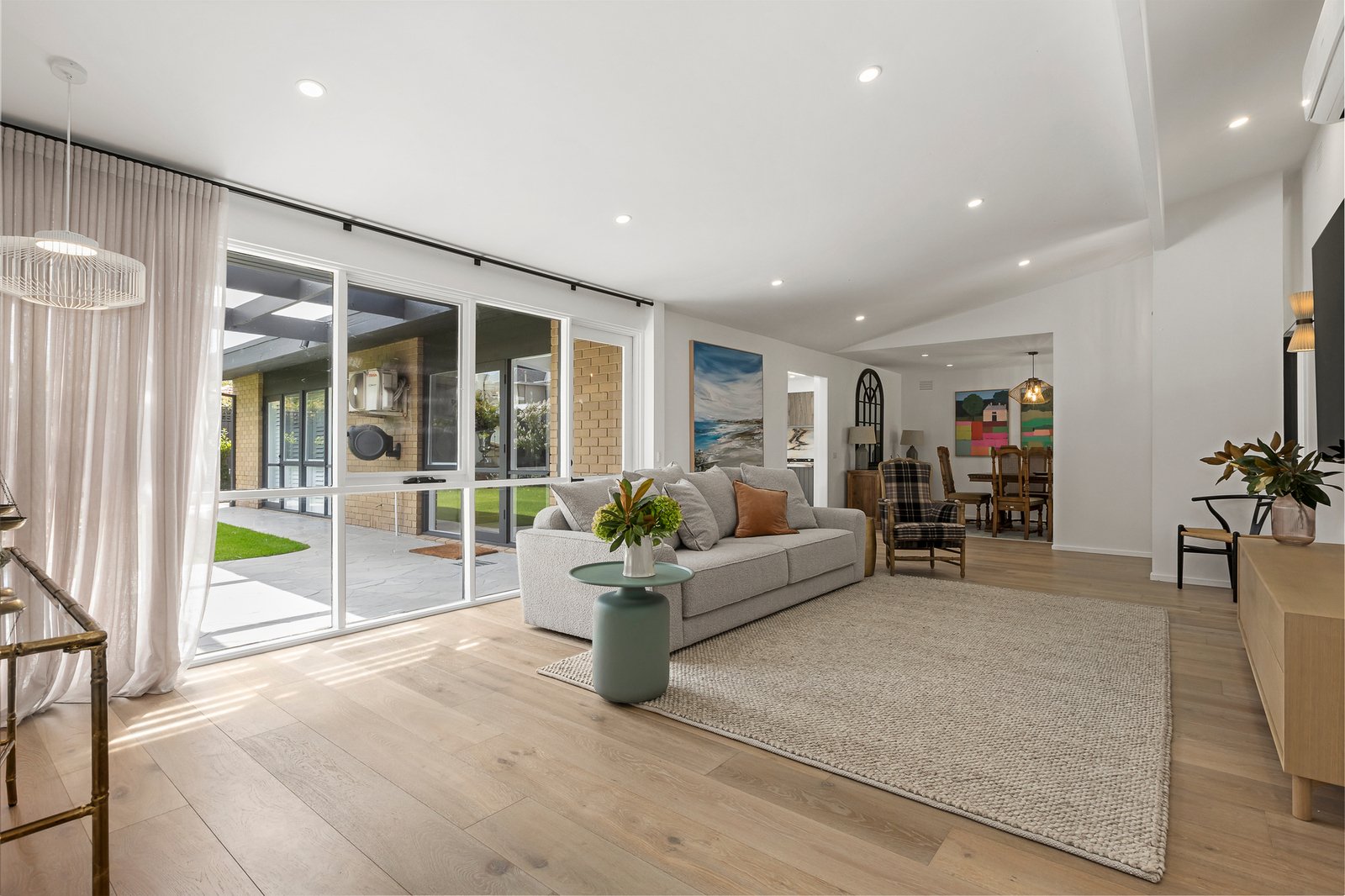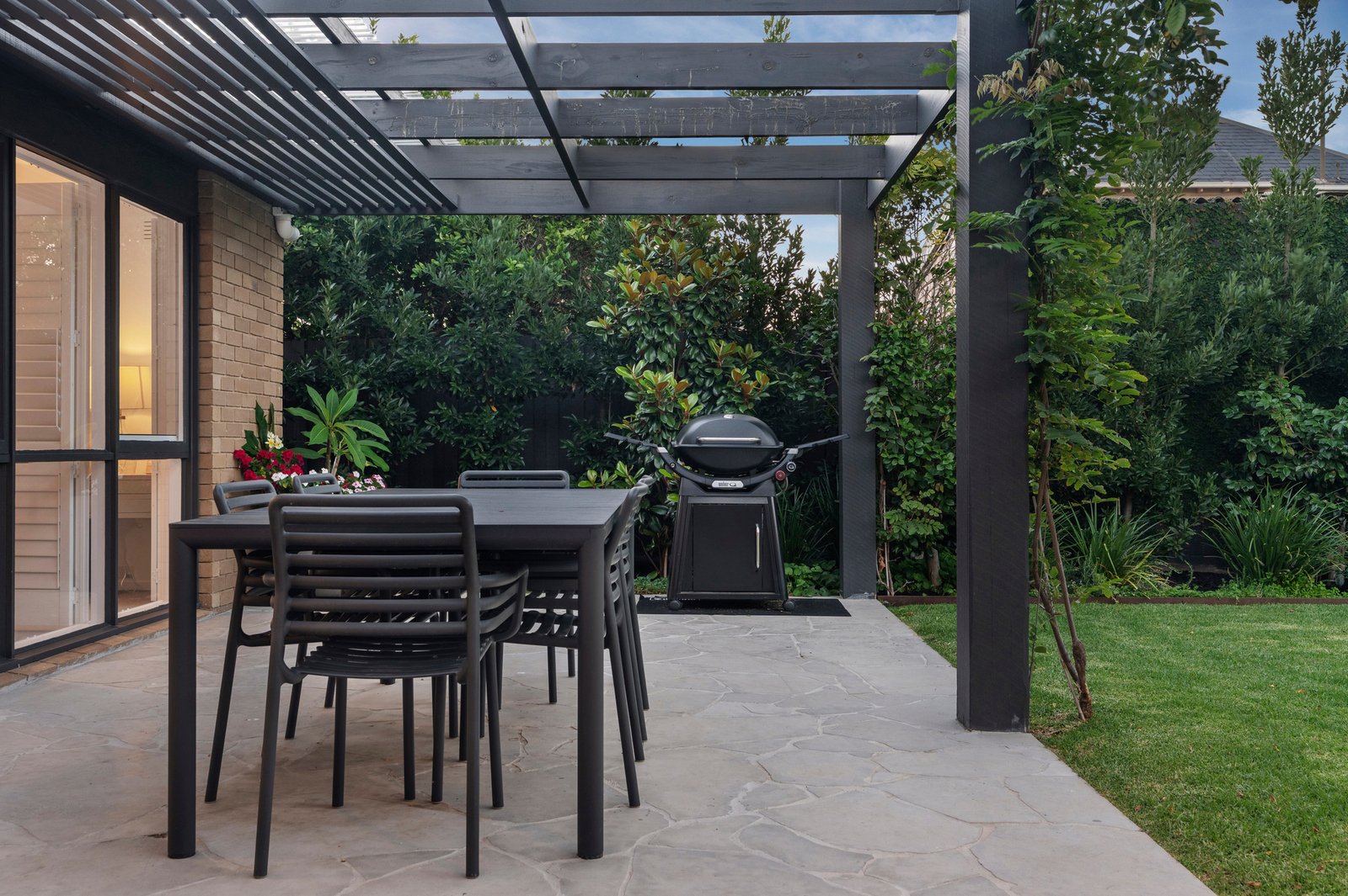 Privately set to the rear of a quiet group of only three, the home unfolds beneath high raked ceilings where expansive glazing draws the north-westerly sun deep into the interiors. Spacious living and dining zones complement an open-plan kitchen and meals hub with bespoke banquet seating creating an inviting breakfast nook. Outdoors, a substantial pergola-covered terrace and BBQ area extend the living domain, overlooking private, sun-soaked lawns framed by established greenery.