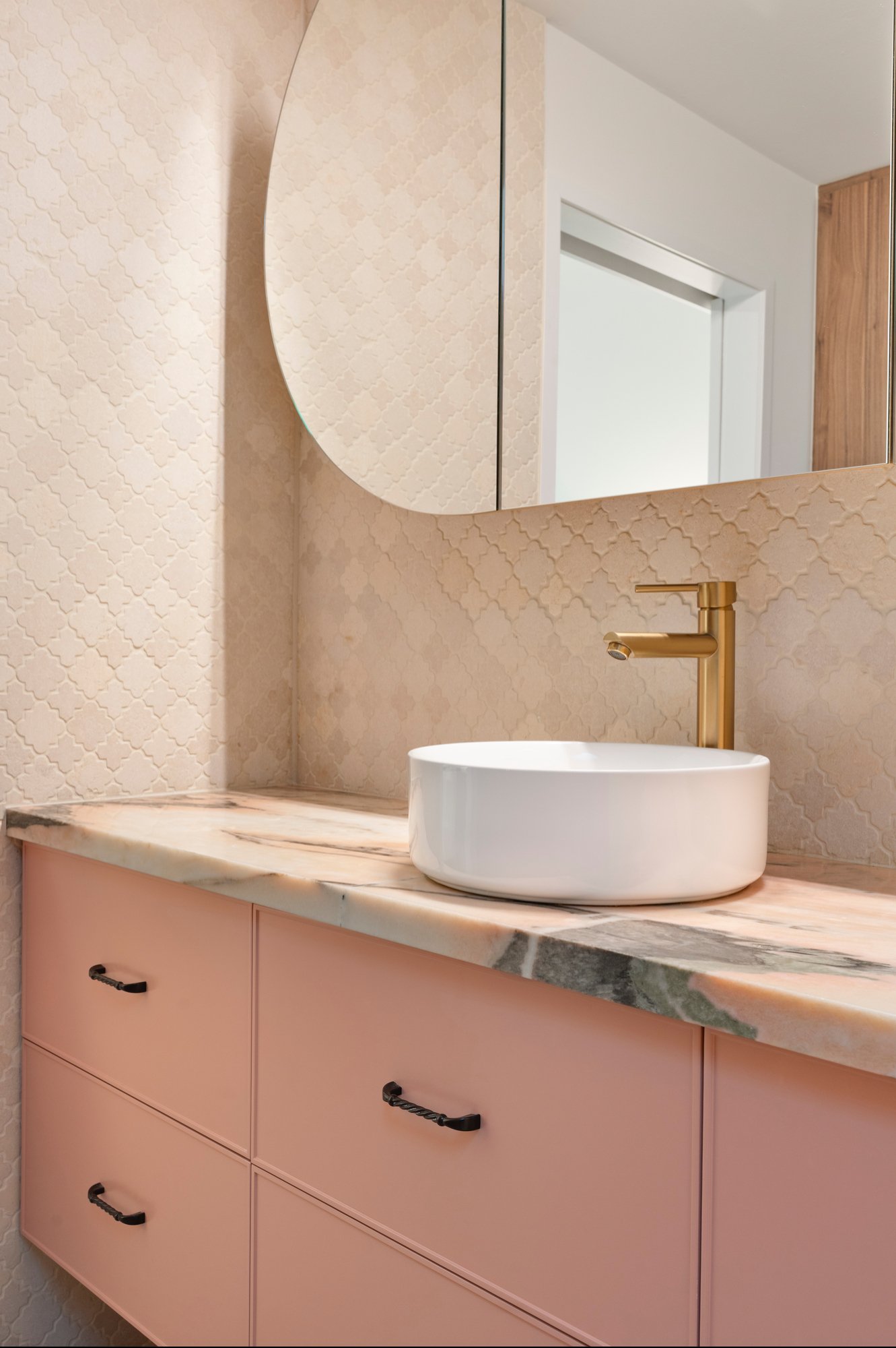 Wet areas are equally impressive in this three-bedroom, two-bathroom residence. The kitchen is a culinary showpiece, defined by sweeping marble surfaces, European appliances including a gas cooktop, oven and dishwasher, and stylish VJ-panel detailing. The laundry continues the calibre with finger-tiled splashback and custom cabinetry, while bathrooms deliver a sophisticated statement, showcasing terrazzo tiling, brushed brass tapware and bespoke joinery.