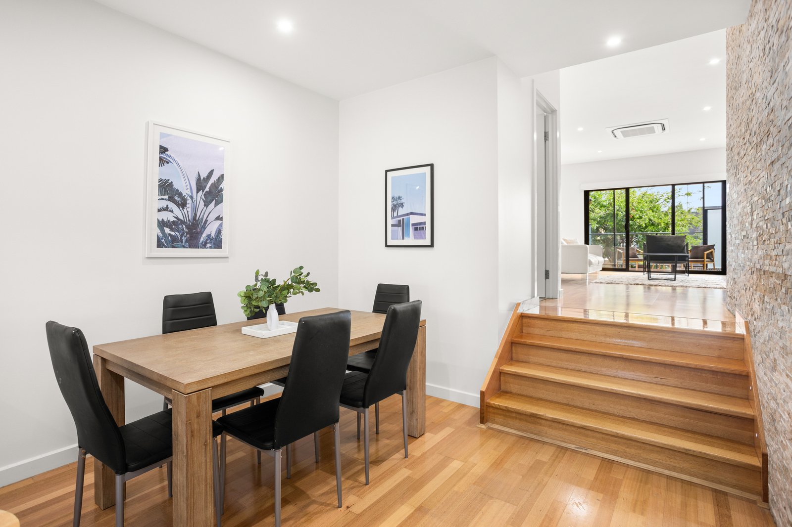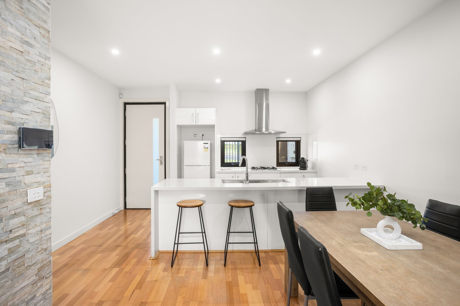 Anchored by a striking stack stone wall that reveals the home’s staircase, the well zoned bedroom accommodation includes a crowning master suite with a terrace from which to enjoy an expansive skyline vista as well as two further bedrooms paired with a bathroom with tub. A double garage with direct access, ducted climate control and video intercom entry complete this parcel of ease.
