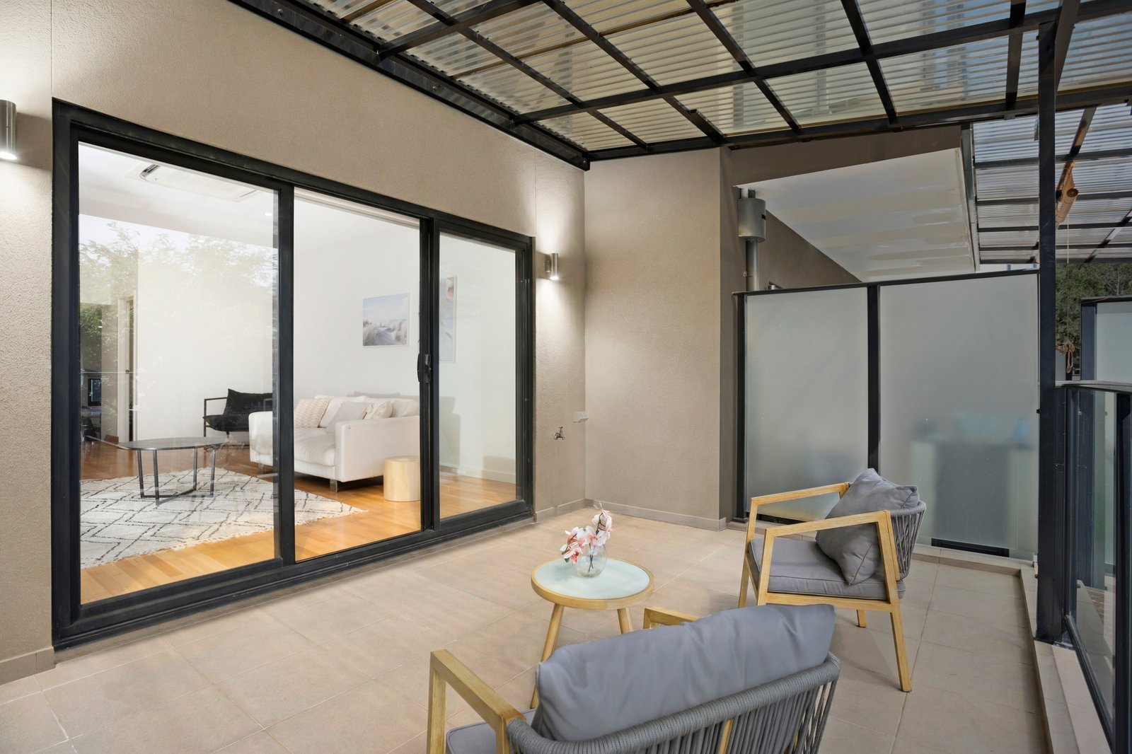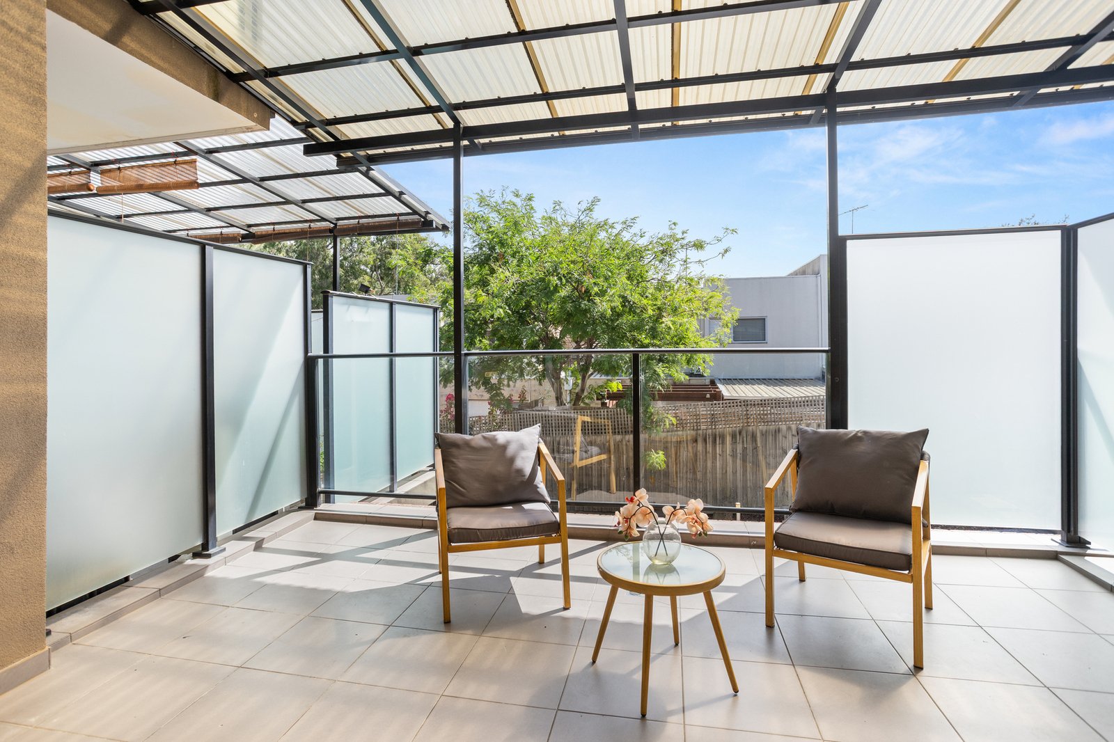 Welcomed by its own gated street frontage, the home boasts a stone kitchen with gas cooking and dishwasher overlooking a dining room that flows through to a spacious lounge room. A wall of glazing opens wide onto the deep terrace providing a lovely fresh air extension of the living zone.