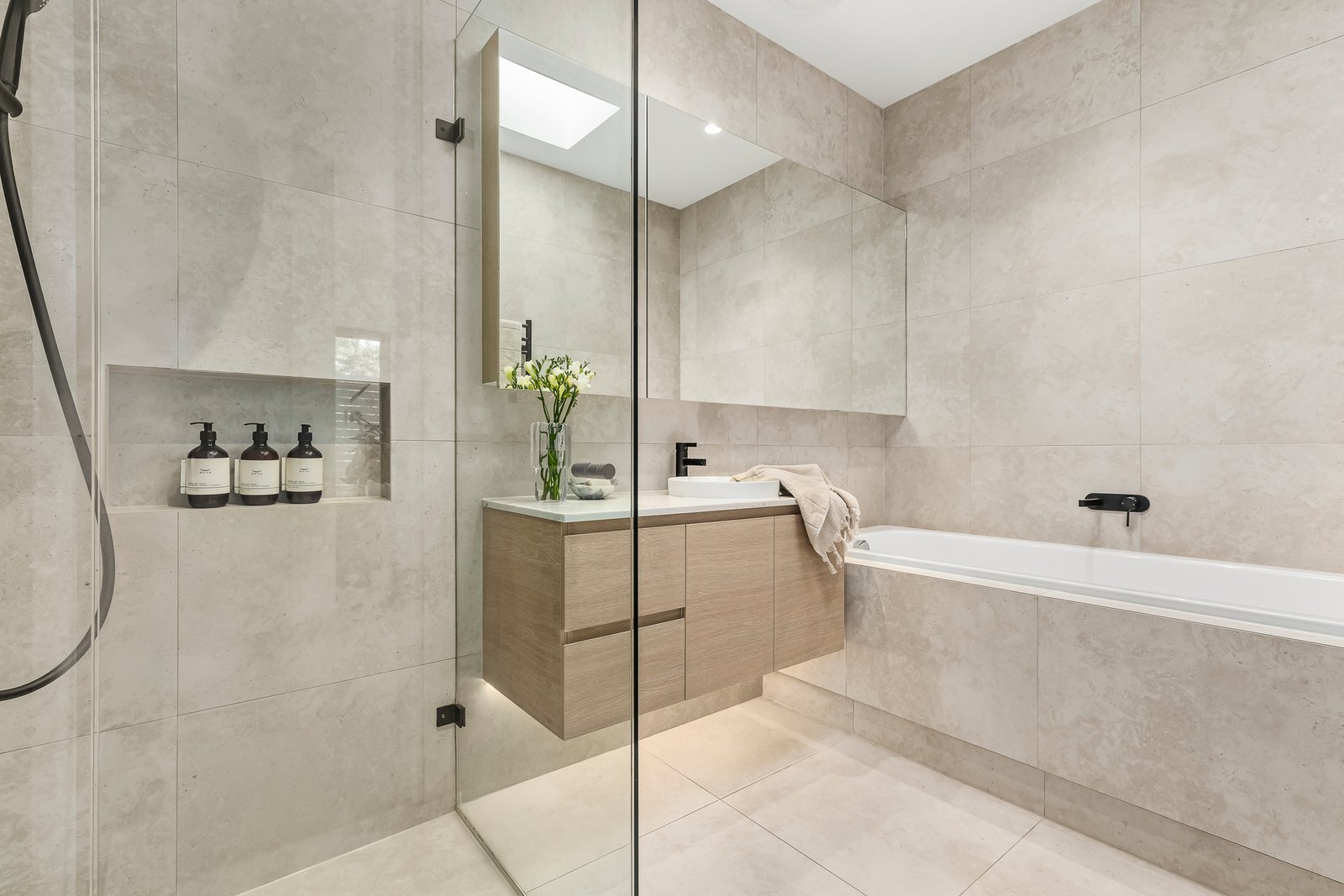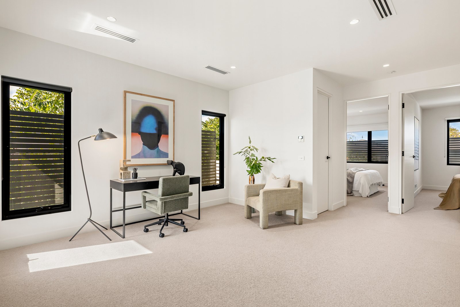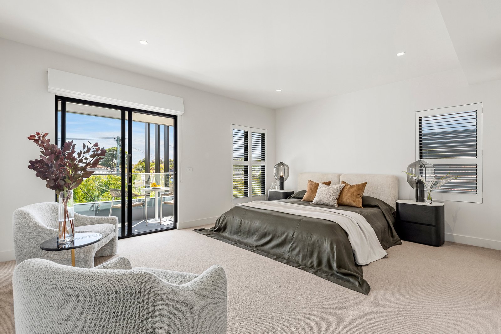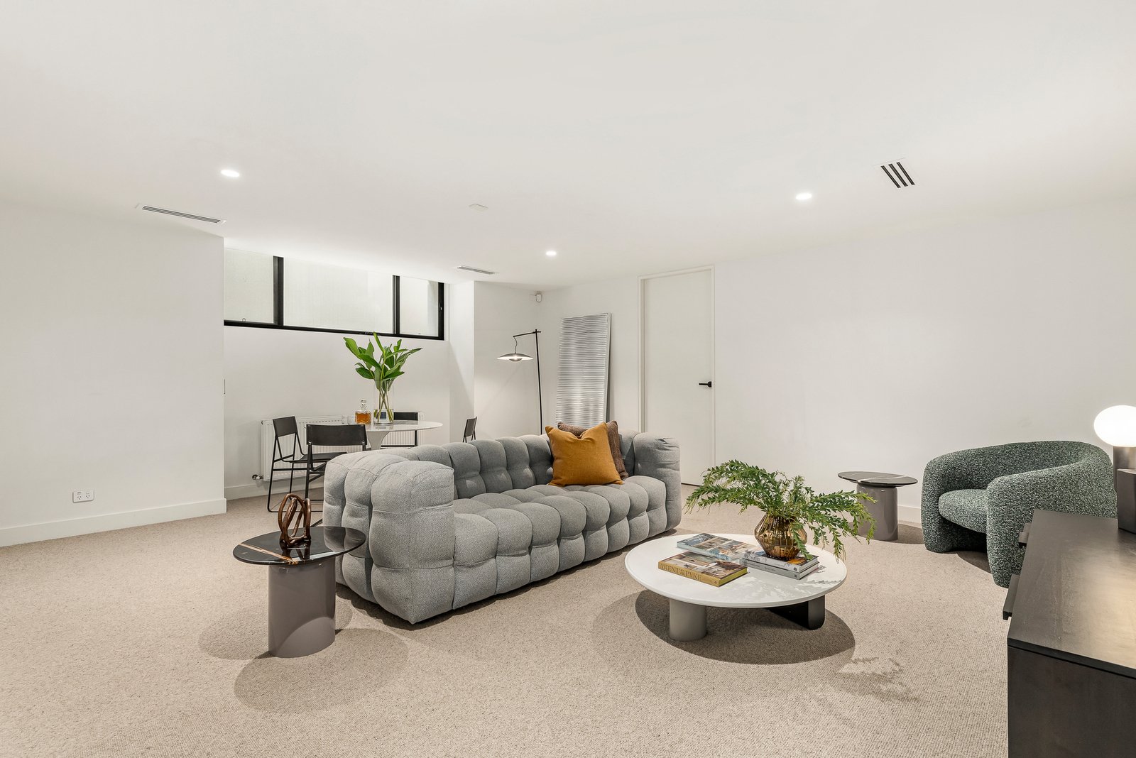 The upper level is headlined by a luxurious main suite, opening to a private terrace where sunsets stretch across the treetops of Brighton. A bespoke dressing room and dual-vanity ensuite with heated towel rail complete the retreat. A light-filled family lounge and study zone accompany two further robed bedrooms and a beautifully appointed central bathroom, ensuring exceptional accommodation for every stage of family life.