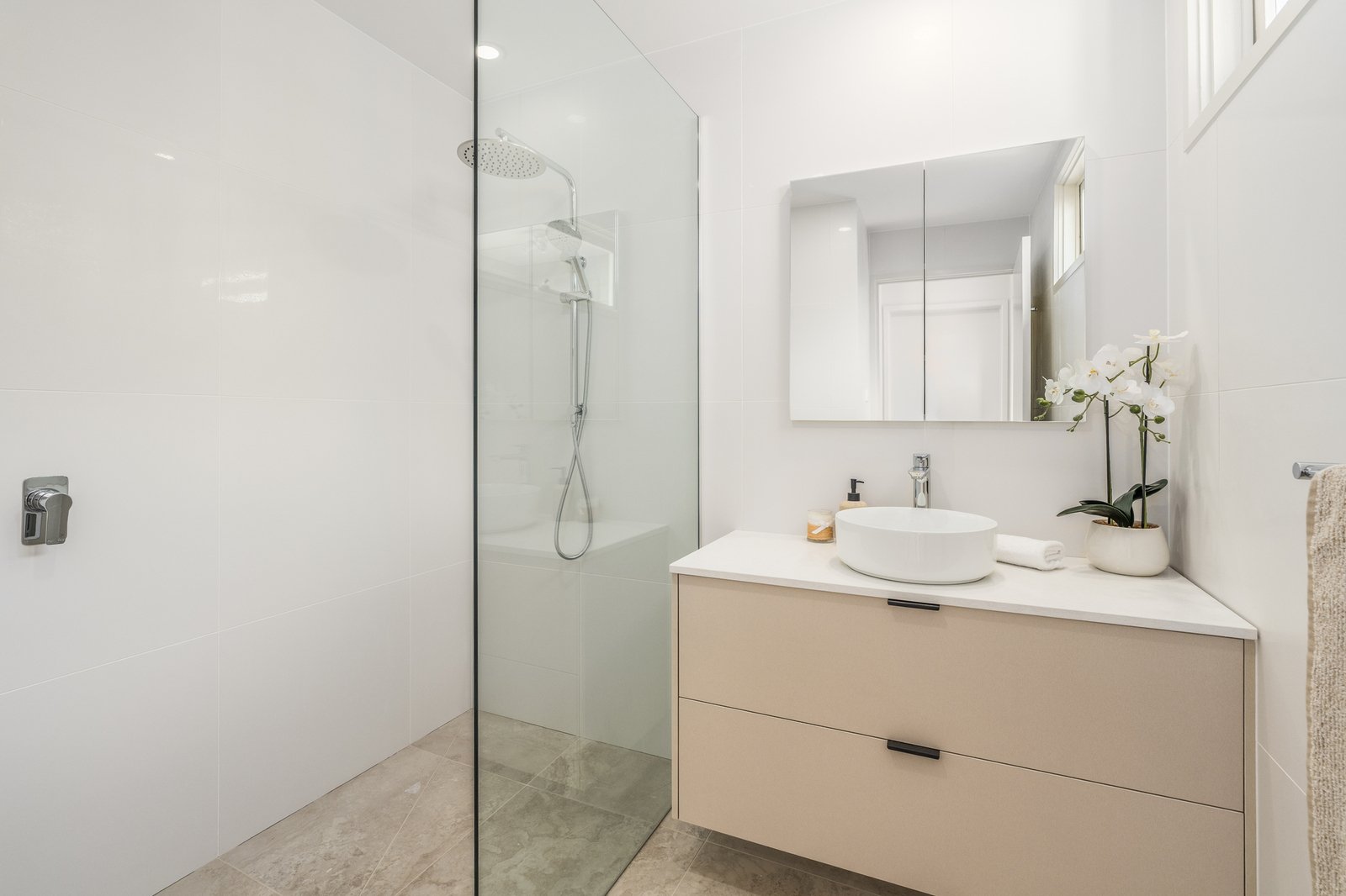 The spacious main bedroom features generous built-in robes, followed by two additional bedrooms, all serviced by a contemporary bathroom, luxuriously finished in floor-to-ceiling tiles, with a walk-in frameless shower, stone-topped vanity and mirror cabinet storage. A separate powder room and well-appointed laundry cater for everyday functionality.
