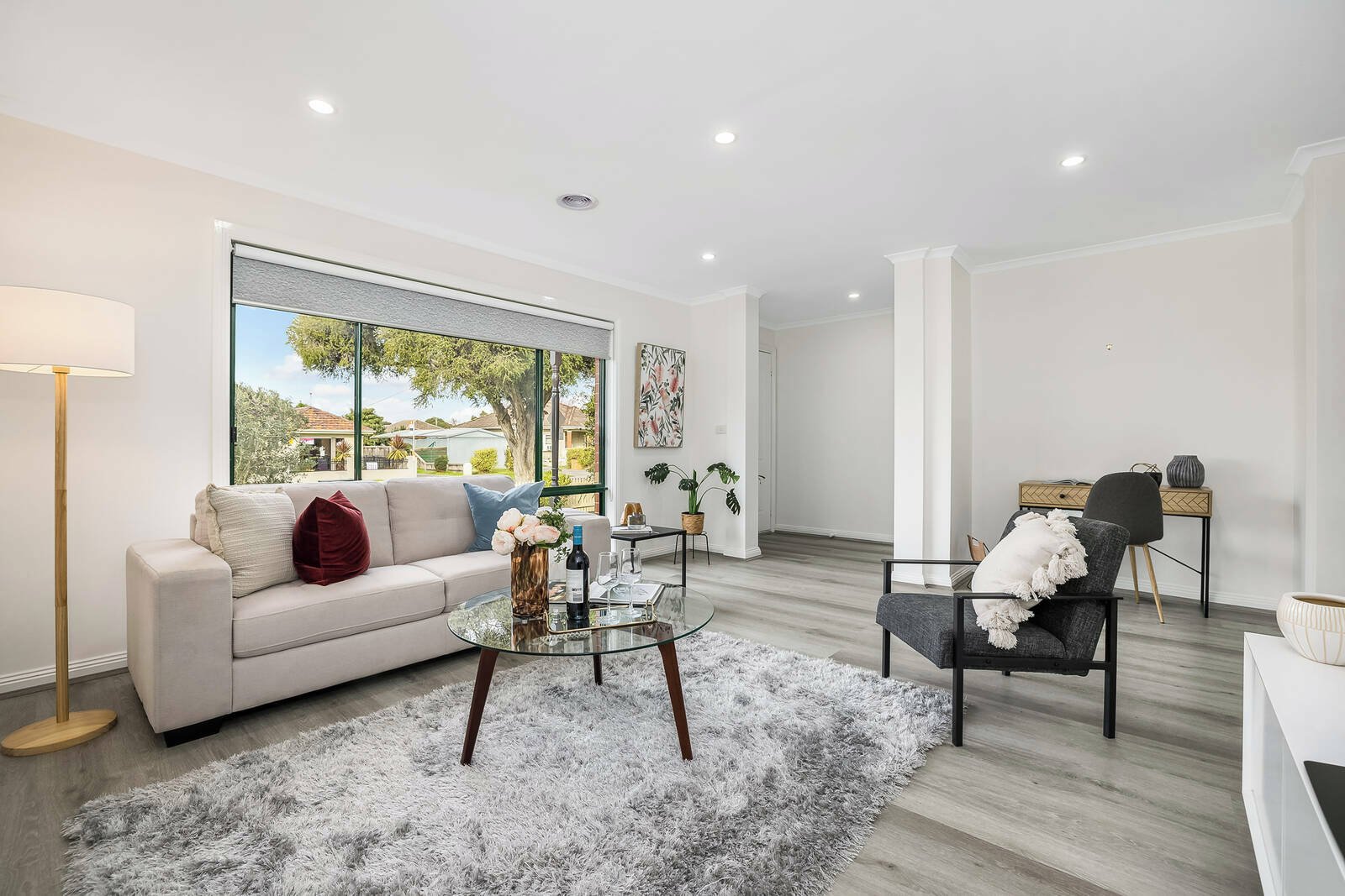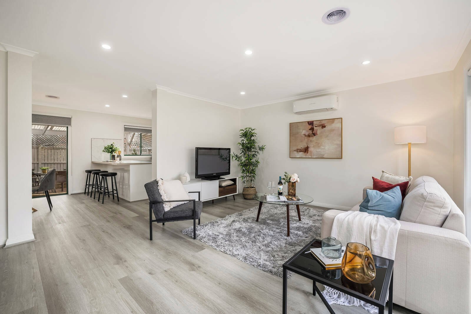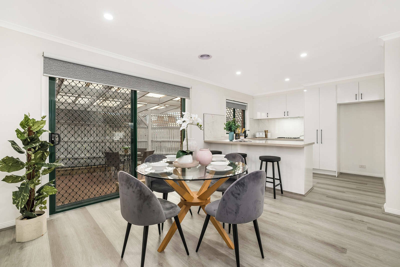 • Light-filled living and dining area with engineered flooring