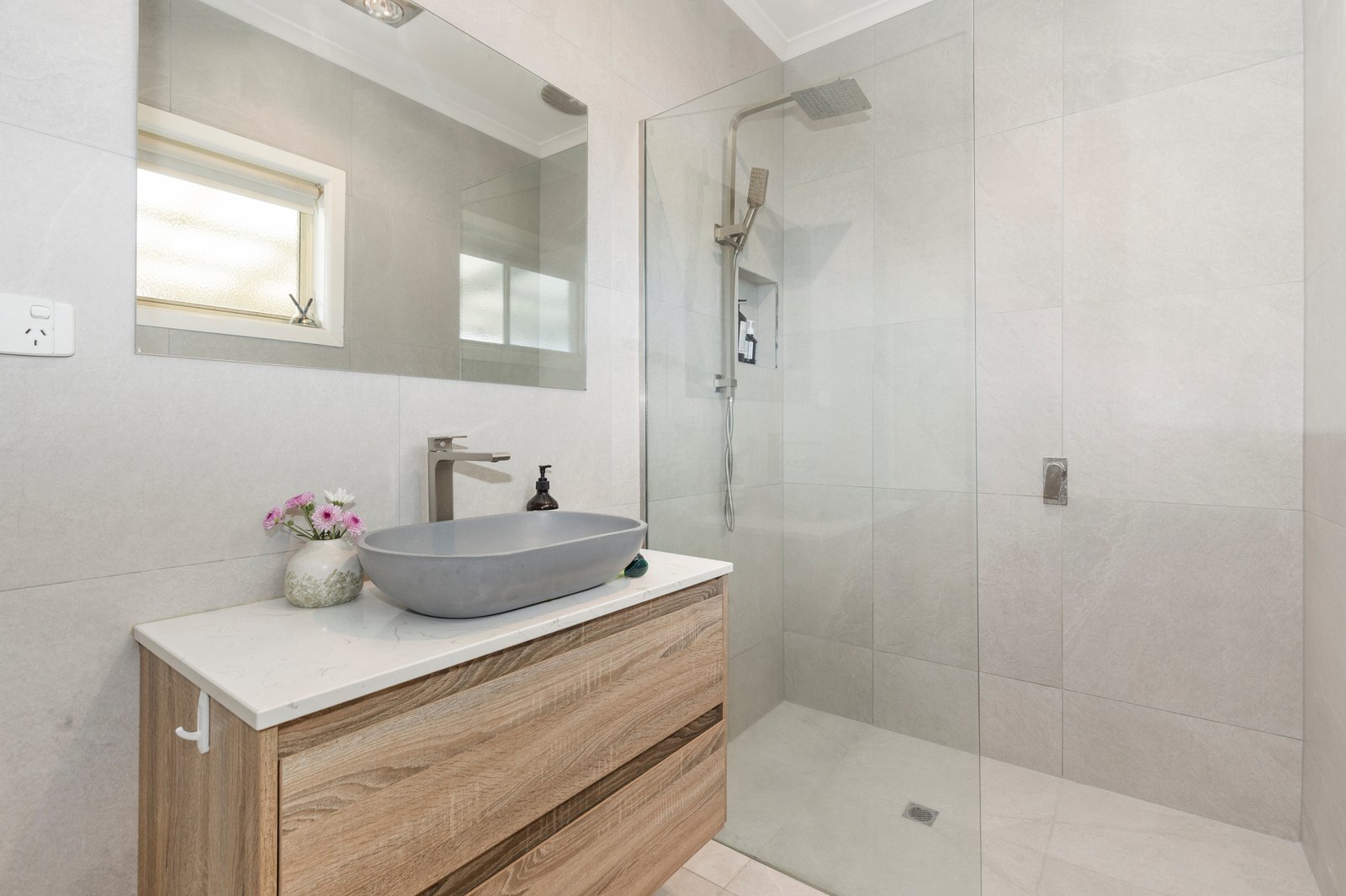 The floorplan comprises three bedrooms and two bathrooms, including a substantial master suite with mirrored walk-in robe and private ensuite. The remaining bedrooms are fitted with built-in robes and are serviced by a renovated and updated central bathroom with a clean, modern finish. A spacious open-plan living and dining area provides flexibility for everyday living and entertaining.