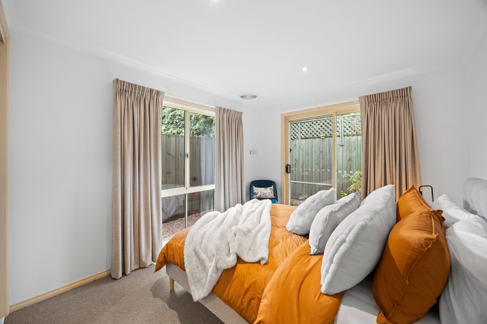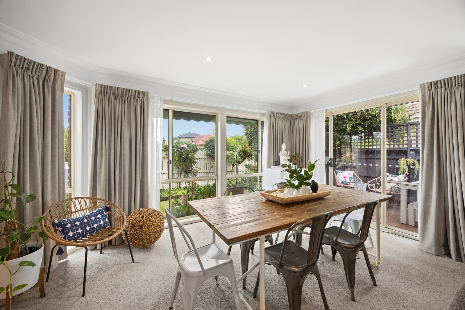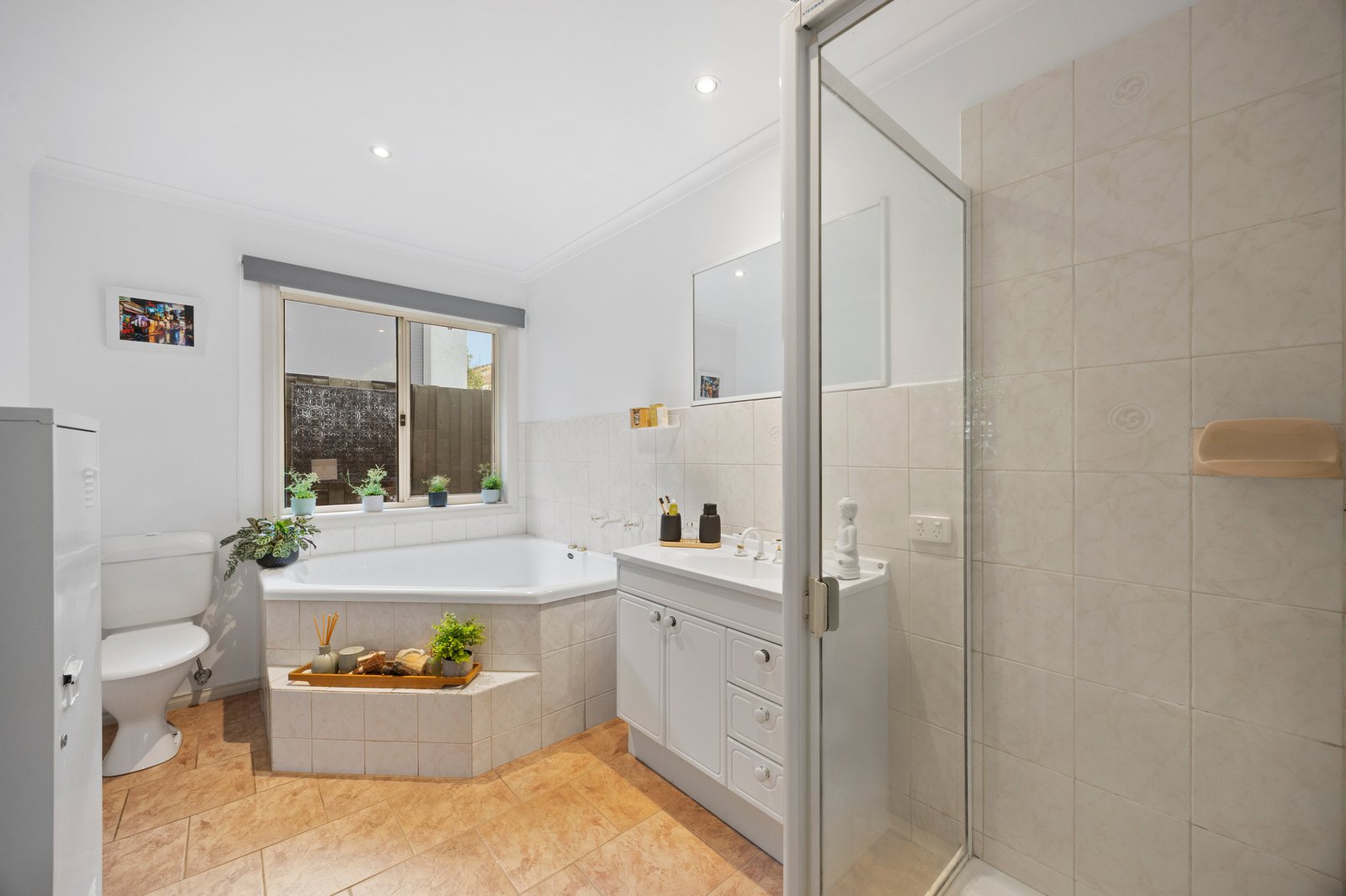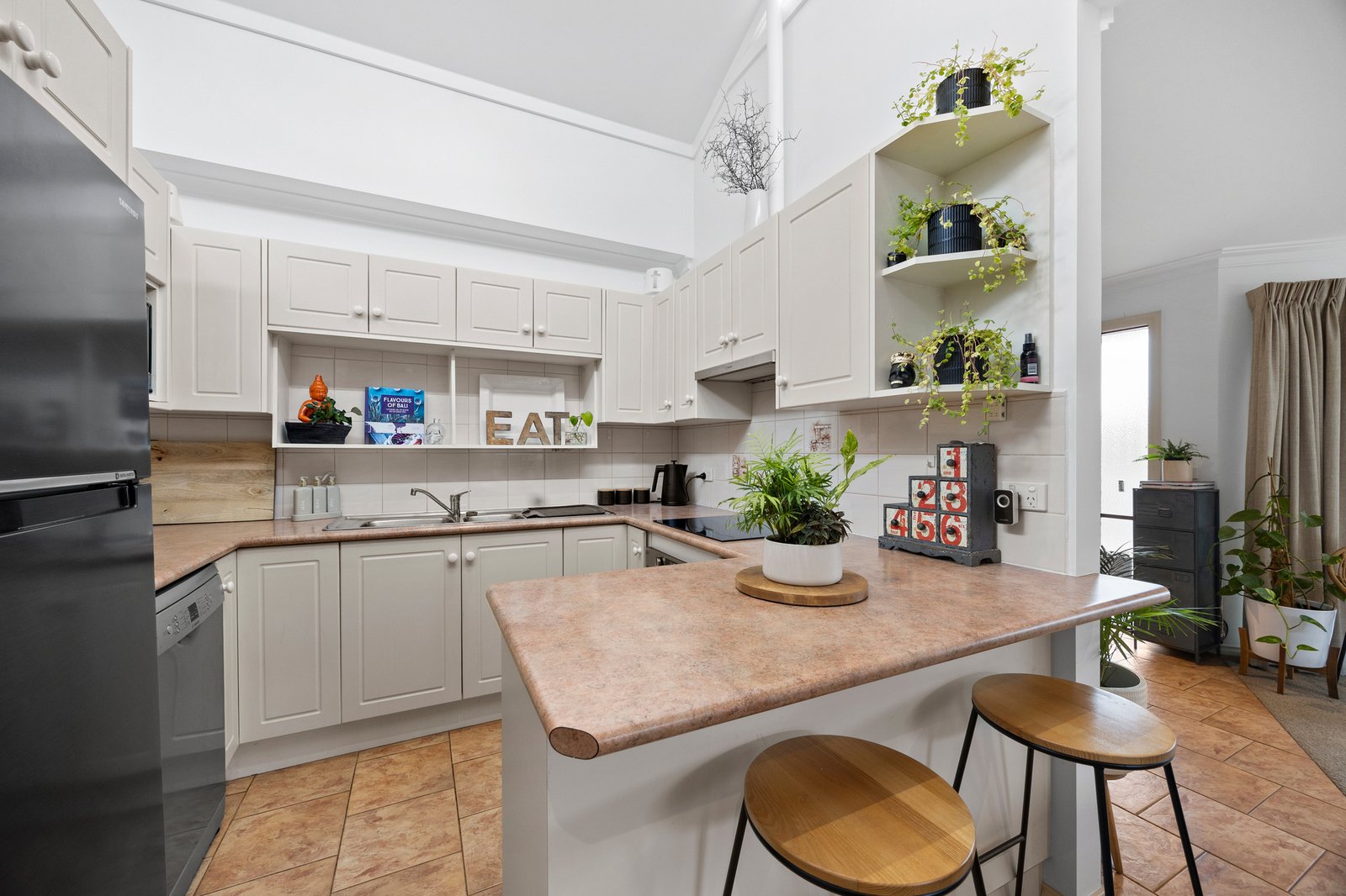 Filled with natural light and finished in timeless neutral tones, the carpeted open plan living and dining domain is complemented by split system air-conditioning and zoned under-floor heating for year-round comfort. The updated kitchen is both practical and stylish, featuring a dishwasher, electric cooktop and ample storage to keep everything neatly organised.