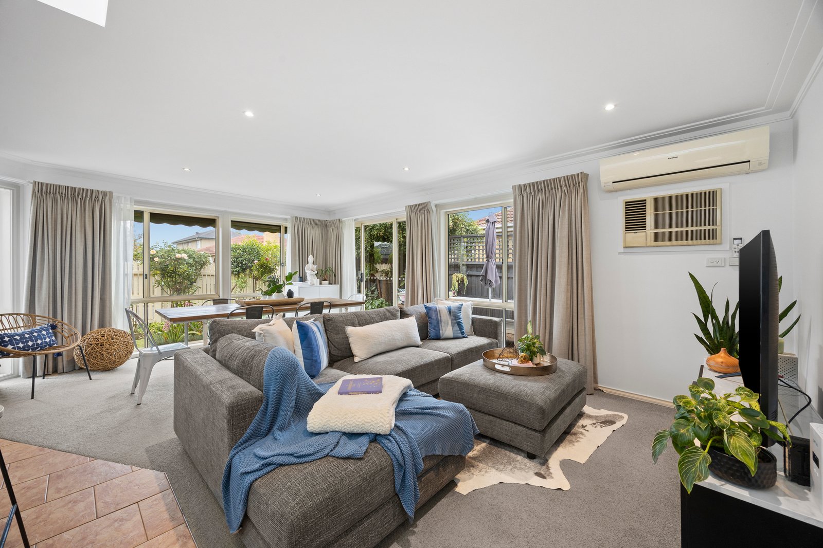 Filled with natural light and finished in timeless neutral tones, the carpeted open plan living and dining domain is complemented by split system air-conditioning and zoned...