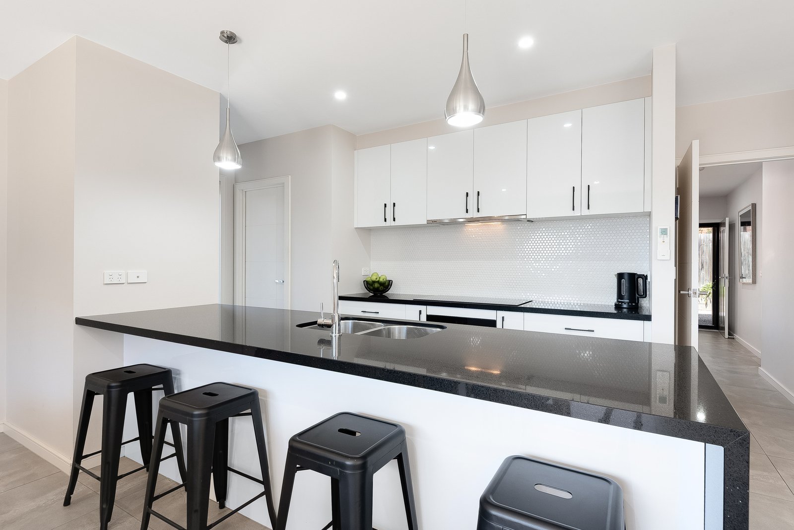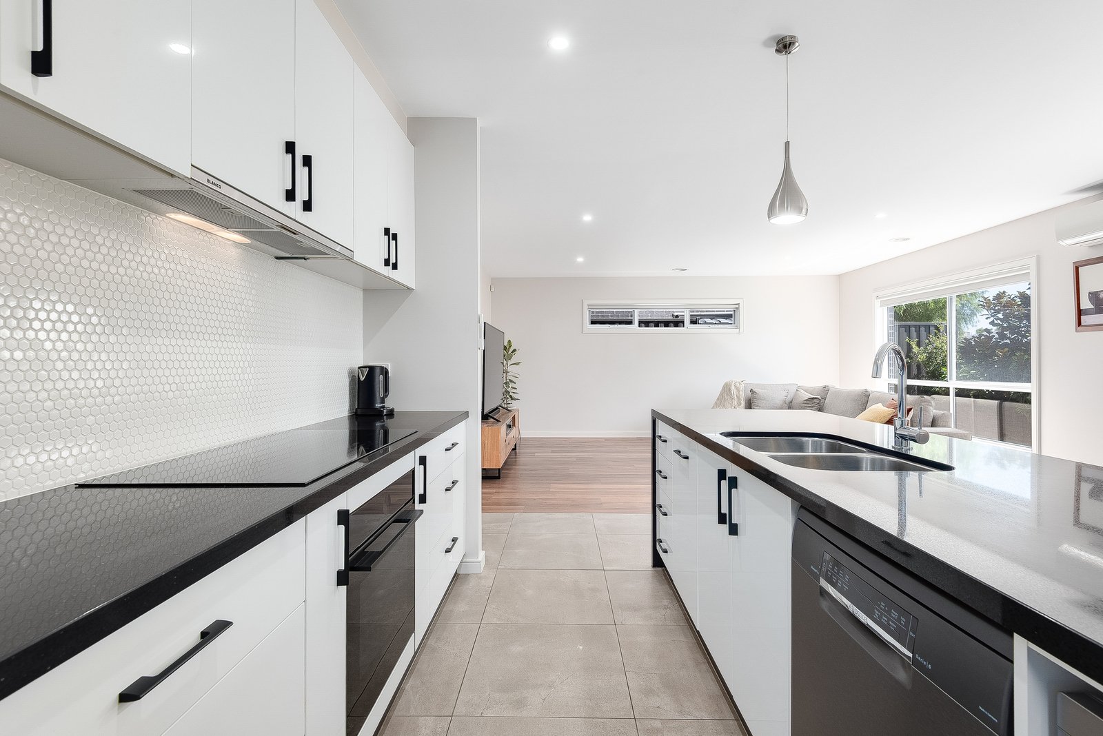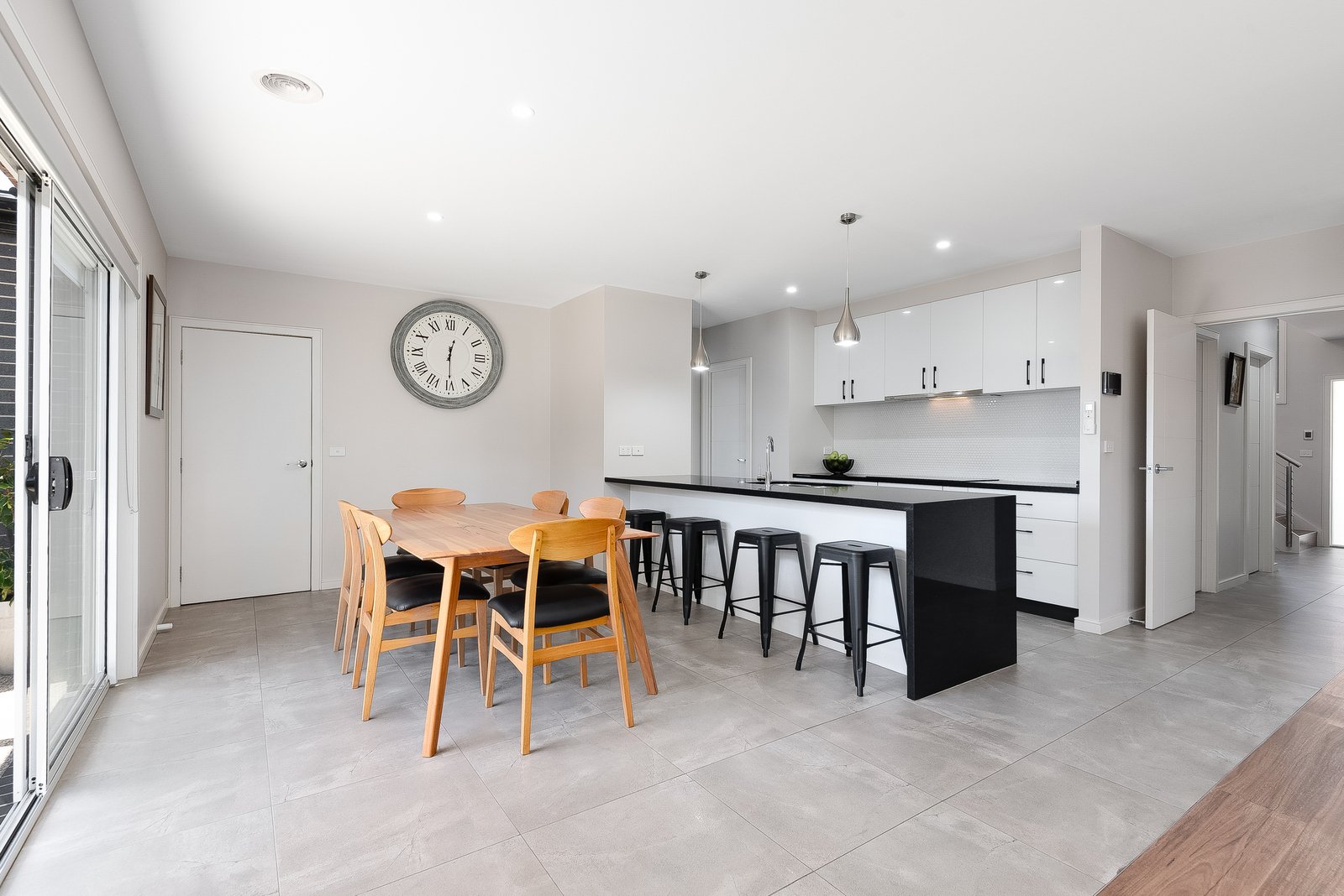 Set back from the road, the home enjoys a private and secluded setting. Stepping inside, the entry showcases contemporary interiors, square set ceilings, and a beautiful timber staircase with a light-filled void and statement pendant lighting. A central hallway guides you through the ground floor, revealing a spacious open plan kitchen, dining and living area connecting with the rear courtyard for seamless indoor-outdoor living and entertaining. The elegant kitchen features waterfall stone benchtops, quality appliances including a 600mm oven, 900mm induction cooktop, dishwasher, stunning penny-round tile splashback, modern pendant lighting, and endless storage with a large walk-in pantry.