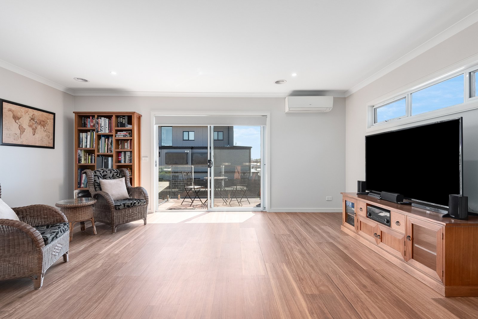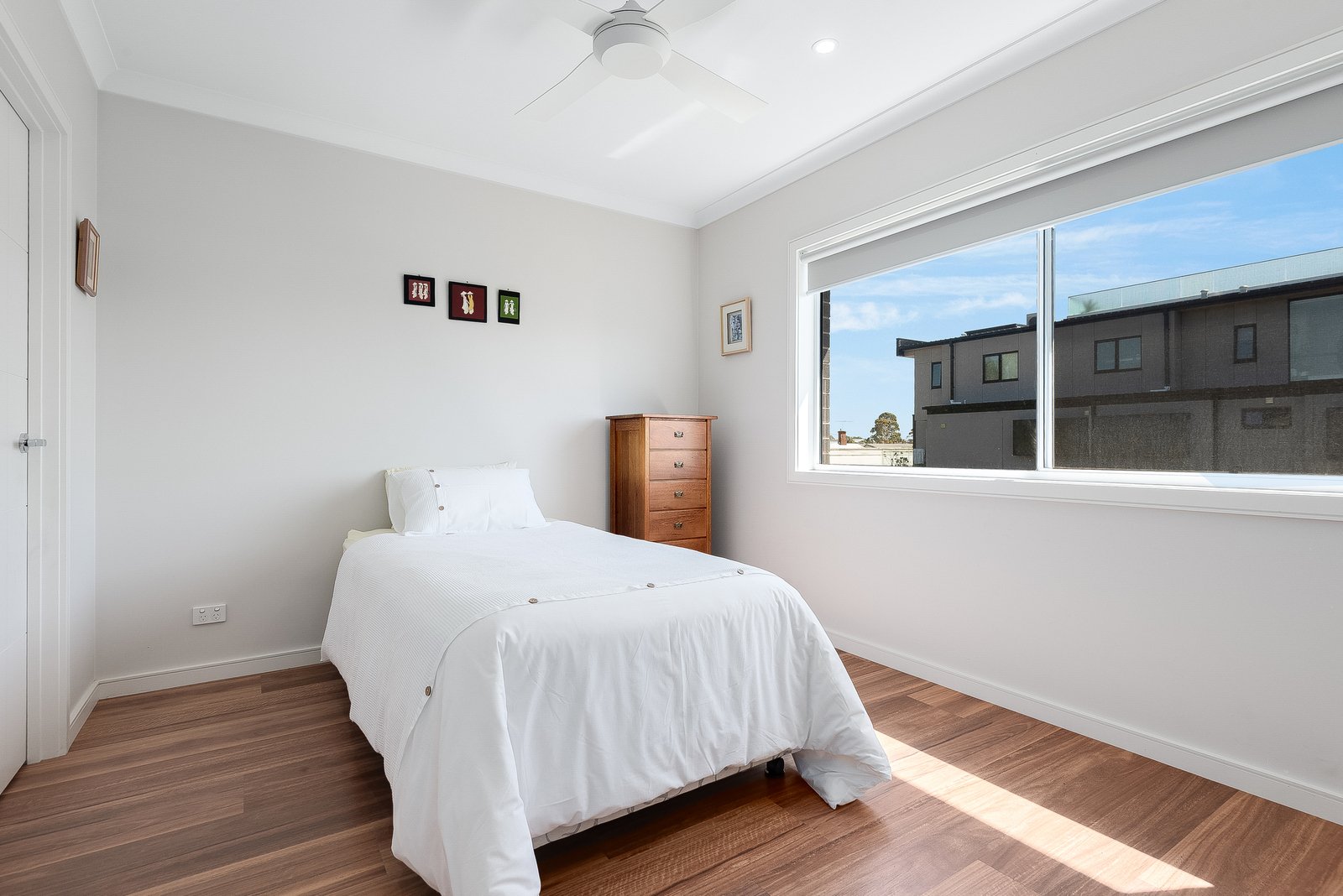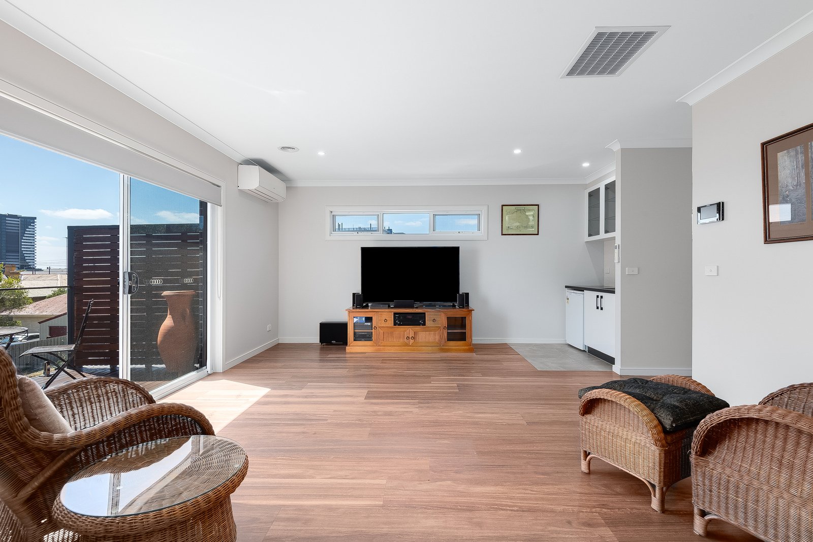 The ground floor main bedroom features walk-in robes and a tastefully presented ensuite finished in floor to ceiling tiles, with a frameless glass shower and dual shower heads. Upstairs, two additional bedrooms also include walk-in robes, serviced by a stylish bathroom with bath, separate shower, modern vanity and a separate wc. A spacious second living area on this level includes a kitchenette, ideal for making your morning coffee and stepping out onto the balcony to enjoy views of the surrounding skyline. An adjoining study nook provides a quiet space to work from home.