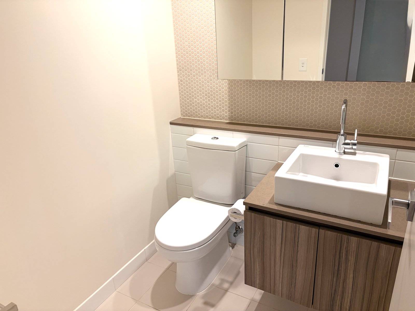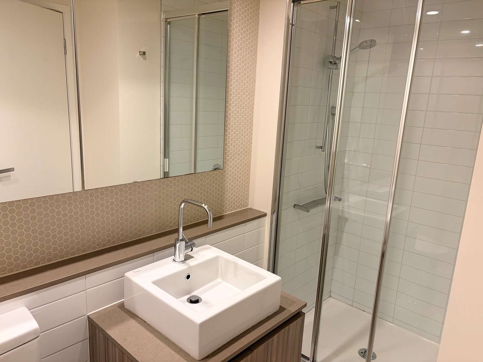 - Bathroom with vanity, mirrored storage, shower and toilet
