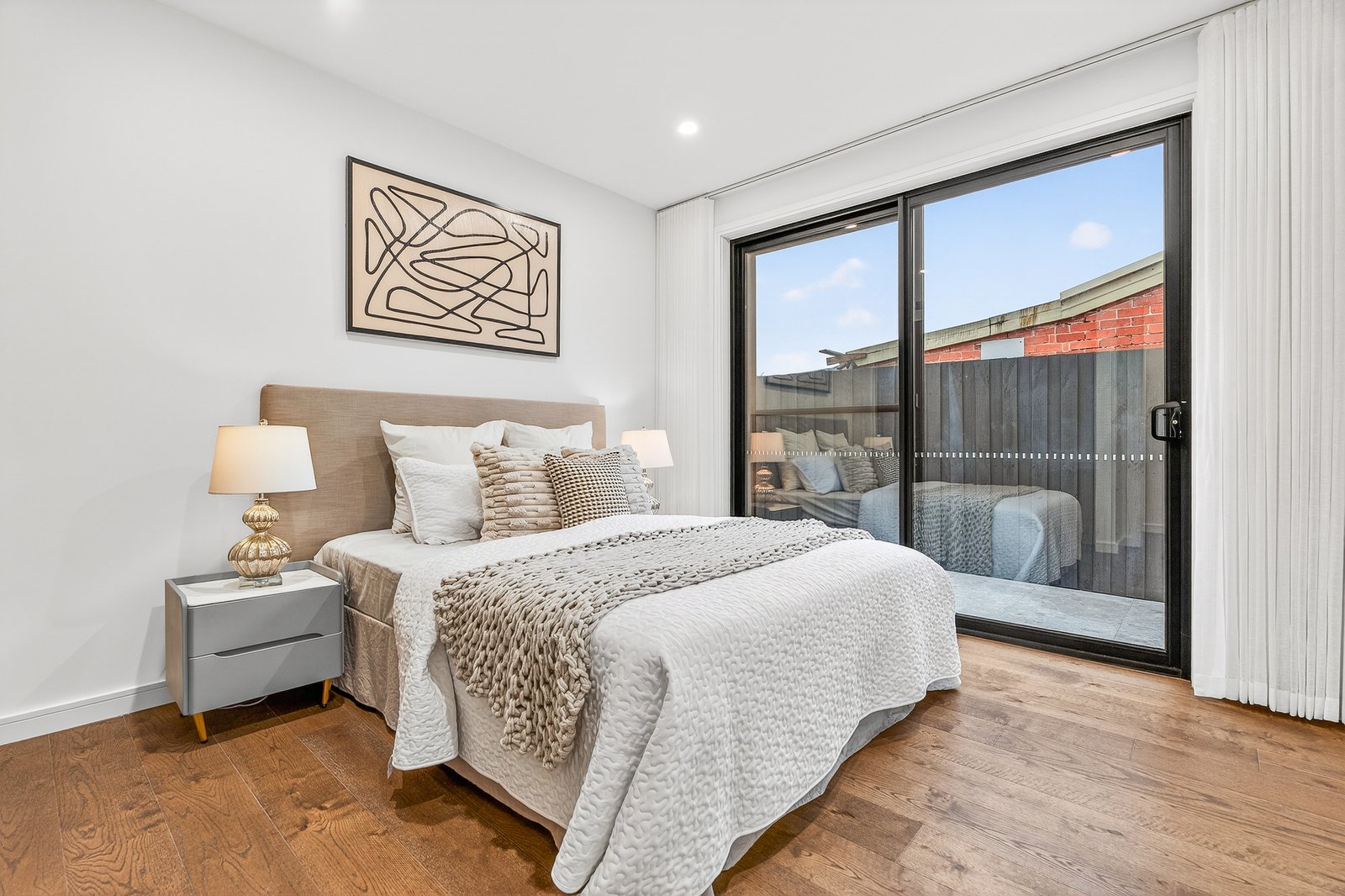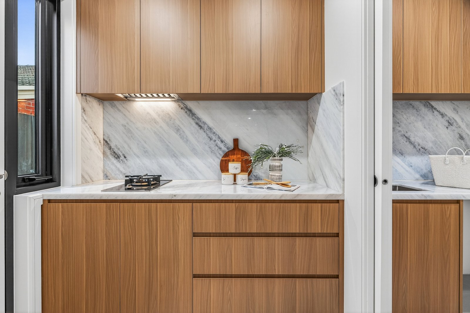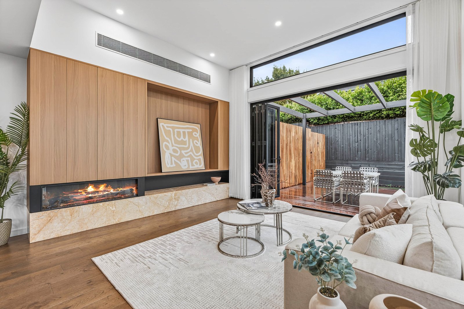 Styled to a demanding specification with Japanese Oak floors and natural stone benchtops and feature splashbacks), the home is optioned up with custom cabinetry (including bespoke walk-behind robes and a vanity/desk area for the principal suite) and airy linen sheers on commercial double-glazing. With zoned climate-control supplemented by an eye-catching faux-fireplace and video-intercom security complemented by an alarm, there’s two-car parking including a generous auto-garage out front... and a very private garden to the rear sheltered by a ‘borrowed landscape’ of high hedging.
