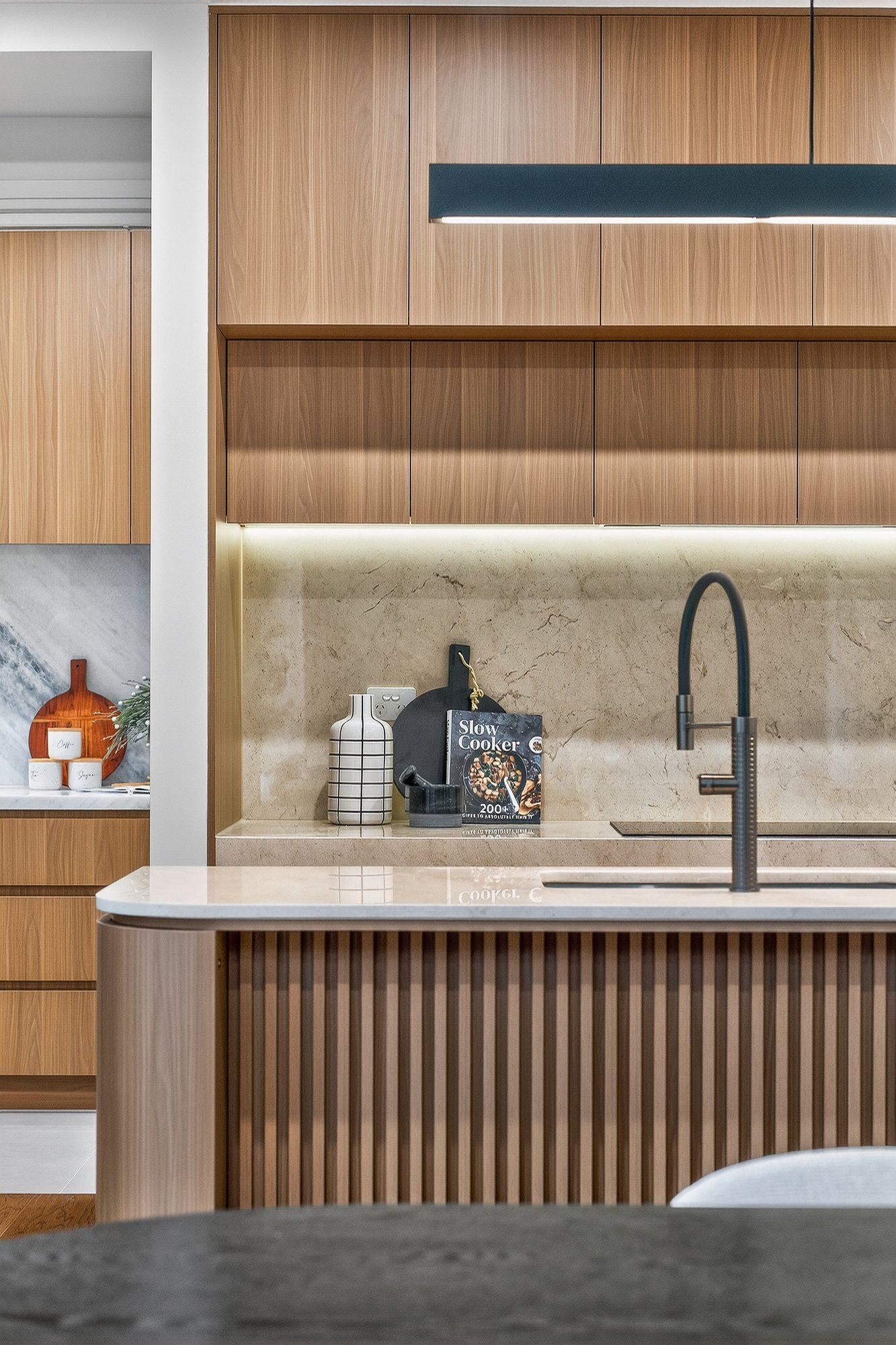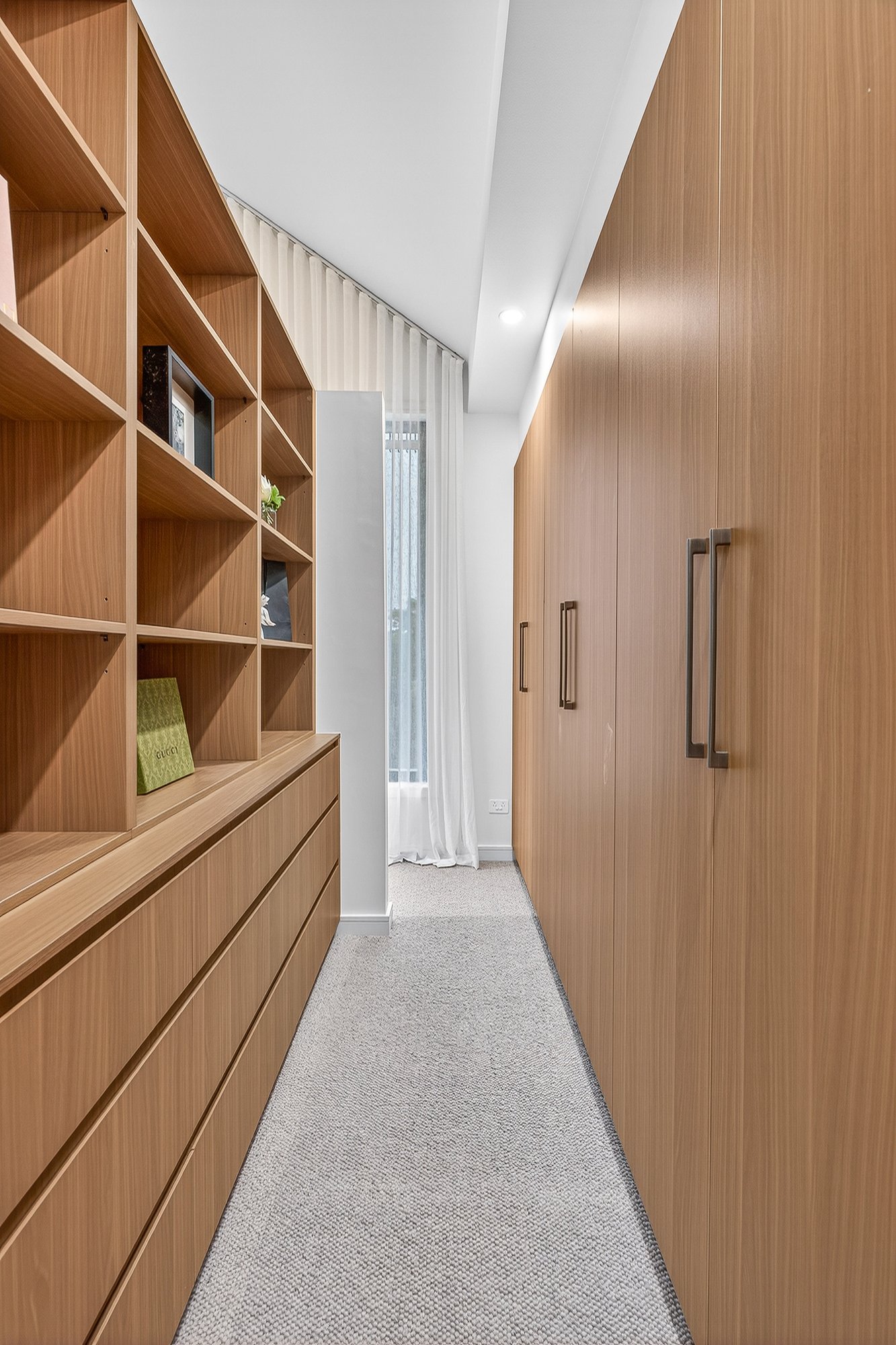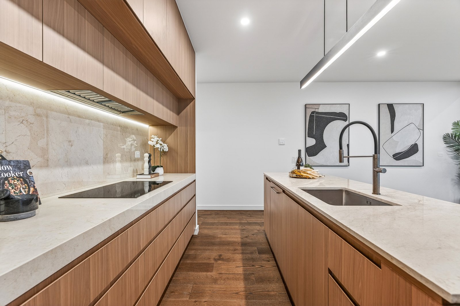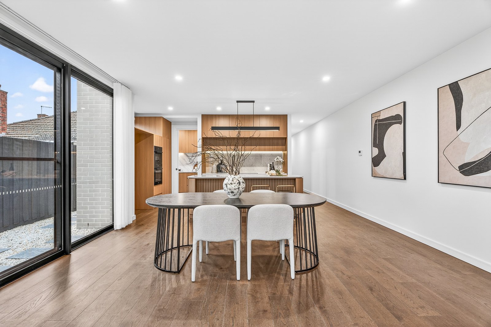 Styled to a demanding specification with Japanese Oak floors and natural stone benchtops and feature splashbacks), the home is optioned up with custom cabinetry (including bespoke walk-behind robes and a vanity/desk area for the principal suite) and airy linen sheers on commercial double-glazing. With zoned climate-control supplemented by an eye-catching faux-fireplace and video-intercom security complemented by an alarm, there’s two-car parking including a generous auto-garage out front... and a very private garden to the rear sheltered by a ‘borrowed landscape’ of high hedging.