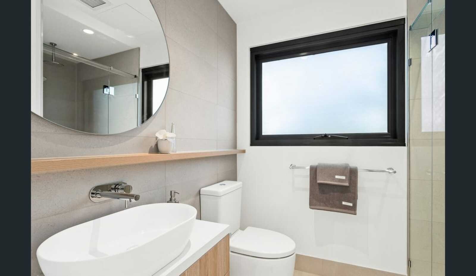Overlooking the living and dining spaces, the gourmet kitchen is an entertainer’s dream, featuring premium Bosch appliances including an induction cooktop and an electric oven, plus an integrated dishwasher and Samsung fridge/freezer. Caesarstone benches and ample glossy white cabinetry elevate the space, making it both functional and beautiful