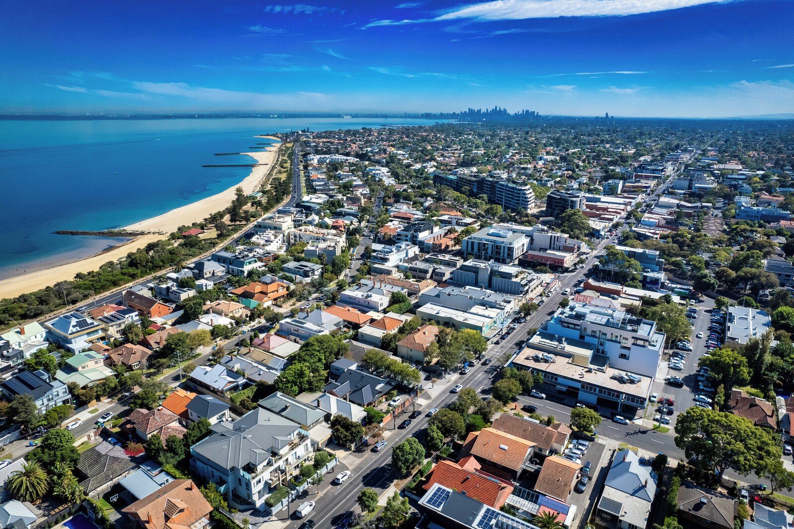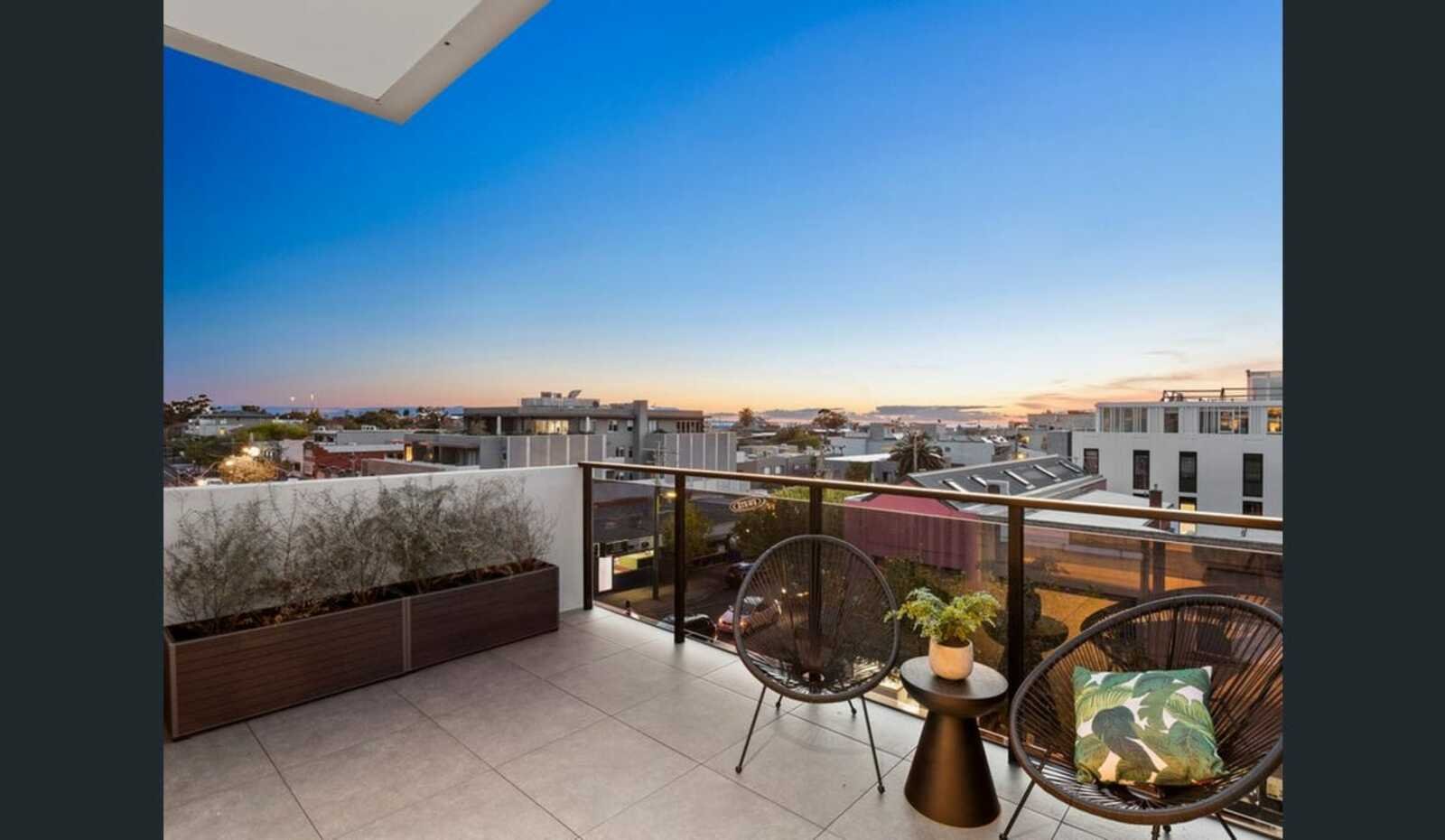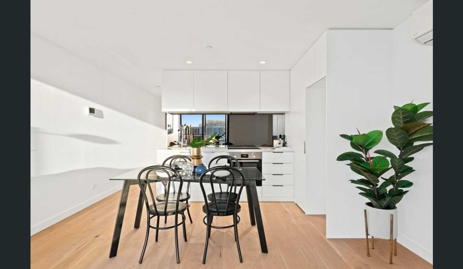 The open plan living and dining area is awash in the warm glow of western sunlight, infusing the space with serene and inviting ambiance. Glass sliding doors gracefully transition to a broad balcony terrace, establishing a seamless indoor outdoor connection. This stunning al fresco space, ideal for both relaxation and entertaining, offers a tranquil escape with sweeping scenes stretching across the neighbourhood to beautiful Port Phillip Bay.