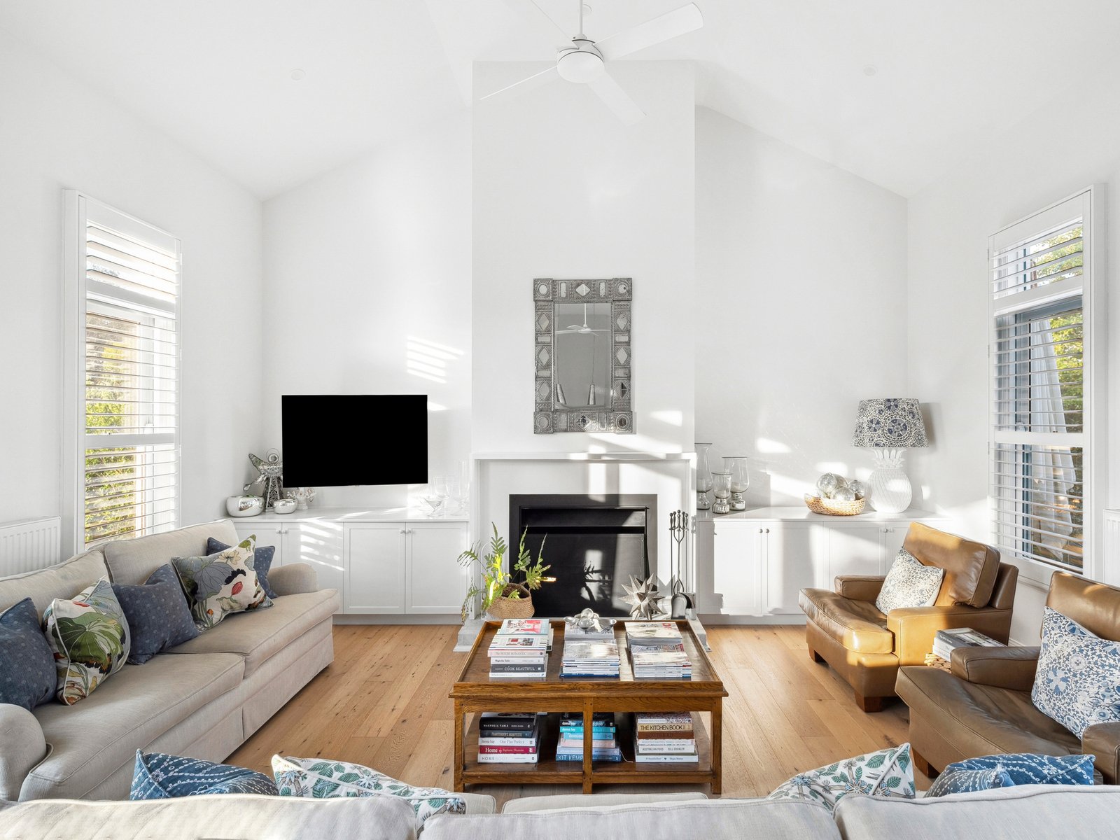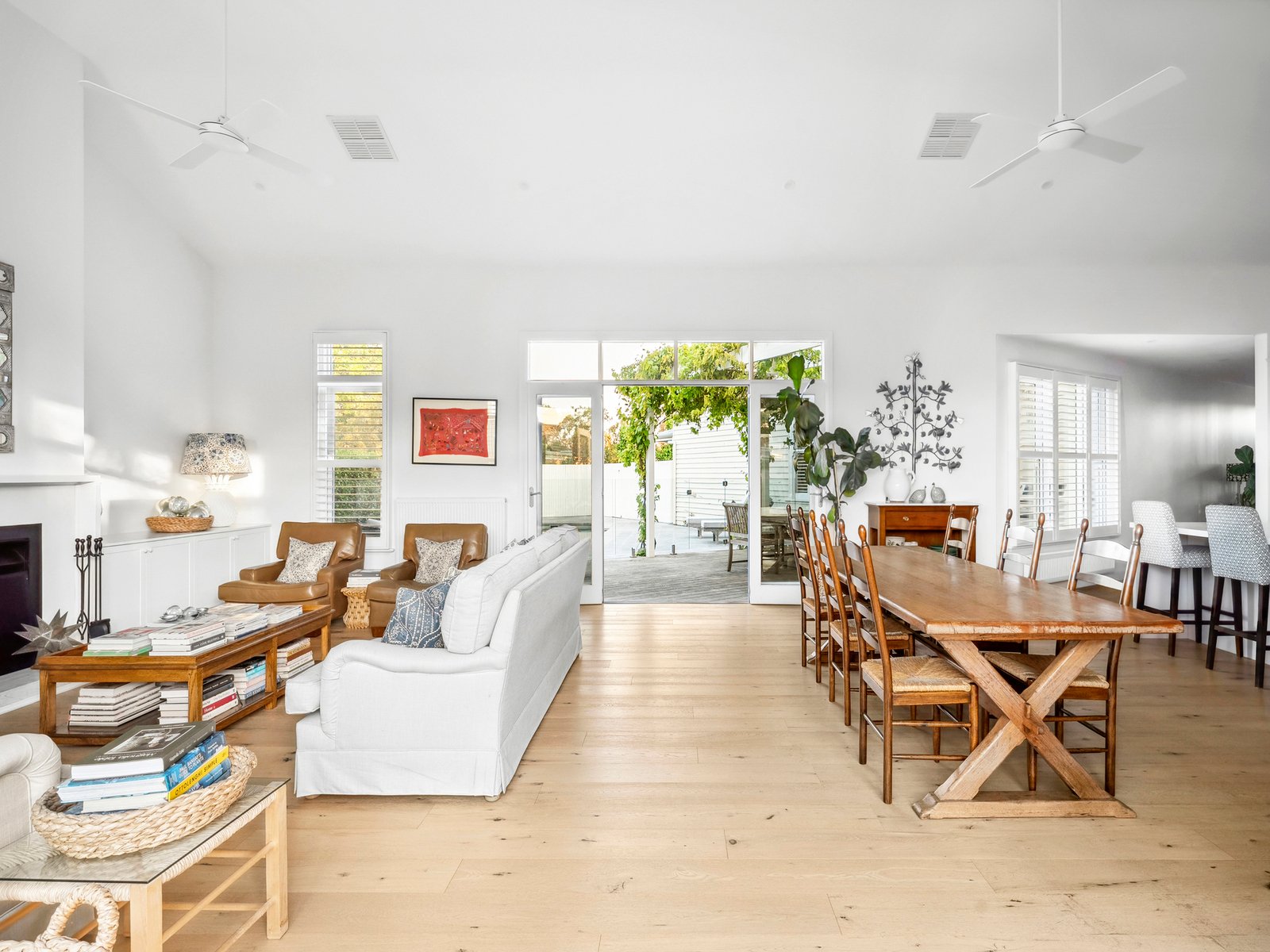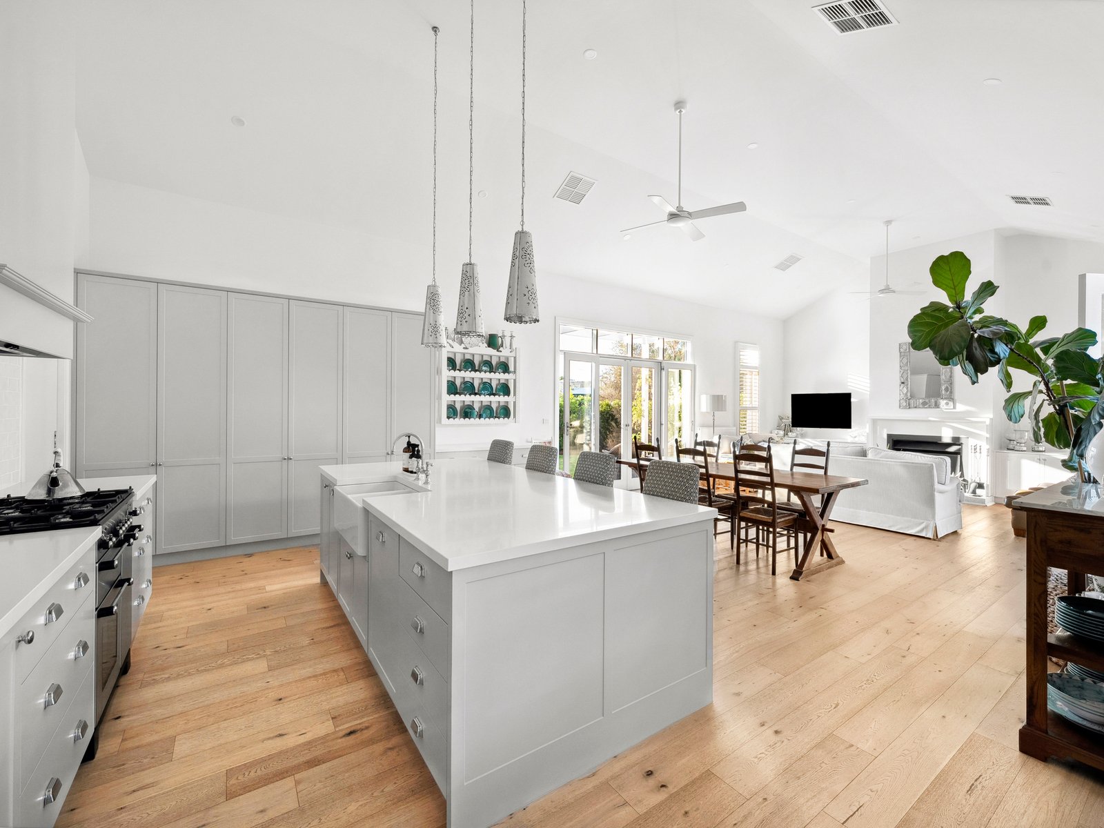 A traditional entry hall with timber flooring sets the tone before opening into the expansive open-plan living, dining and kitchen domain. Soaring 3.9m ceilings enhance the sense of space, while an elegant open fireplace framed by custom cabinetry anchors the room. French doors on both sides draw in natural light throughout the day and create a seamless connection to the outdoors.
