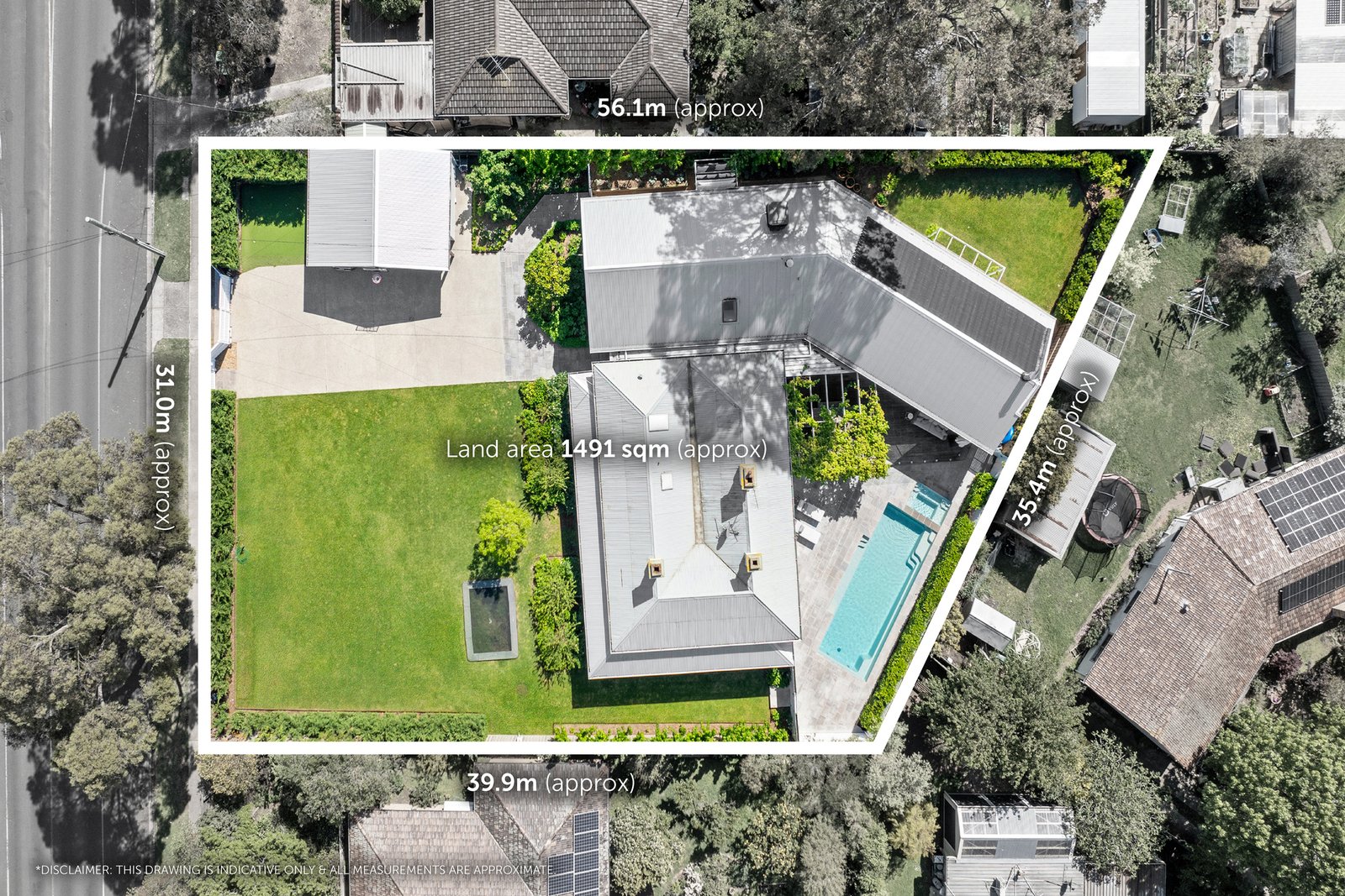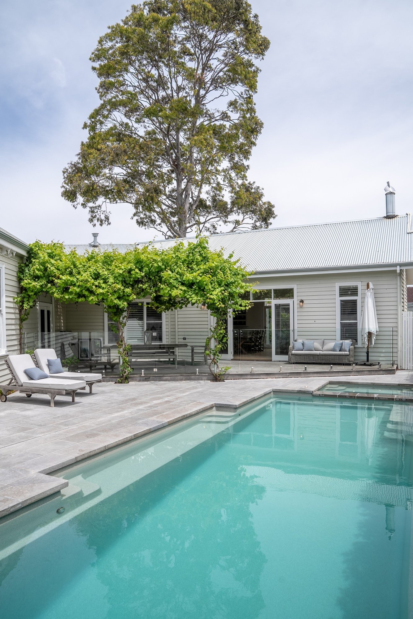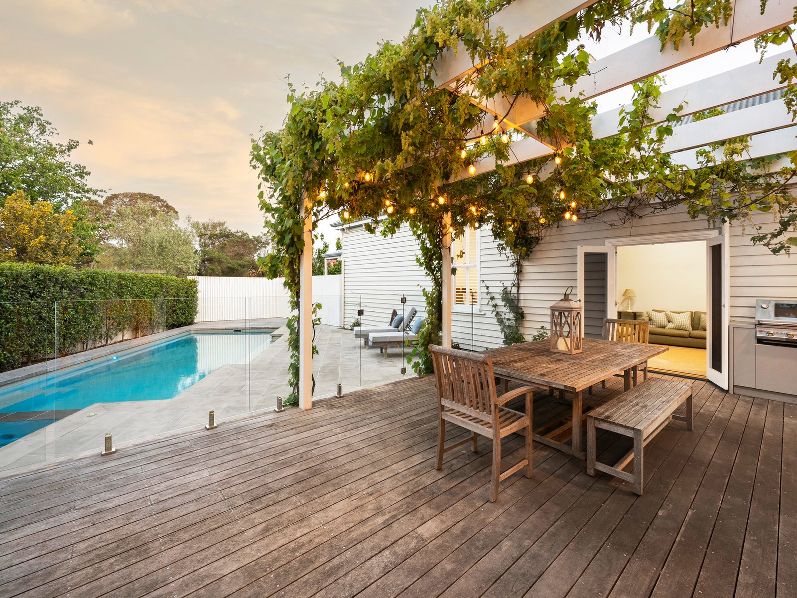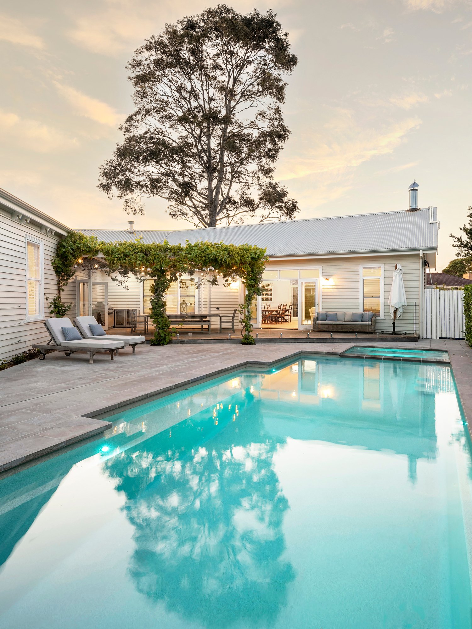 Outdoors, the heated swimming pool and spa form the centrepiece of a vine-covered alfresco zone — a true extension of the living space. Established gardens, an in-ground trampoline and ample lawn create an environment where children can play and adults can unwind.