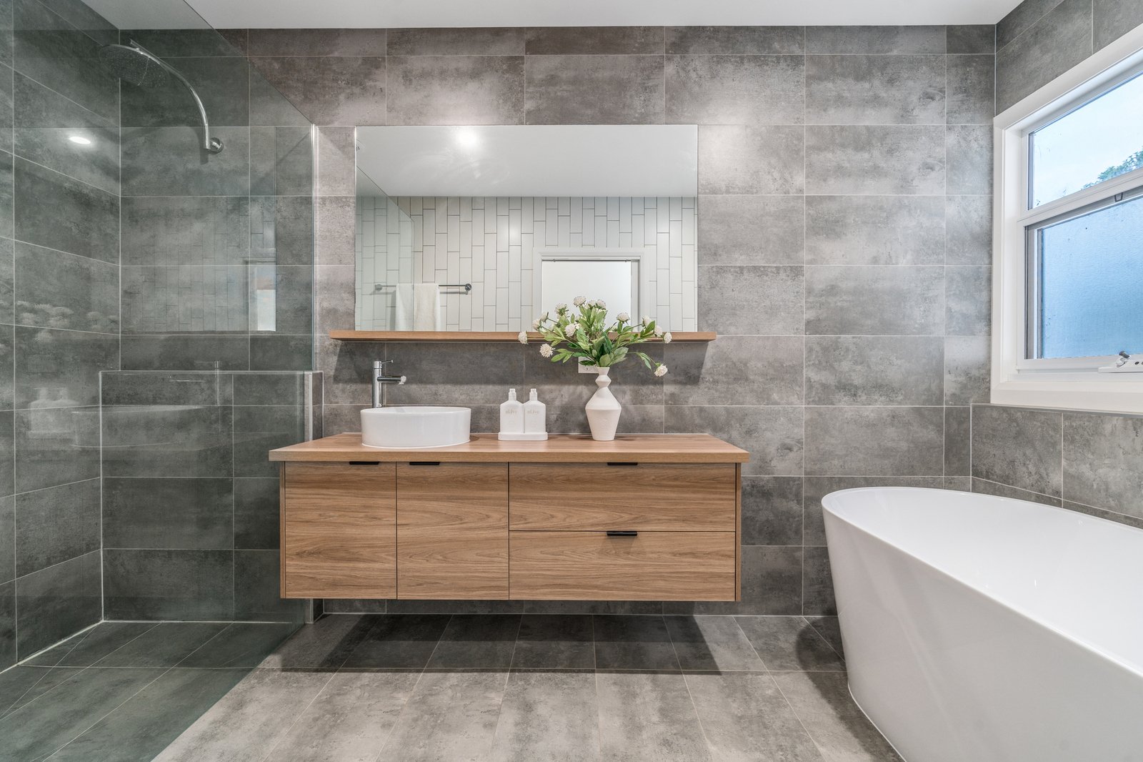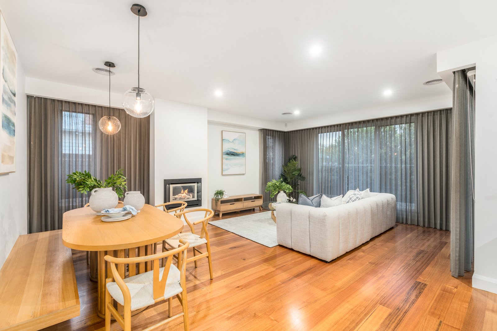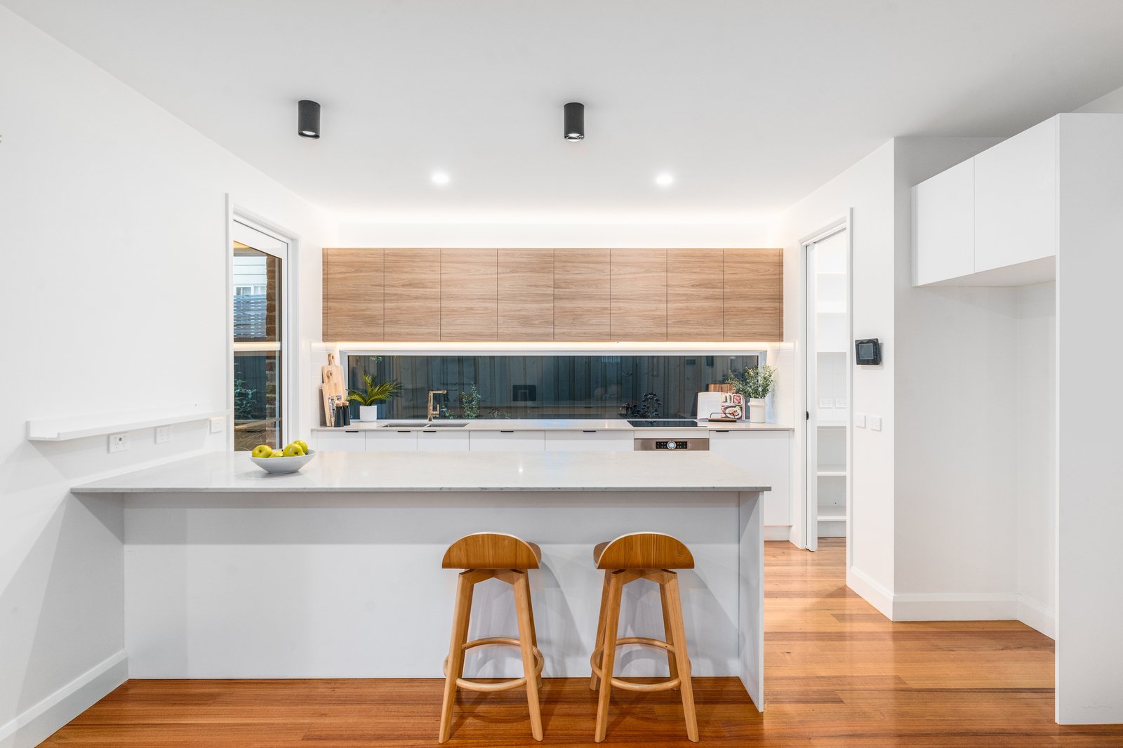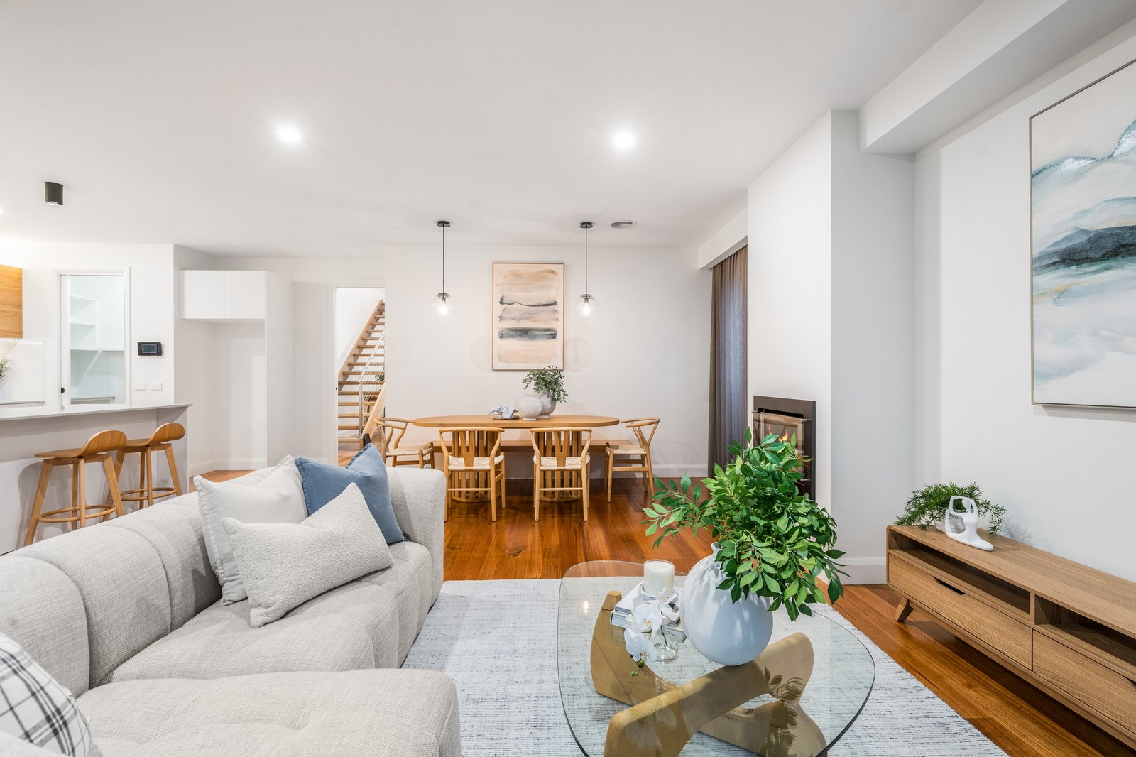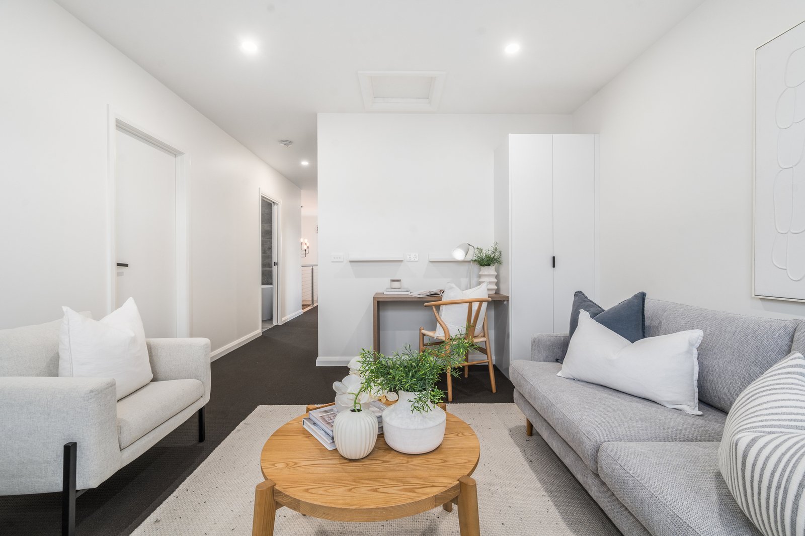Upstairs, three oversized bedrooms are serviced by a stylish central bathroom with a freestanding oval bath, while a second north-facing living zone with study nook provides flexibility as a retreat, media room or work-from-home space.