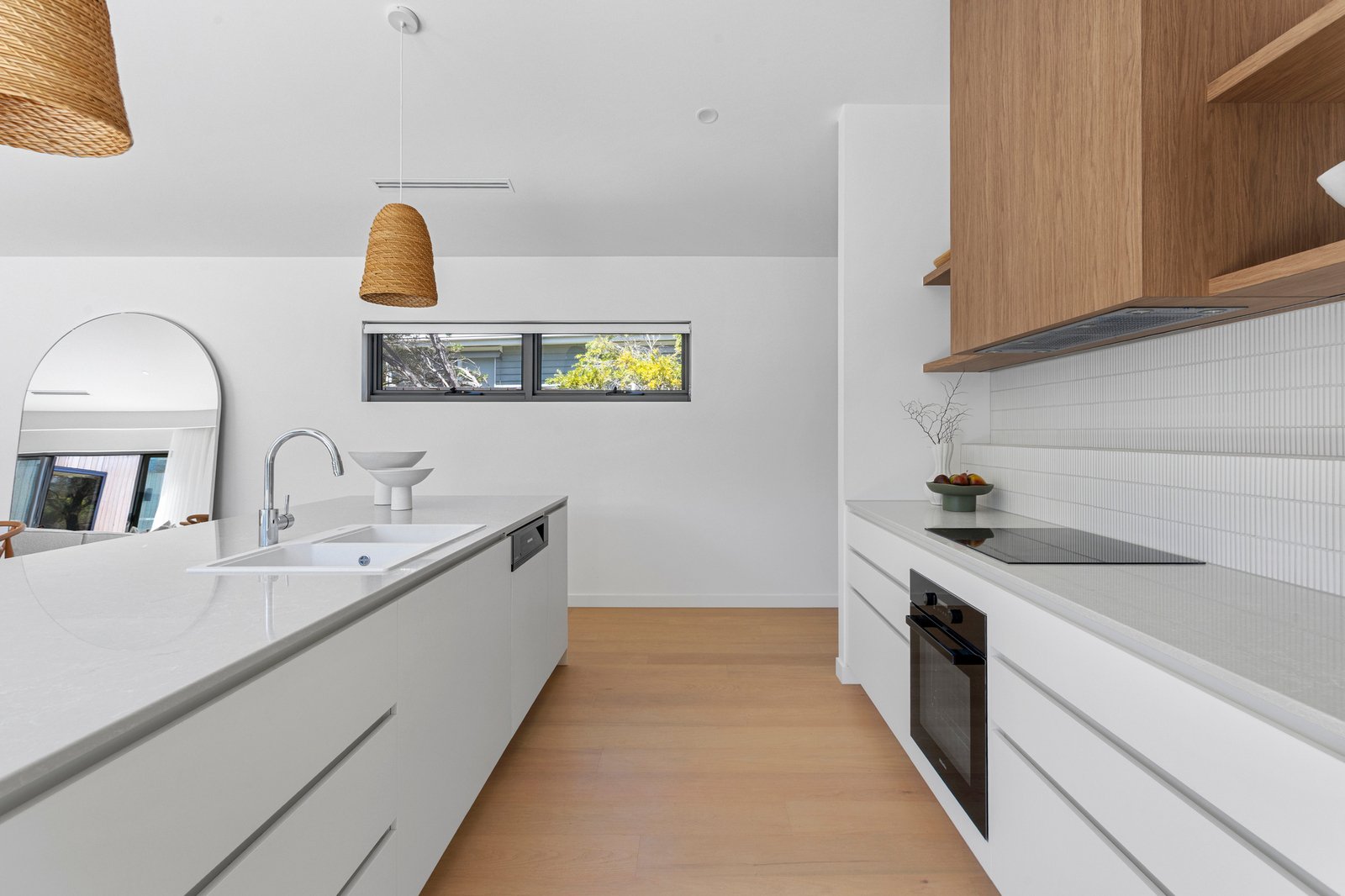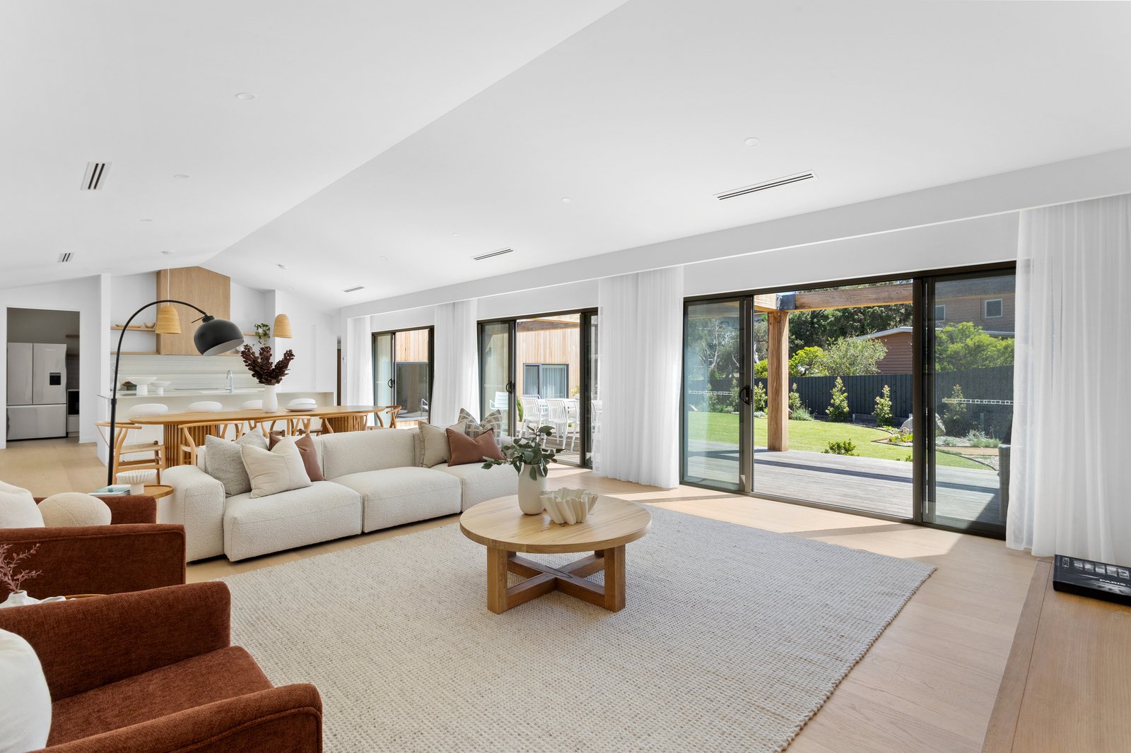 Architect-designed coastal excellence takes compelling form in this brand-new home moments from Number 16 Beach, conceived to capture natural light, sea breezes and the sophistication of life by the ocean. Silver ash cladding, clean architectural lines and carefully considered proportions establish an irresistible first impression, while a clever passive design welcomes light and crisp air deep into the interiors. Engineered oak floors extend beneath soaring raked ceilings, while full-height linen sheers soften the walls and introduce an atmosphere of relaxed coastal refinement. Expansive living and dining areas open naturally through broad banks of glass to landscaped surrounds, creating a fluid connection between indoors and out that perfectly reflects the laid-back appeal of life by the sea.