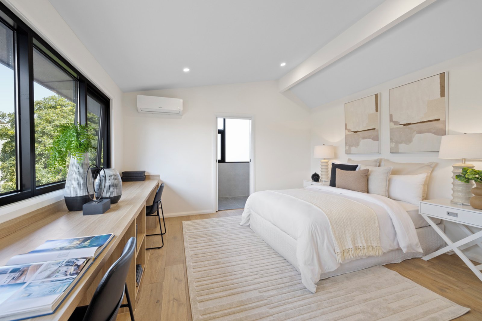 Family accommodation includes a master bedroom with designer dressing room, sumptuous ensuite with bath and separate shower and direct access to an elevated terrace set among the trees. A second bedroom offers built-in wardrobes and terrace access, while the third bedroom also enjoys fitted robes. Upstairs, an alternative master bedroom enjoys built-in robes, twin-vanity ensuite and fitted desks for home workdays.