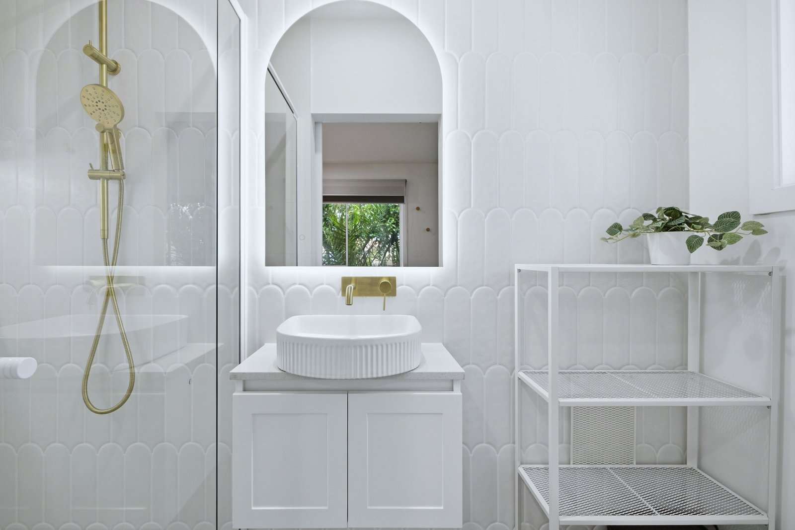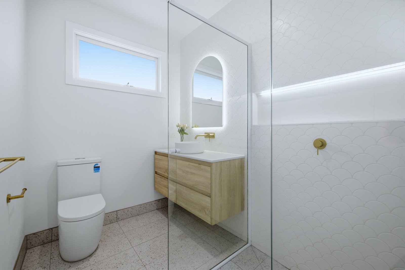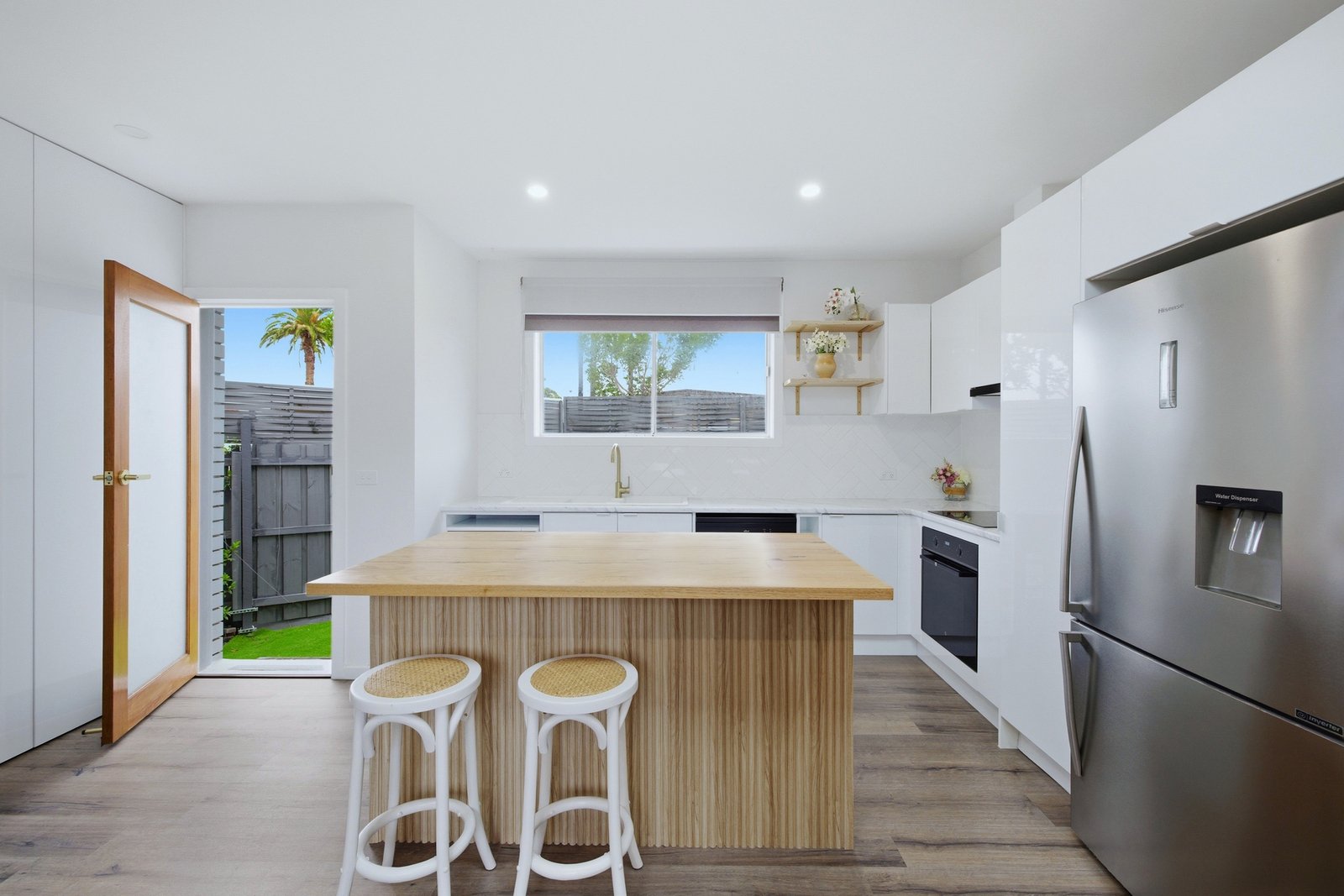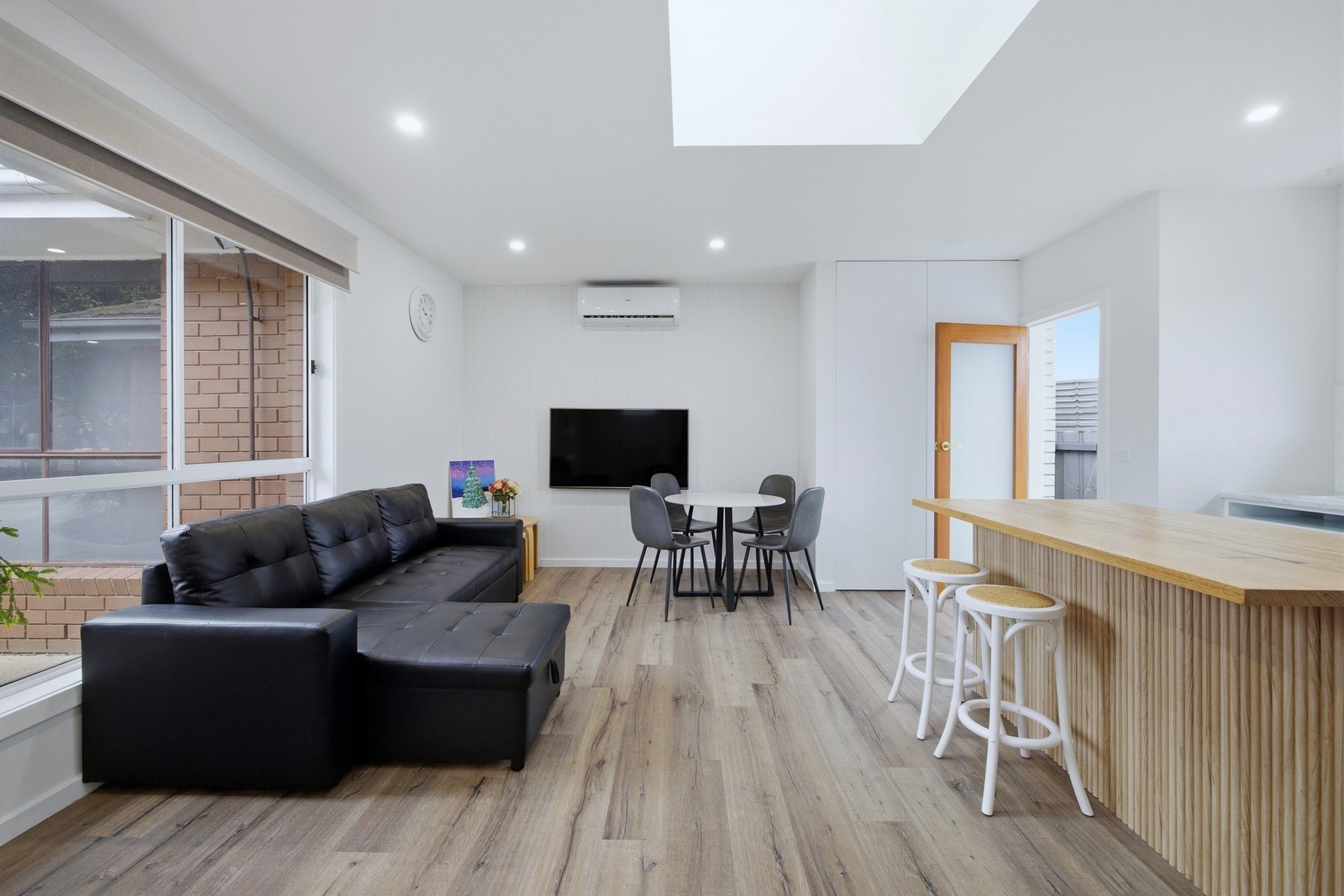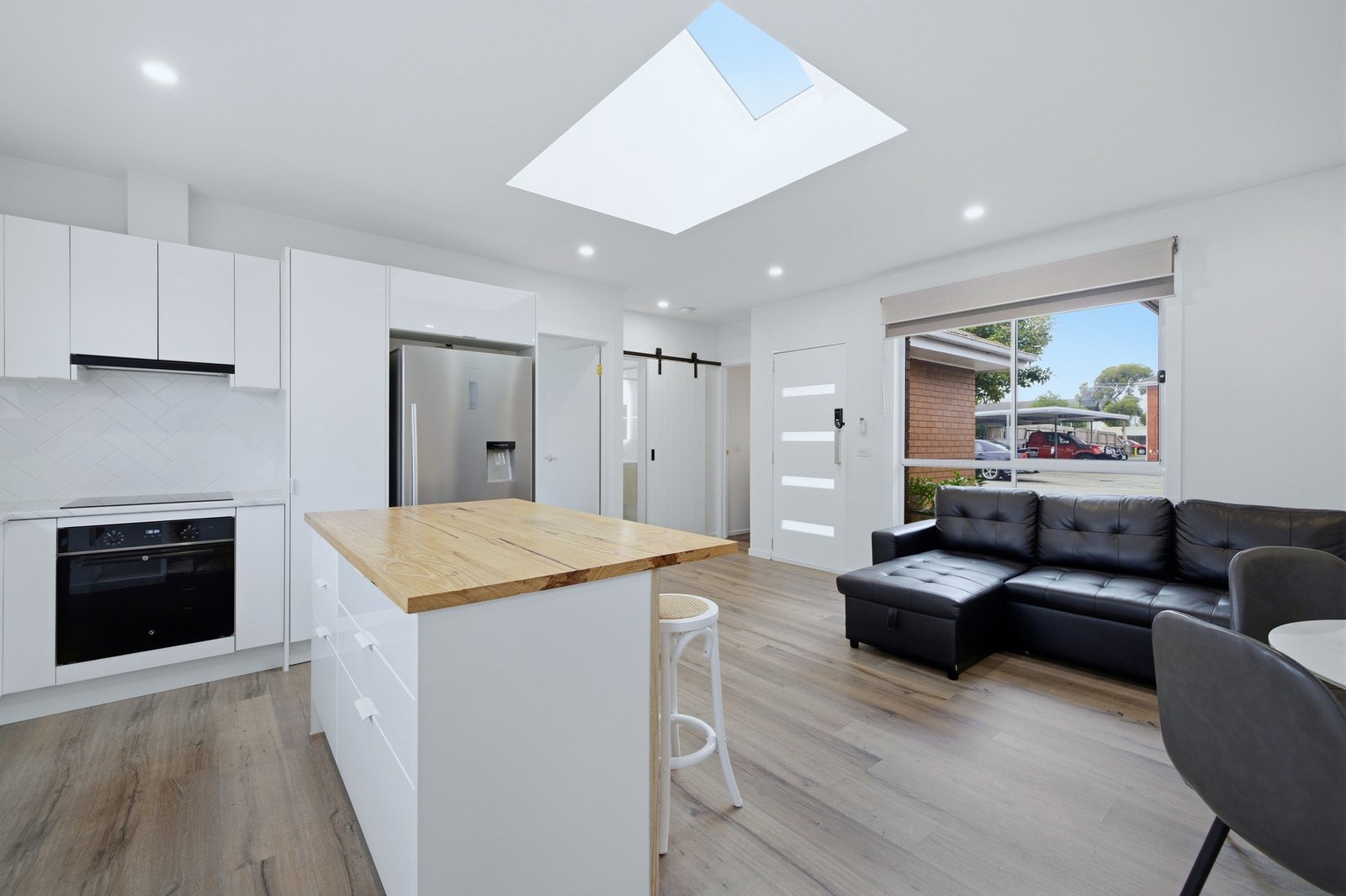 Secure keyless digital entry opens to the light-filled open plan living and kitchen zone, complete with breakfast bar, double sink, herringbone splashback and sleek black appliances. A spectacular skylight floods the space with natural light, while neutral tones, timber lining board feature walls and internal barn doors create a warm coastal feel. Stunning tiling, gold tapware and LED lighting add a refined contemporary finish.