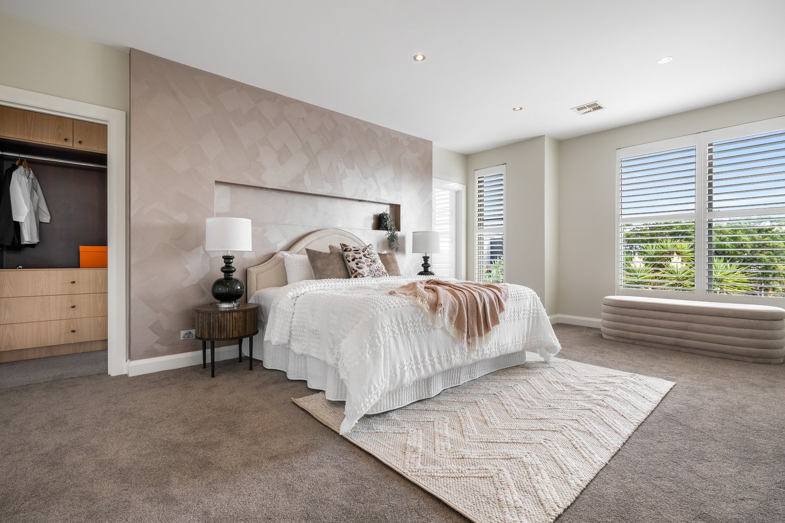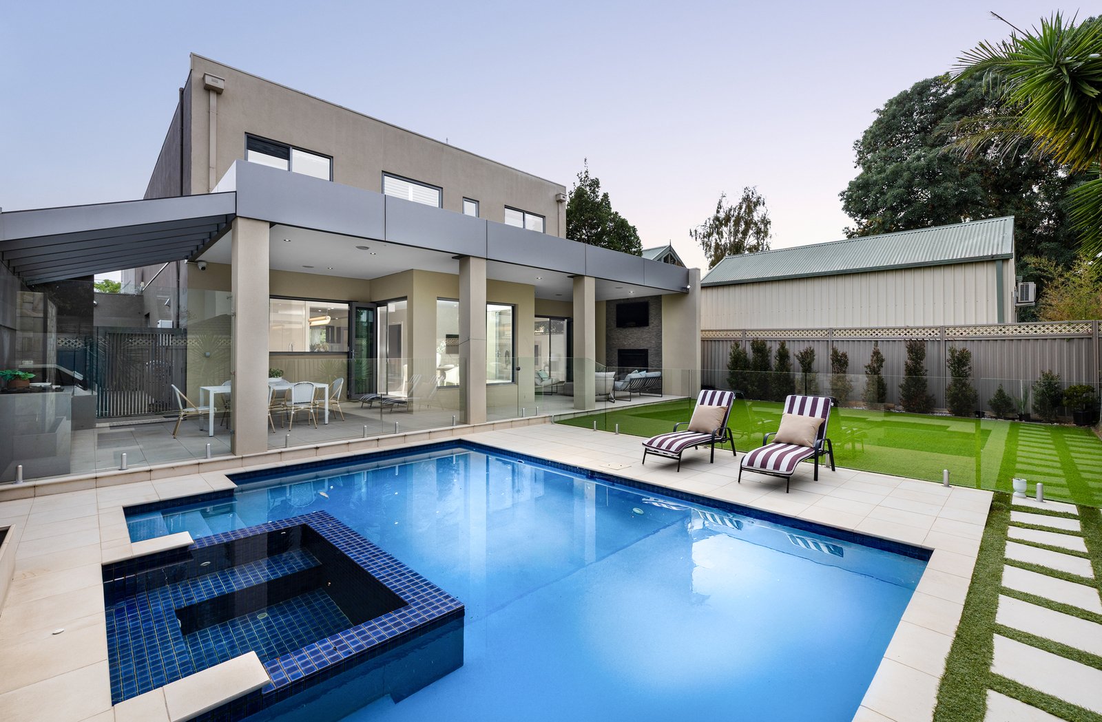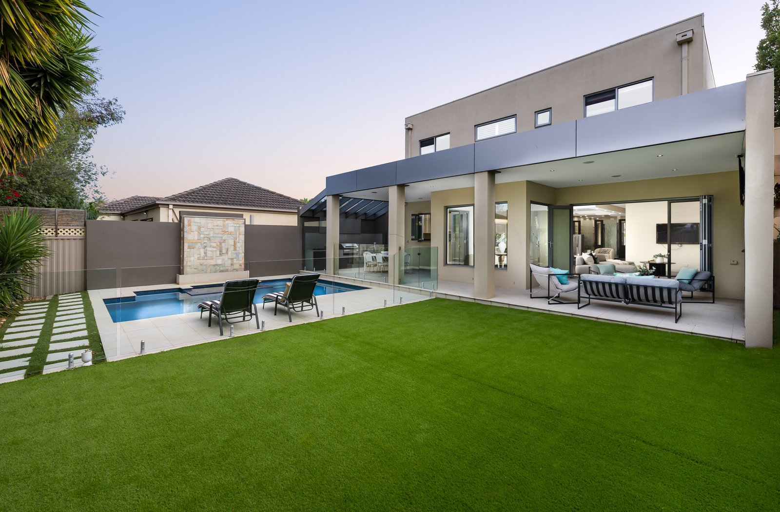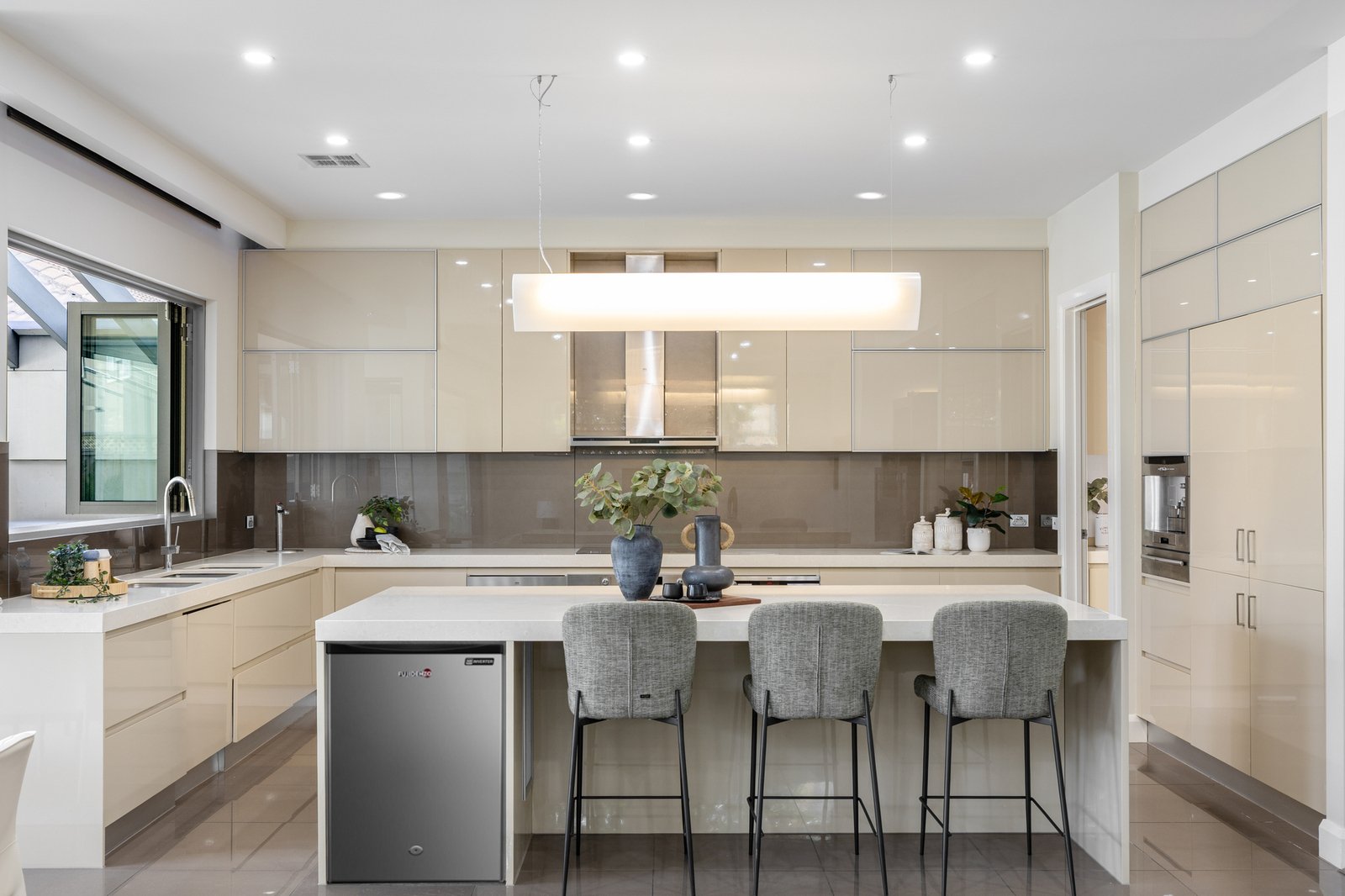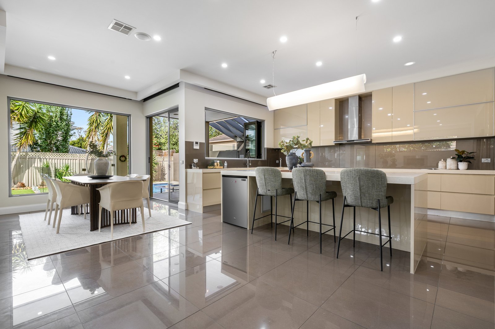 A sleek stone kitchen with large island bench, quality appliances and excellent storage is supported by a butler’s pantry and adjoining laundry, making day to day living easy. Sliding doors connect the main living zone to an undercover entertaining area and alfresco, overlooking the landscaped backyard and sparkling pool for year round enjoyment.