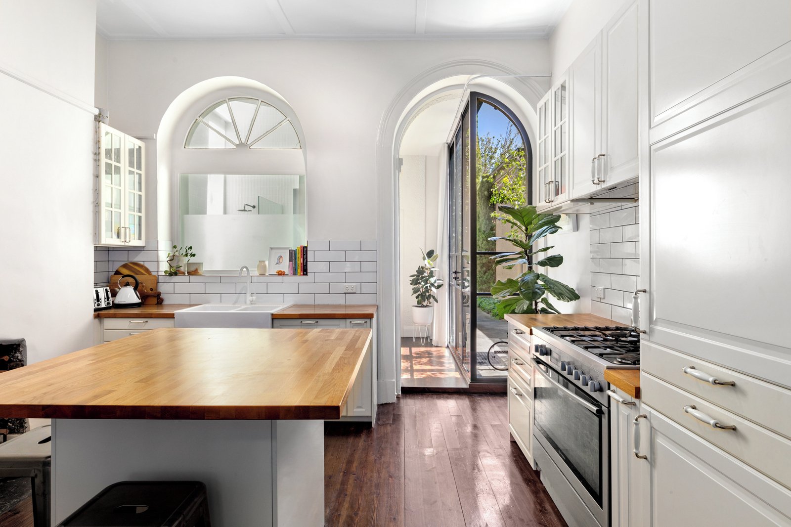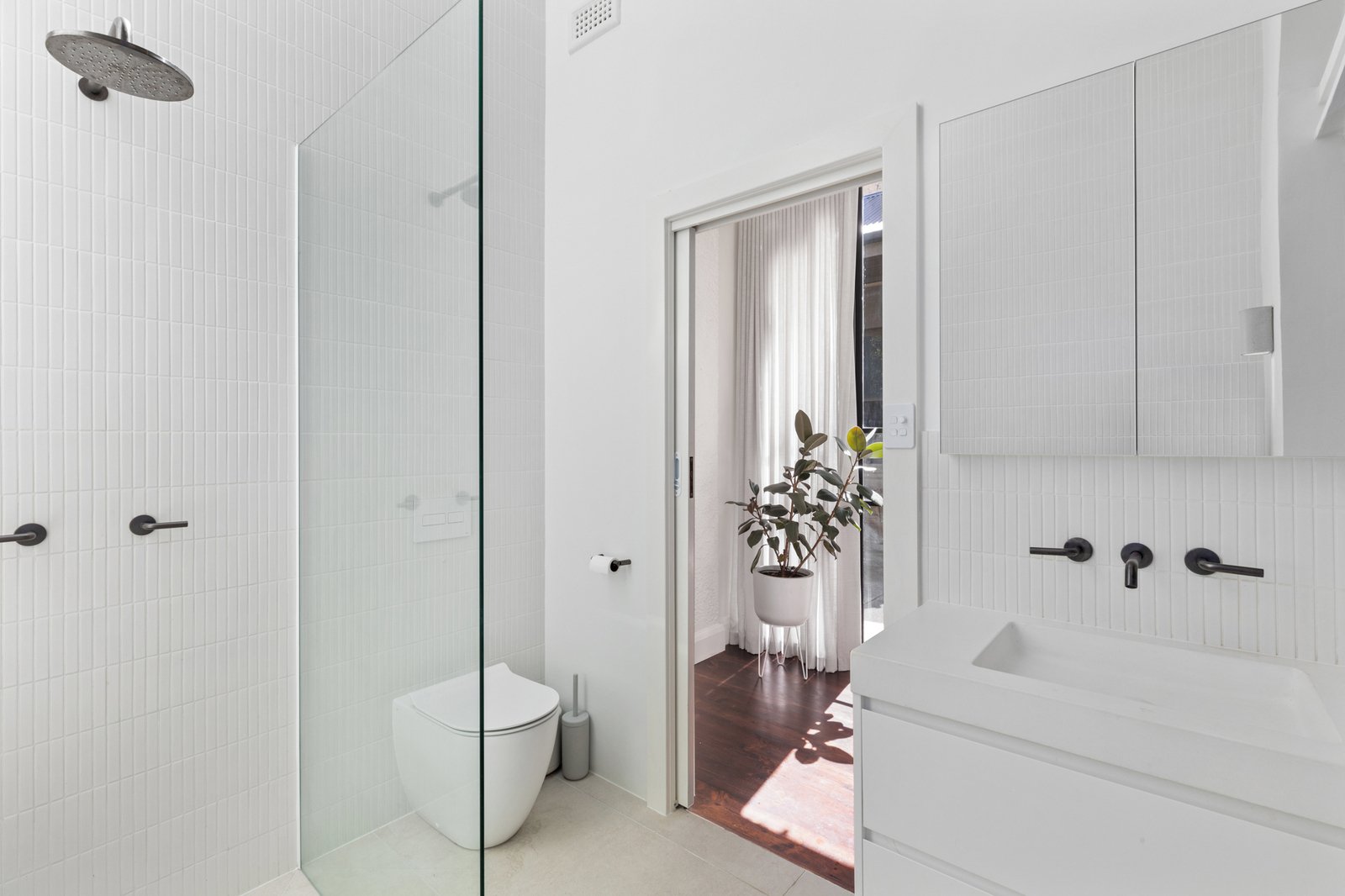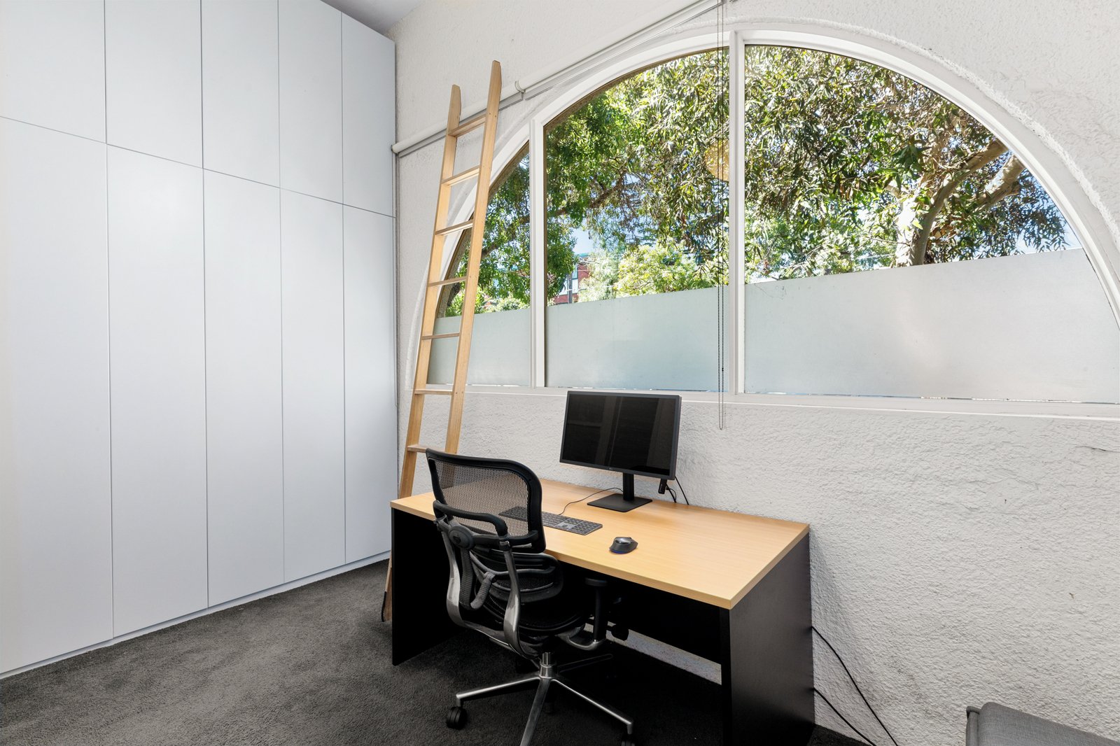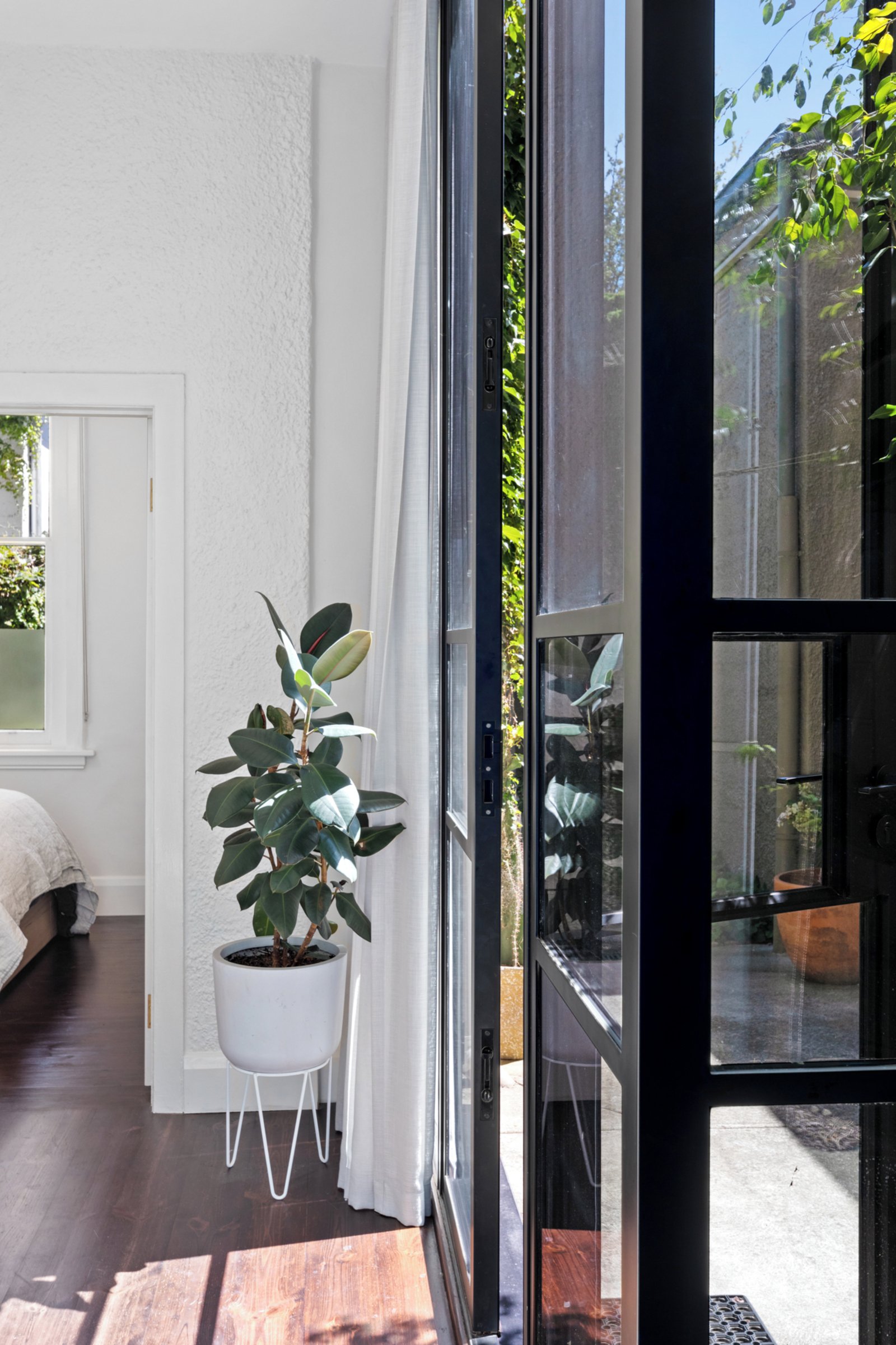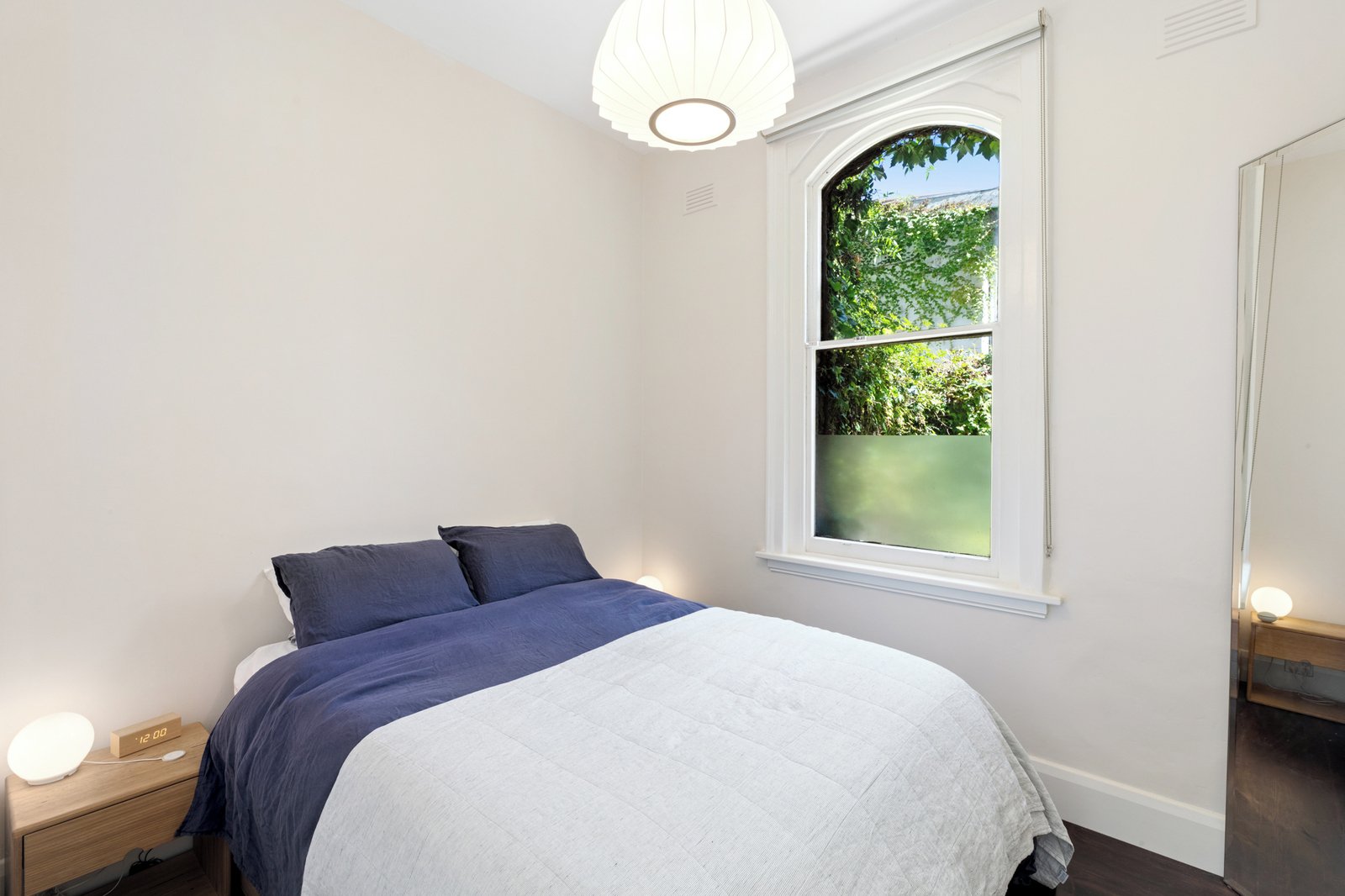 A cosy and stylish bedroom overlooks a leafy courtyard, dappled in beautiful afternoon sun. A second room at the front of the property, with arched windows and BIRs can be used as a second /guest bedroom or a sun-drenched study. Leadlight details, a light and bright central bathroom with underfloor heating, intercom entry and secure parking complete this inspiring home.