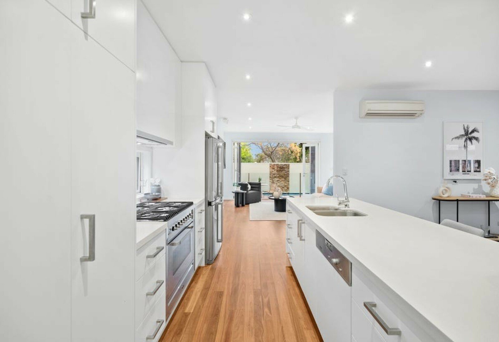 Maximising its compact site with dual living zones, this innovative residence features a sleek kitchen with premium stainless-steel appliances, free-flowing...