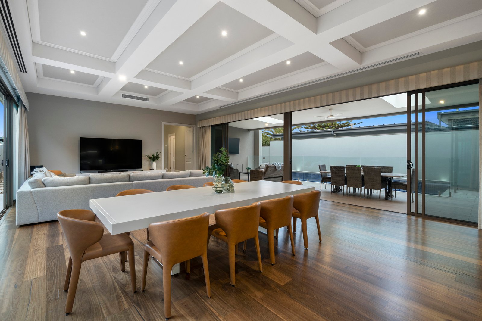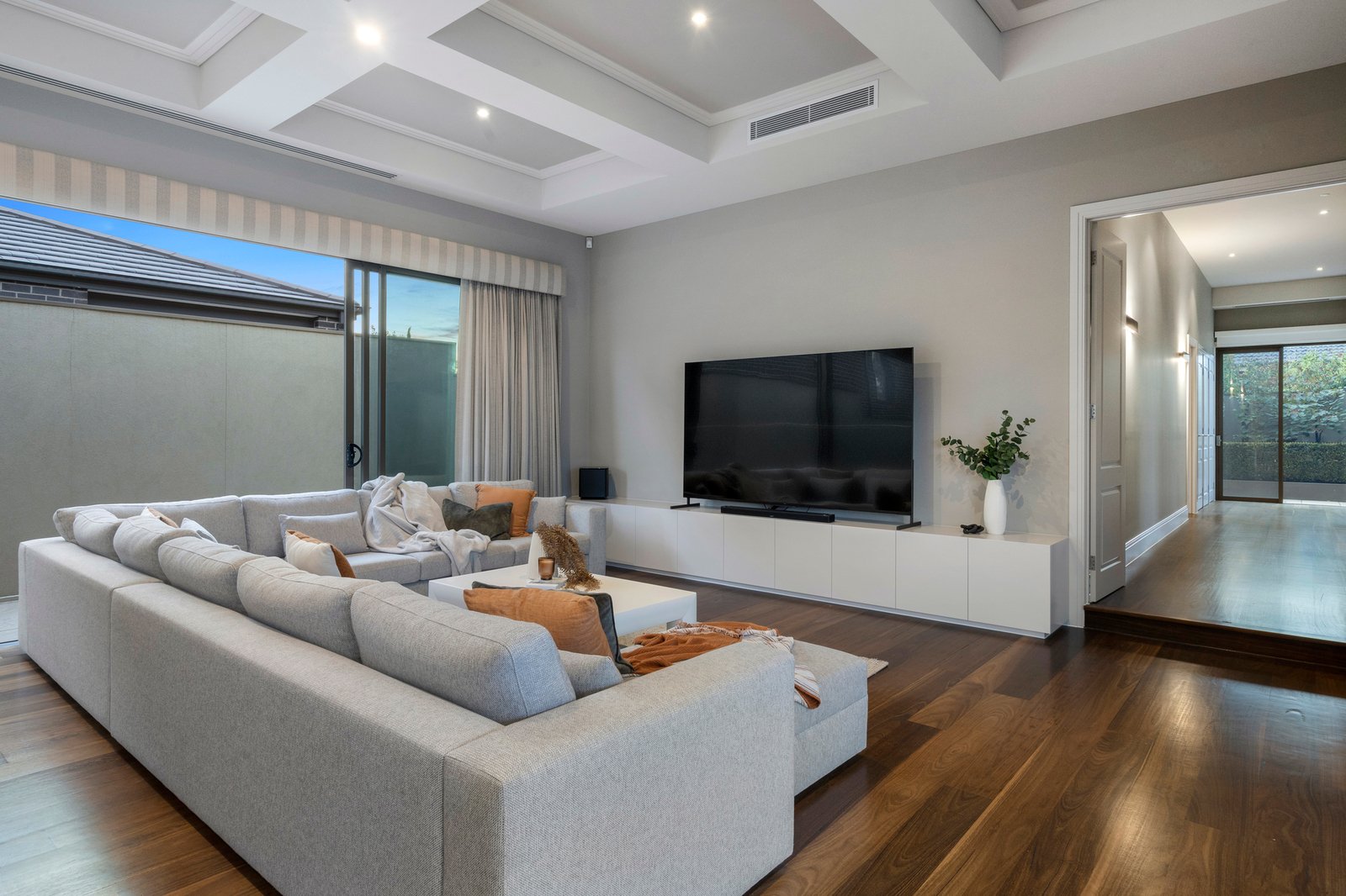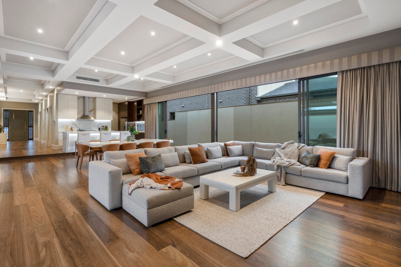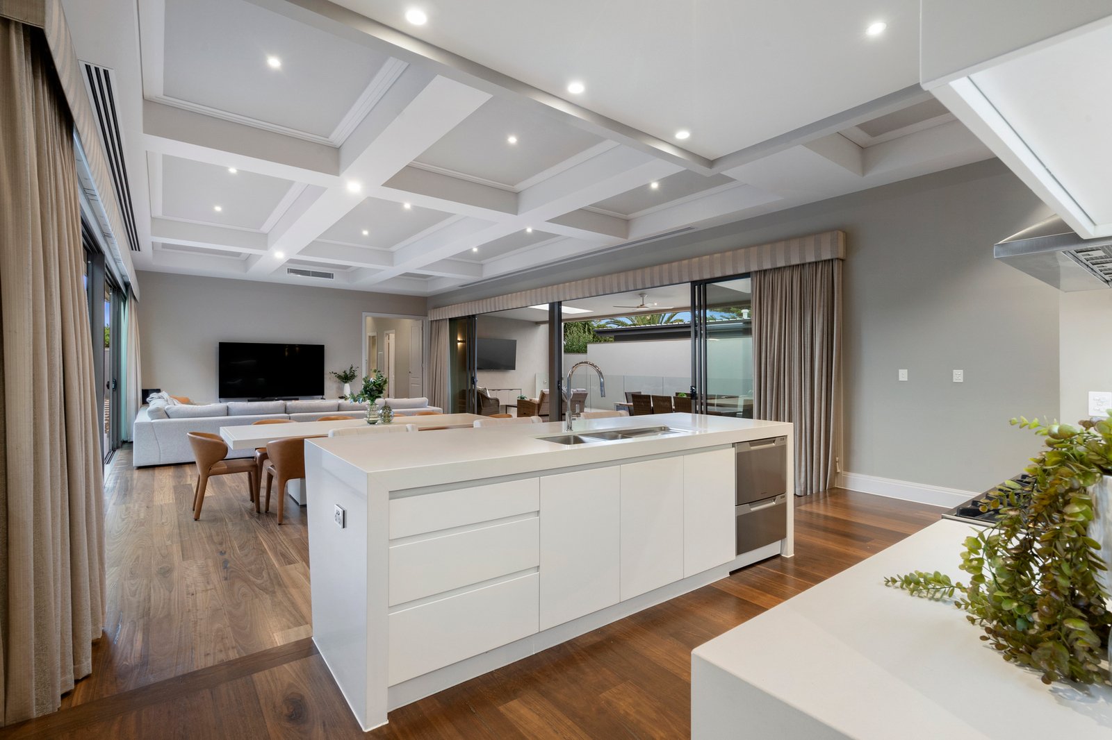 Captivating from the street thanks to its sophisticated facade and meticulously manicured gardens, the single level custom-built residence opens to breathtaking interiors crowned by soaring coffered ceilings with premium hardwood flooring underfoot.