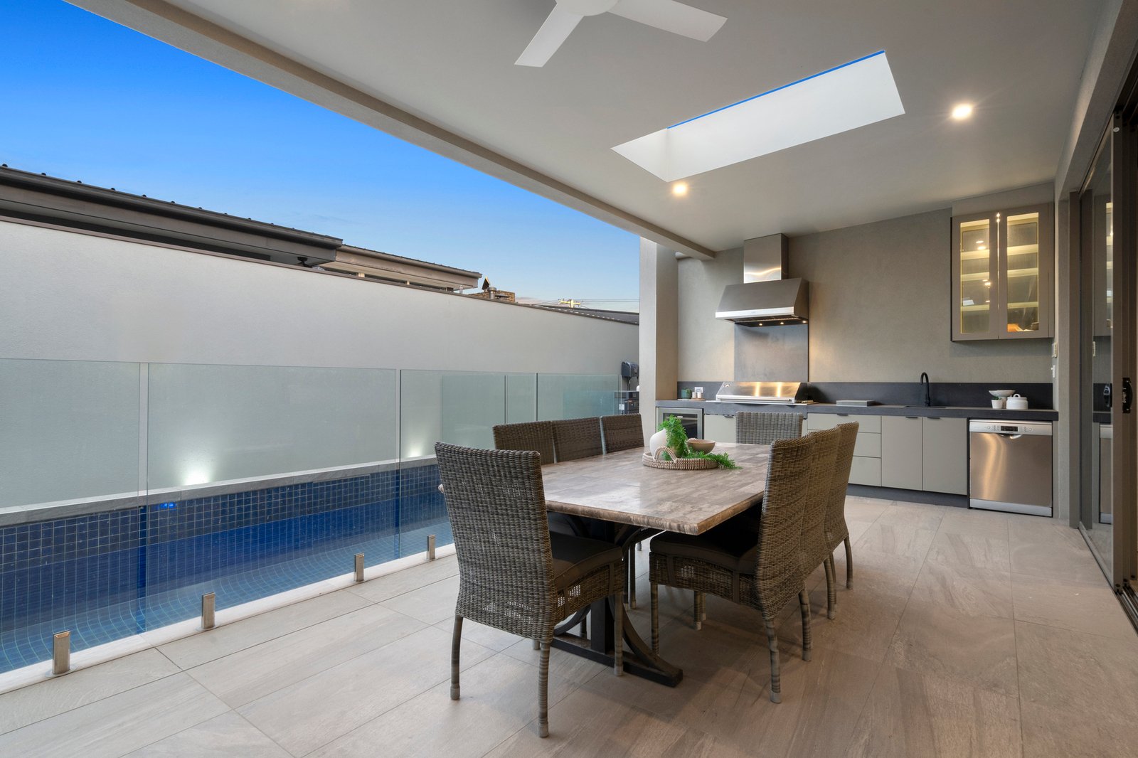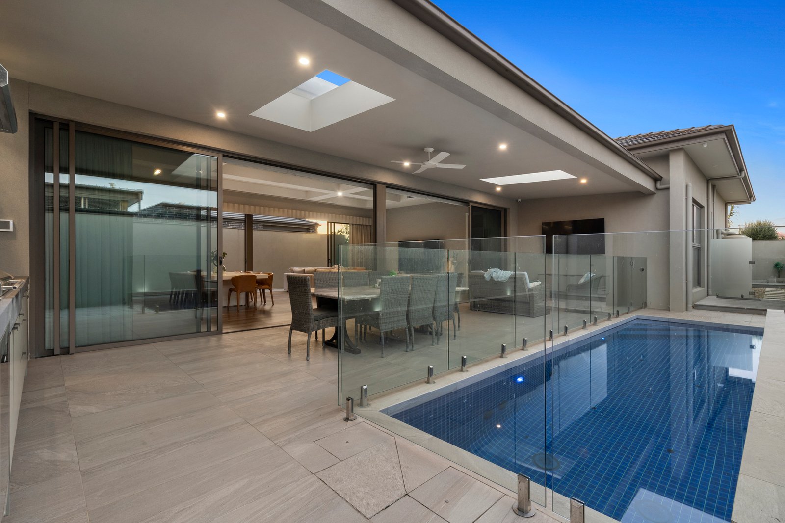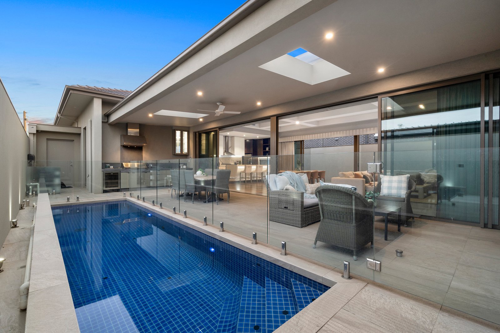 Further on, discover a huge open plan living/dining zone with retractable full-height glass to both sides. Seamlessly connected to the fully-tiled pool and skylit outdoor entertaining area with built-in BBQ, a convinient bathroom with both internal and external access is located next to the alfresco area, this exceptional domain is also home to a first-class Epicurean kitchen, where lavish, thick expanses of stone, premium appliances and a two-way butler pantry are all highlights.