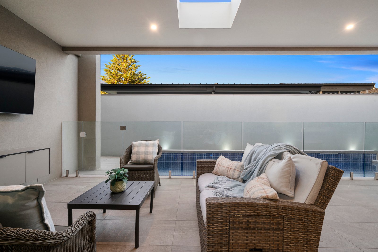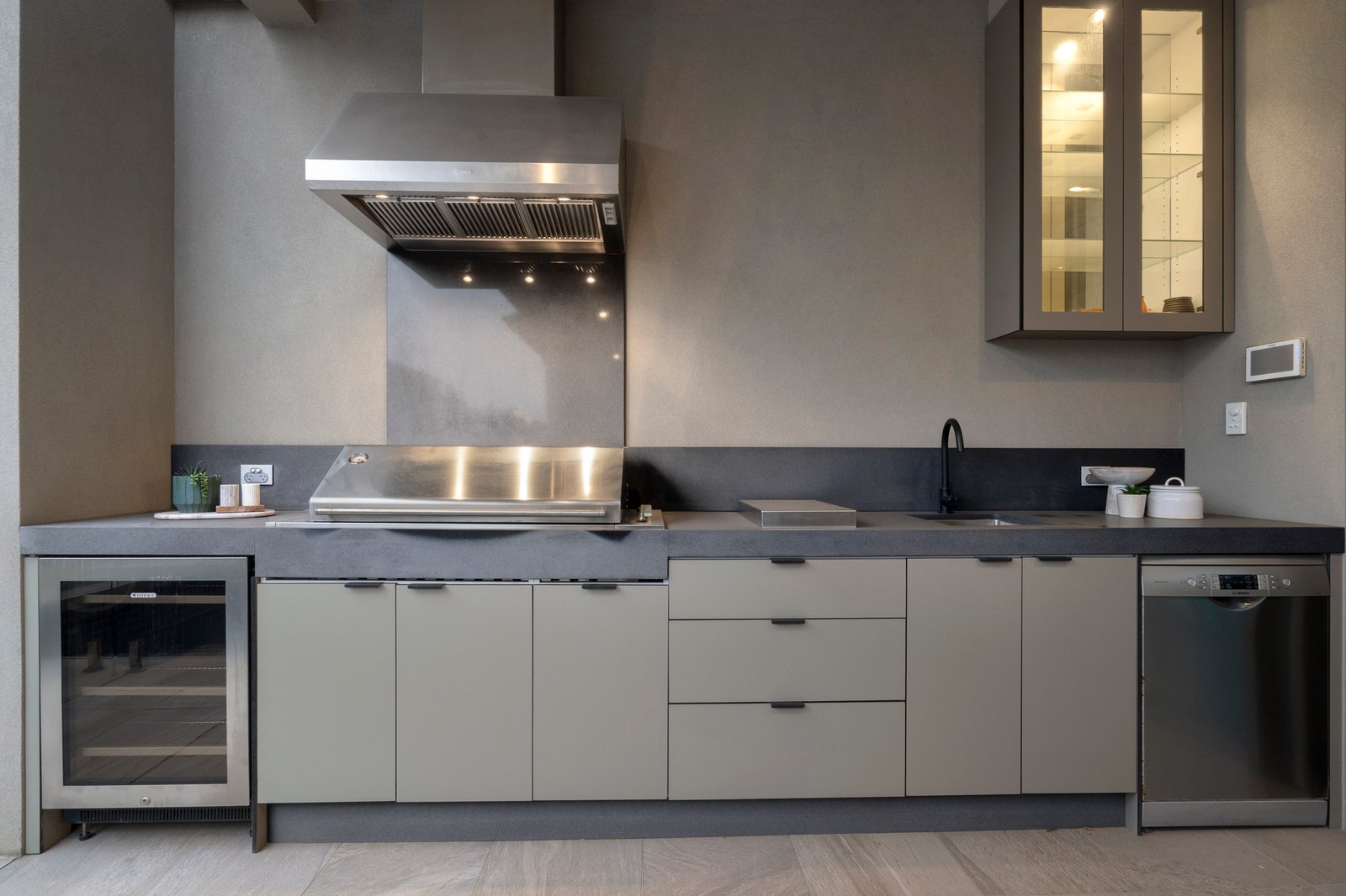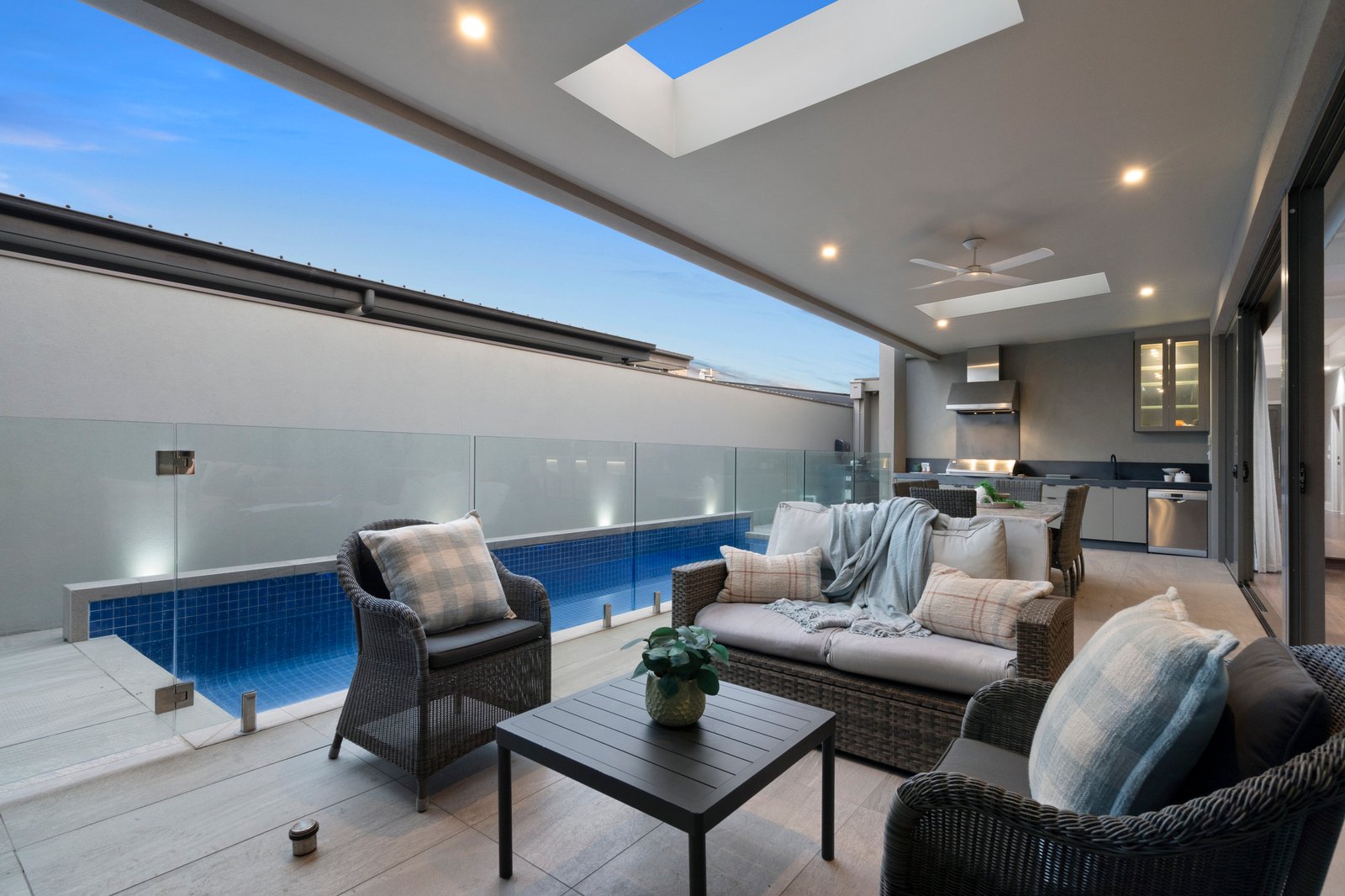 Further on, discover a huge open plan living/dining zone with retractable full-height glass to both sides. Seamlessly connected to the fully-tiled pool and skylit outdoor entertaining area with built-in BBQ, a convinient bathroom with both internal and external access is located next to the alfresco area, this exceptional domain is also home to a first-class Epicurean kitchen, where lavish, thick expanses of stone, premium appliances and a two-way butler pantry are all highlights.