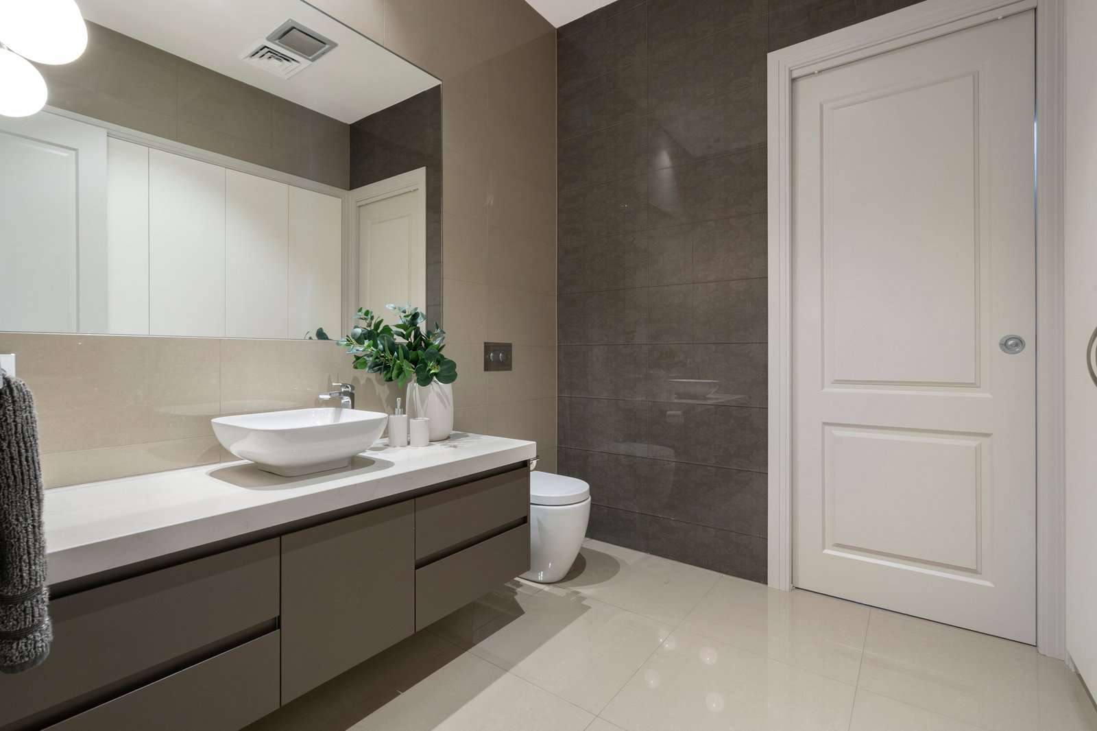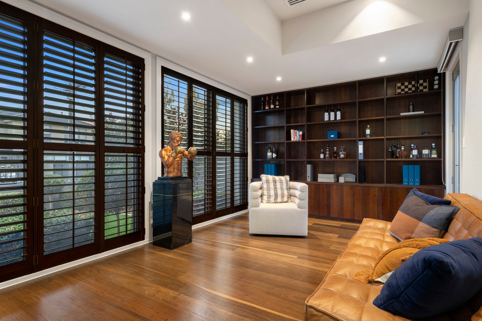 A fitted home office with bespoke joinery and the first of four serene bedrooms are positioned toward the front of the residence, providing supreme quietude and privacy for guests and those who work from home.