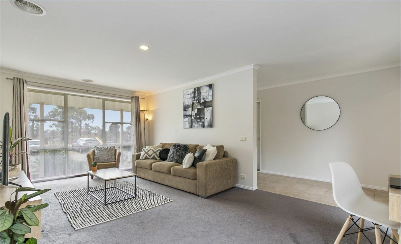 At the front of the home you will find the first light and bright carpeted living room/parents retreat leading through to the master bedroom with BIR, ceiling fan and bathroom. The large tiled open plan kitchen / meals area has an abundance of natural light offering ample bench space, double sink, dishwasher, 600mm oven, 5 burner cooktop and tiled splashback. Opposite the kitchen is the second living space with ceiling fan and sliding door access to the rear yard. Other features include, two more bedrooms with built in robes, family bathroom, laundry, heating and cooling, to complete the picture. Outside provides plenty of grass for the kids to play, a beautiful paved area set under shade sails perfect for entertaining and external access to remote single garage. With easy access to local shops, Sandhurst Golf Course, Carrum Downs Secondary College and public transport this property won't last long