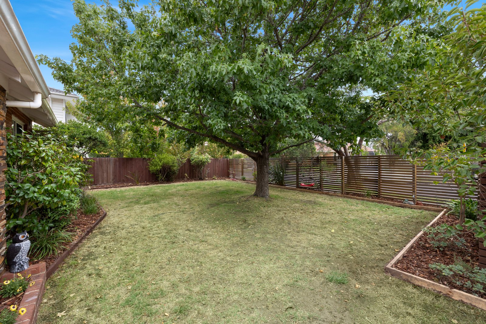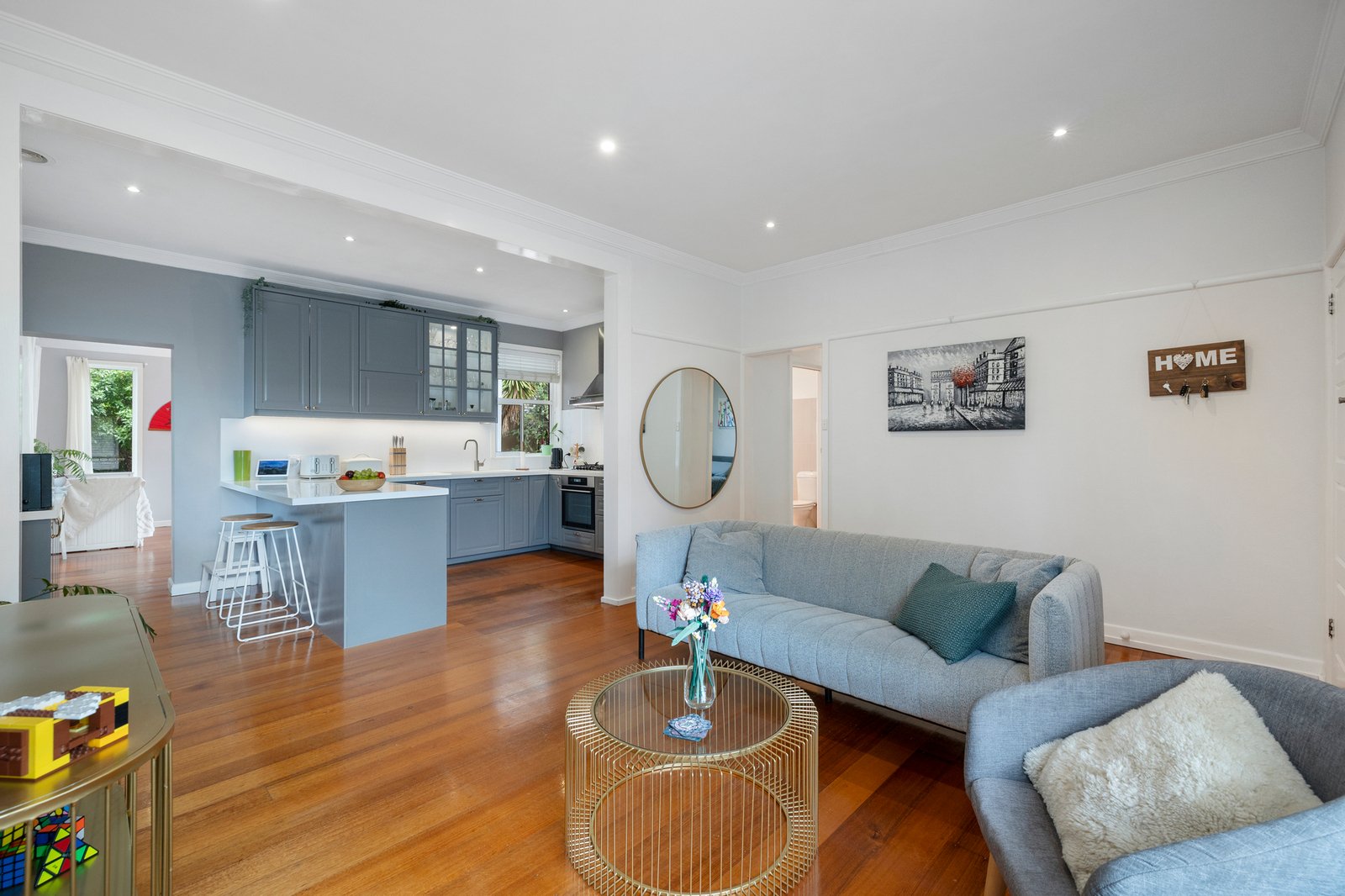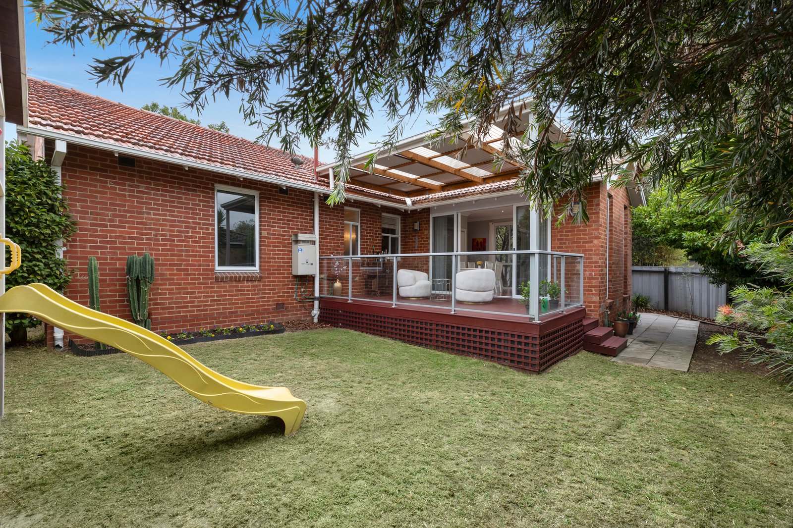 Immediately welcoming with warm hardwood floors flowing through the light-filled accommodation, the layout provides a comfortable living room connecting seamlessly with a gorgeous stone kitchen finished in chic grey and offering plenty of luxe cabinetry plus quality appliances including an integrated dishwasher. Set to the rear, the dining or family area spills out to a sheltered alfresco deck, which provides the perfect vantage point for adults as the kids enjoy the secure leafy garden complete with sweet cubby house.