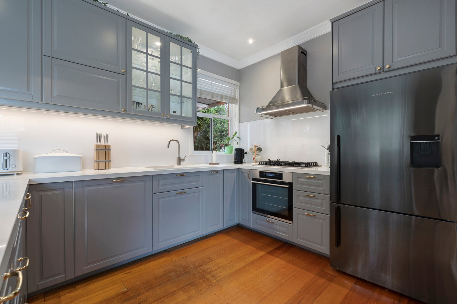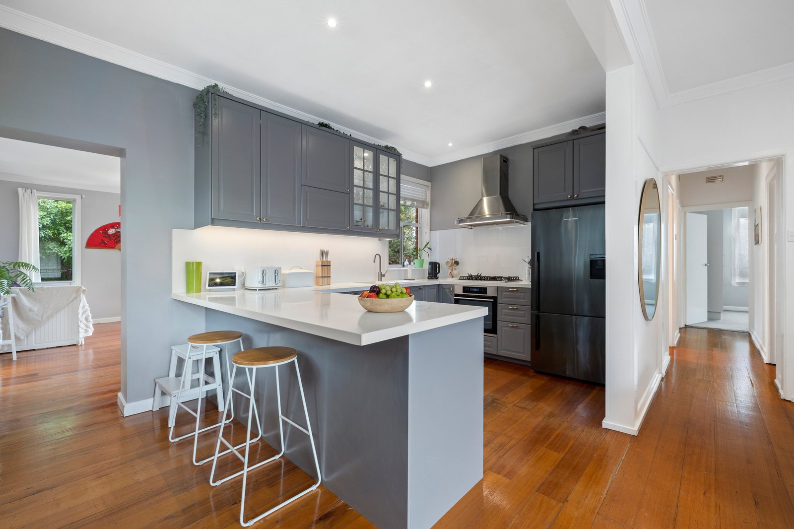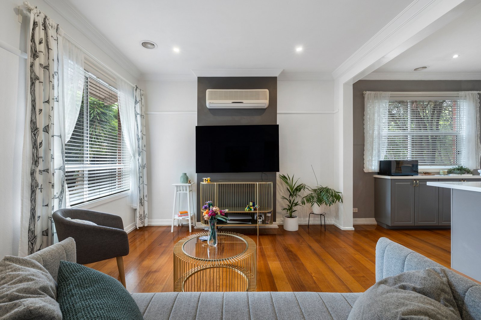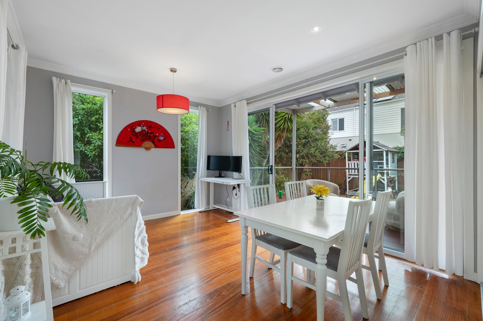 Immediately welcoming with warm hardwood floors flowing through the light-filled accommodation, the layout provides a comfortable living room connecting seamlessly with a gorgeous stone kitchen finished in chic grey and offering plenty of luxe cabinetry plus quality appliances including an integrated dishwasher. Set to the rear, the dining or family area spills out to a sheltered alfresco deck, which provides the perfect vantage point for adults as the kids enjoy the secure leafy garden complete with sweet cubby house.