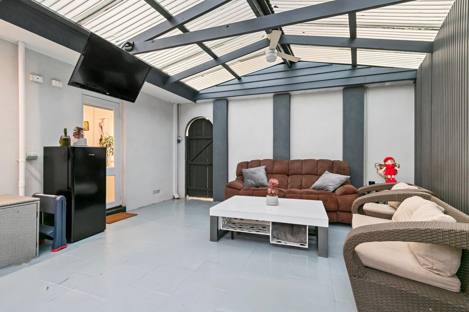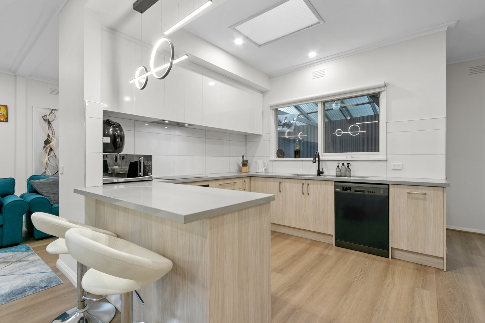 Immediately on entry, the refined style is evident with chic flooring leading to the generous living room warmed by a wood-burner heater and flaunting quality plantation shutters. At the heart of the layout the recently renovated kitchen showcases stone benchtops and smart cabinetry; hosts have the option to entertain guests in the adjacent dining zone or out on the indoor-outdoor alfresco area which has fans and shade blinds ensuring year-round use.