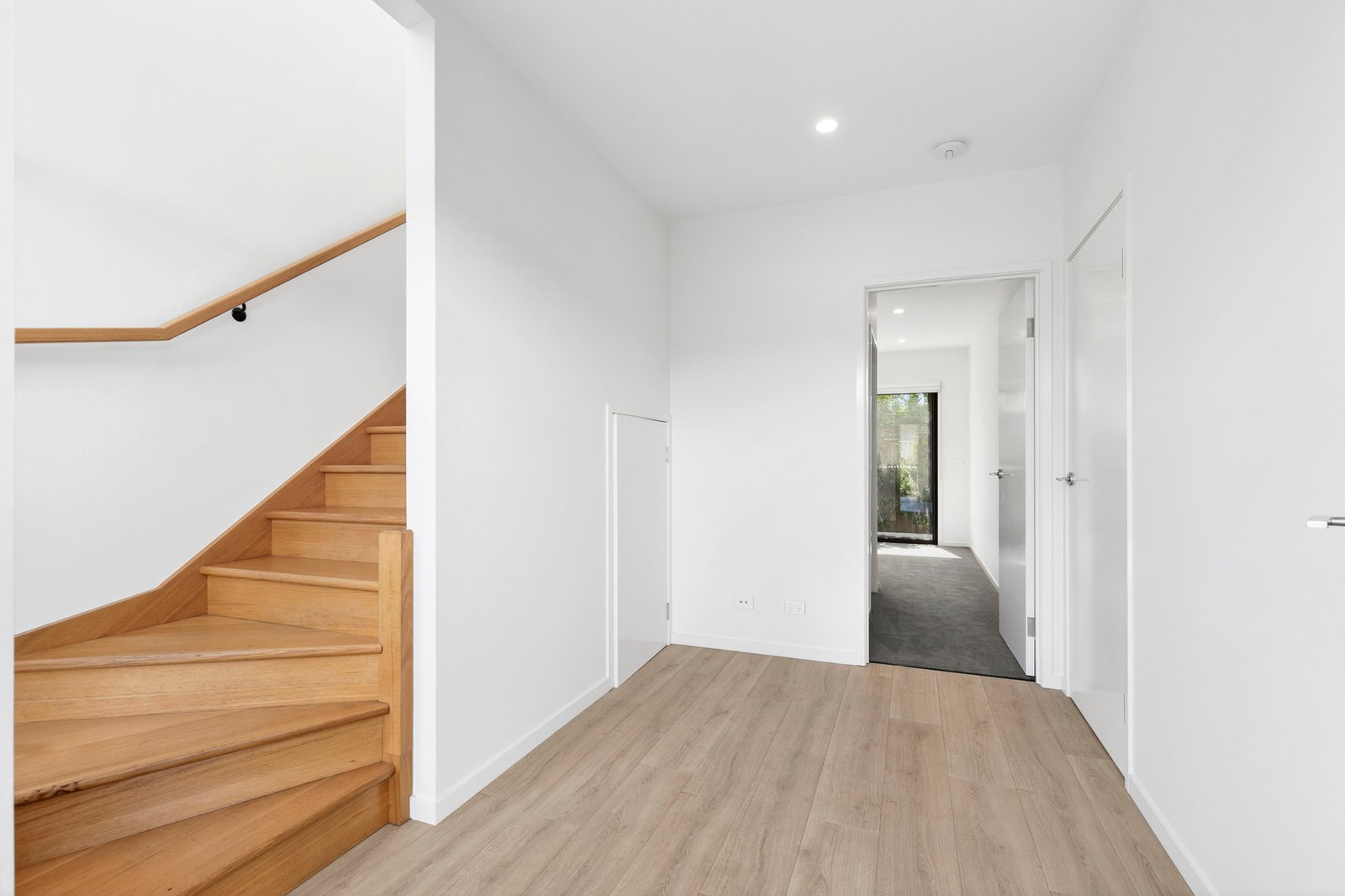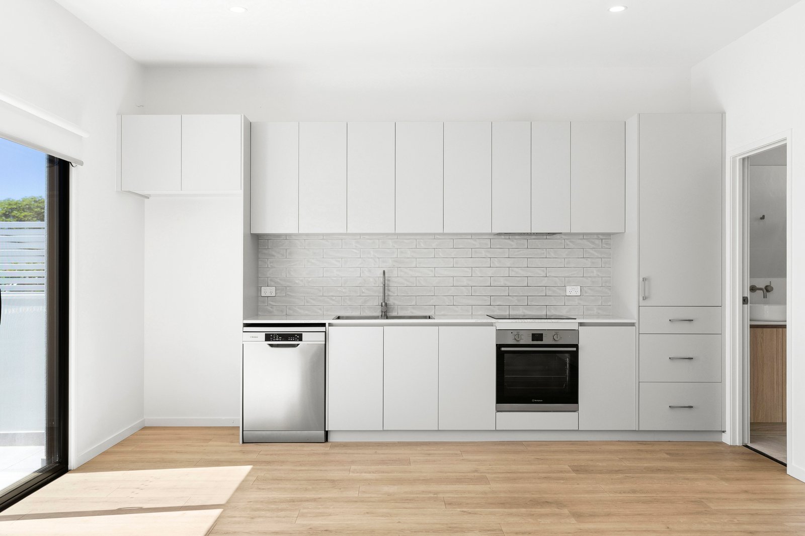 Positioned in a private setting, the contemporary façade sets the sleek theme of the home. Inside, crisp white interiors, and neutral accents combine to create a light and welcoming ambience throughout. A wide entry hall leads you to a stunning timber staircase, which ascends to a light-filled open plan living area. The elegant kitchen features sleek modern cabinetry, stone benchtops, quality Westinghouse appliances including 600mm oven, dishwasher, and excellent storage provisions. Glass sliders open up to a private balcony, offering a secluded space to relax or entertain outdoors.