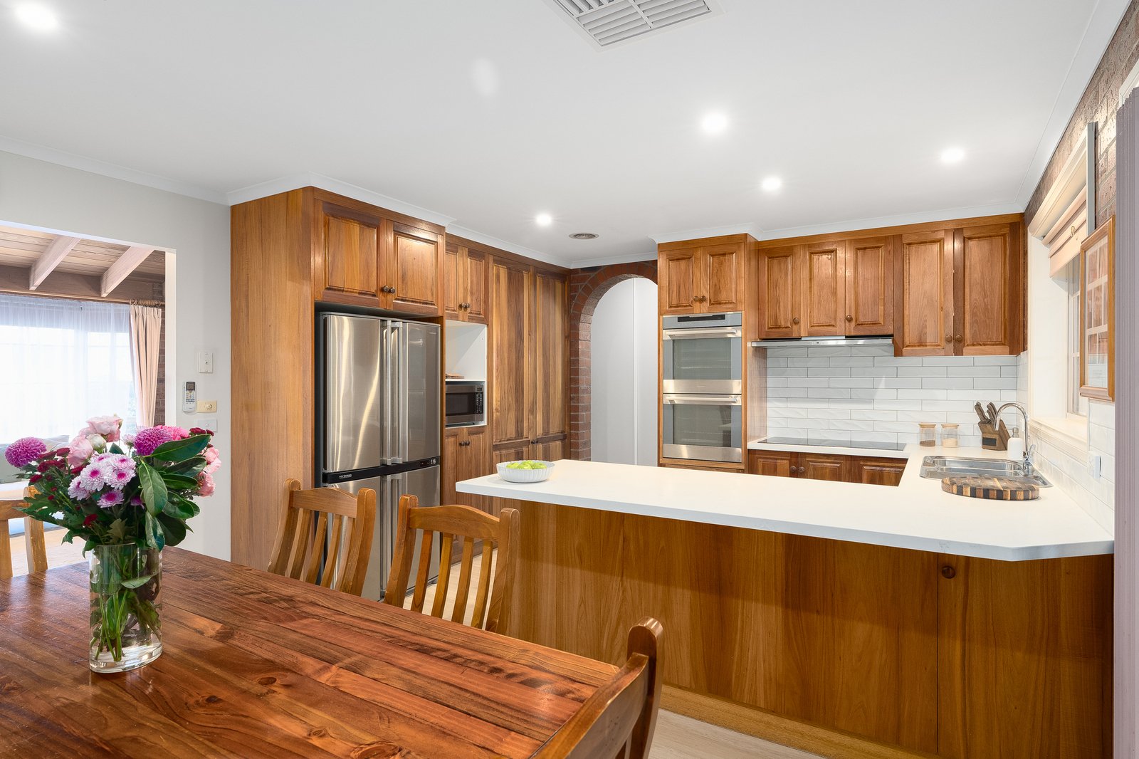 Inside, the home offers an inviting blend of warmth and functionality. The downstairs lounge is full of character with its striking timber cathedral ceiling, while the practical floorplan provides excellent separation between living spaces. The beautifully appointed Blackwood kitchen is both timeless and functional, complete with stone benchtops, induction cooktop, stainless steel double oven, quality Asko dishwasher and generous storage, all positioned to connect seamlessly with the dining and living areas.