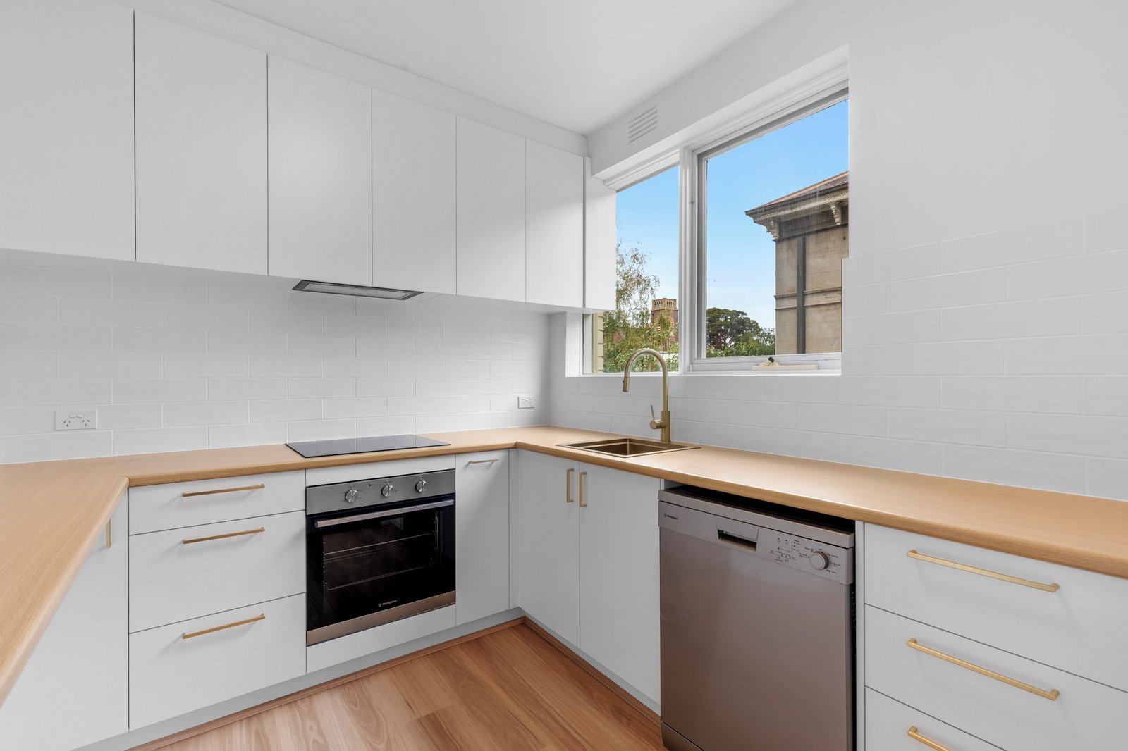 The renovated kitchen is a standout feature, showcasing sleek cabinetry, quality appliances including a dishwasher, timber benchtops and a stylish brass tapware finish. Bathed in natural light from the large window, it offers both functionality and a fresh contemporary aesthetic.