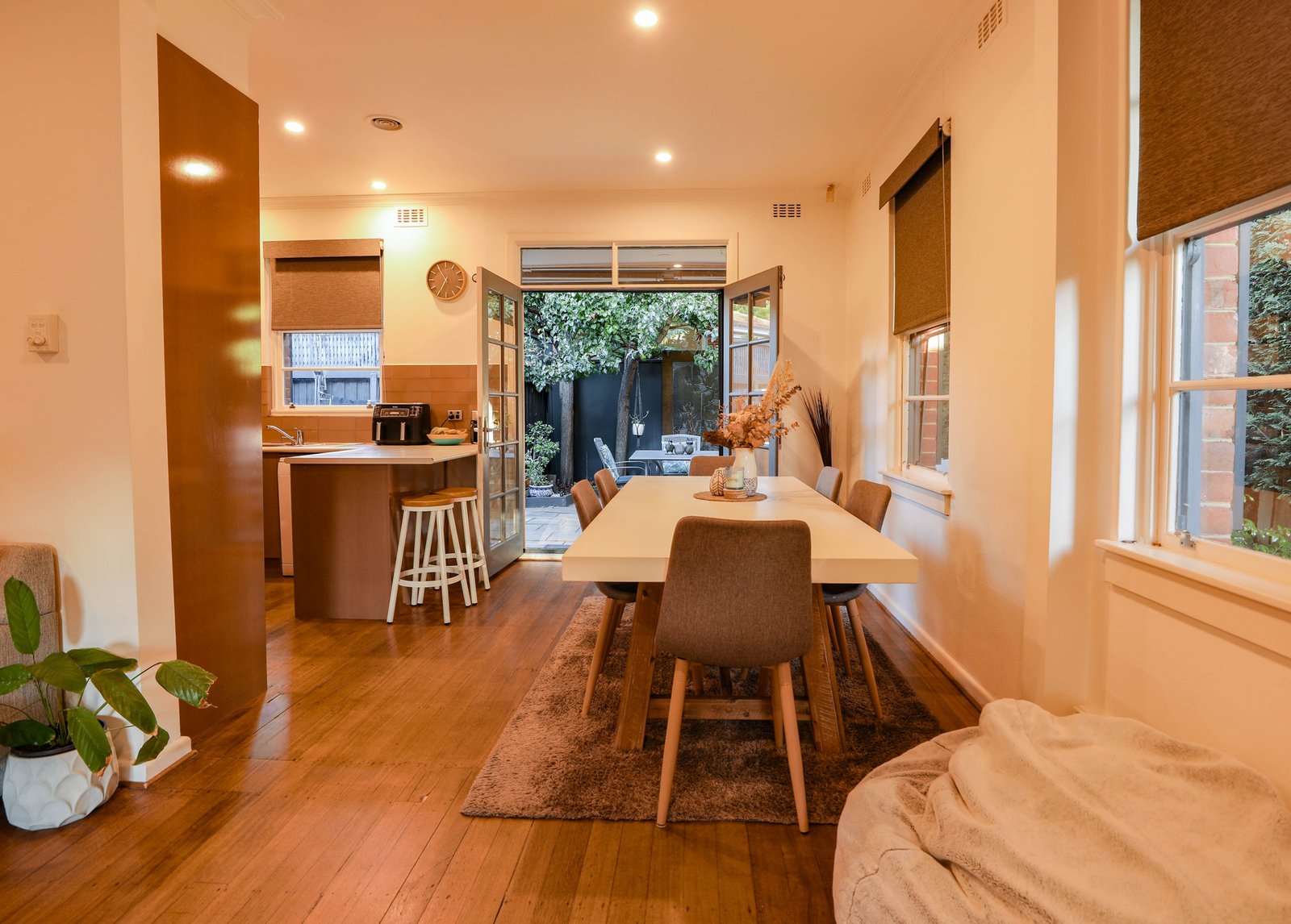 Thoughtfully designed to maximise space and natural light, the home features a stunning open-plan living and dining zone centred around a stylish contemporary kitchen. French doors open seamlessly to a European-inspired rear courtyard, creating the perfect setting for relaxed outdoor entertaining in tranquil surrounds.