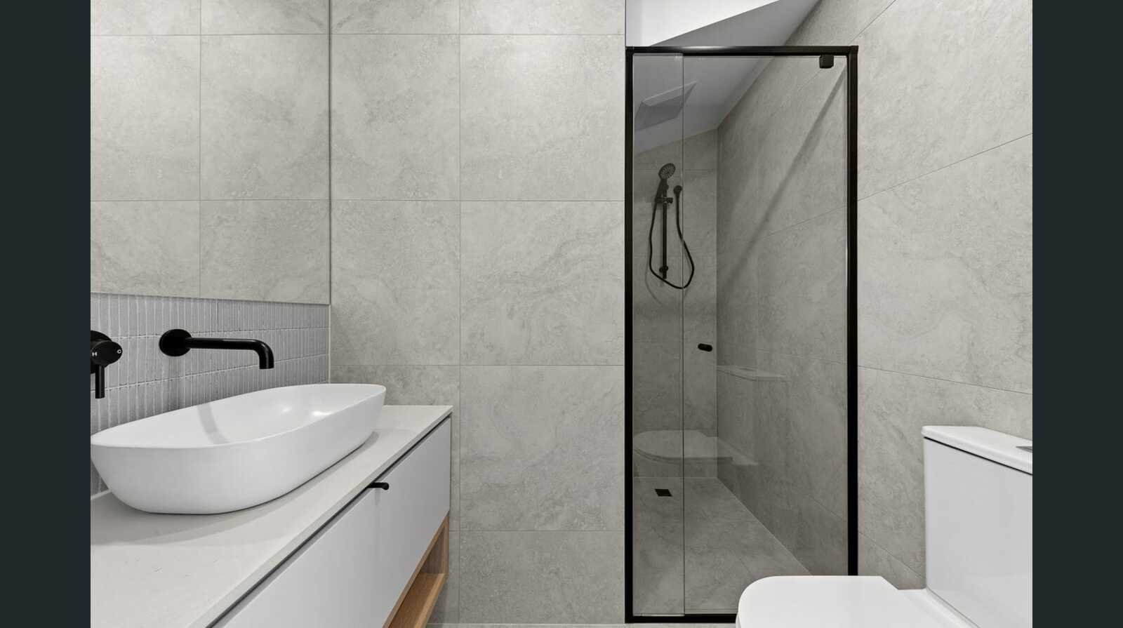 The home is thoughtfully designed over three levels. The ground floor features a bedroom with an adjacent bathroom and access to a private garden. The middle level hosts the open-plan living and dining area, a gourmet kitchen with stone benchtops, premium appliances including a fully integrated dishwasher, a powder room, and a convenient laundry. Upstairs are two generous bedrooms, each with mirrored built-in robes and private ensuites.