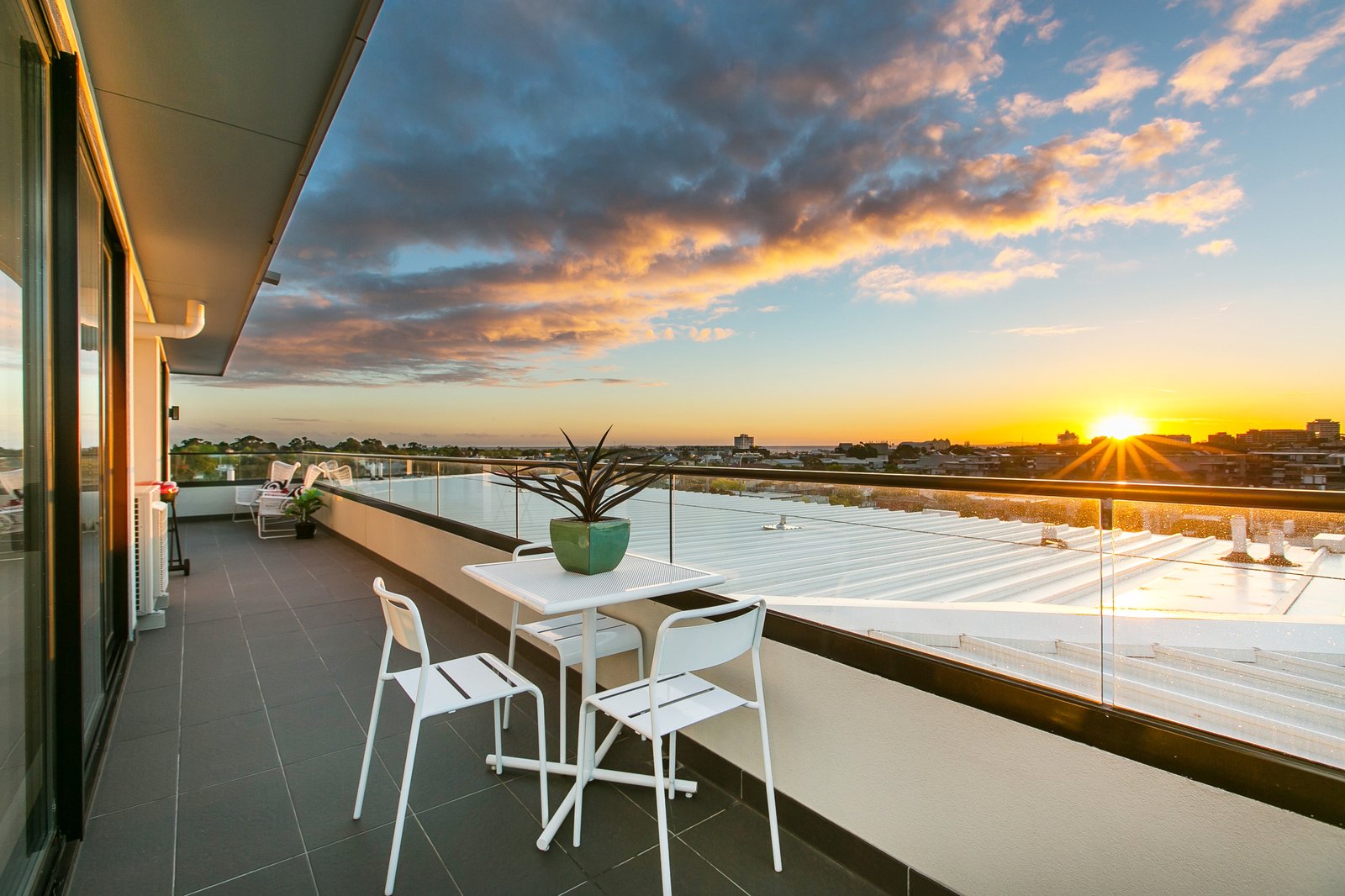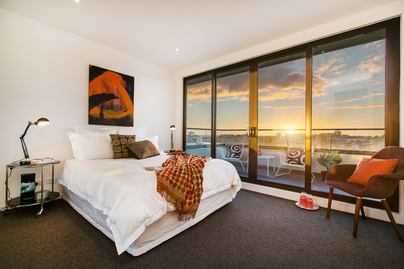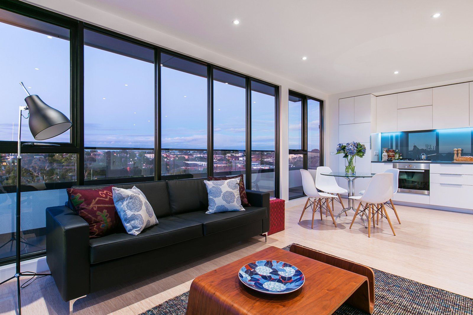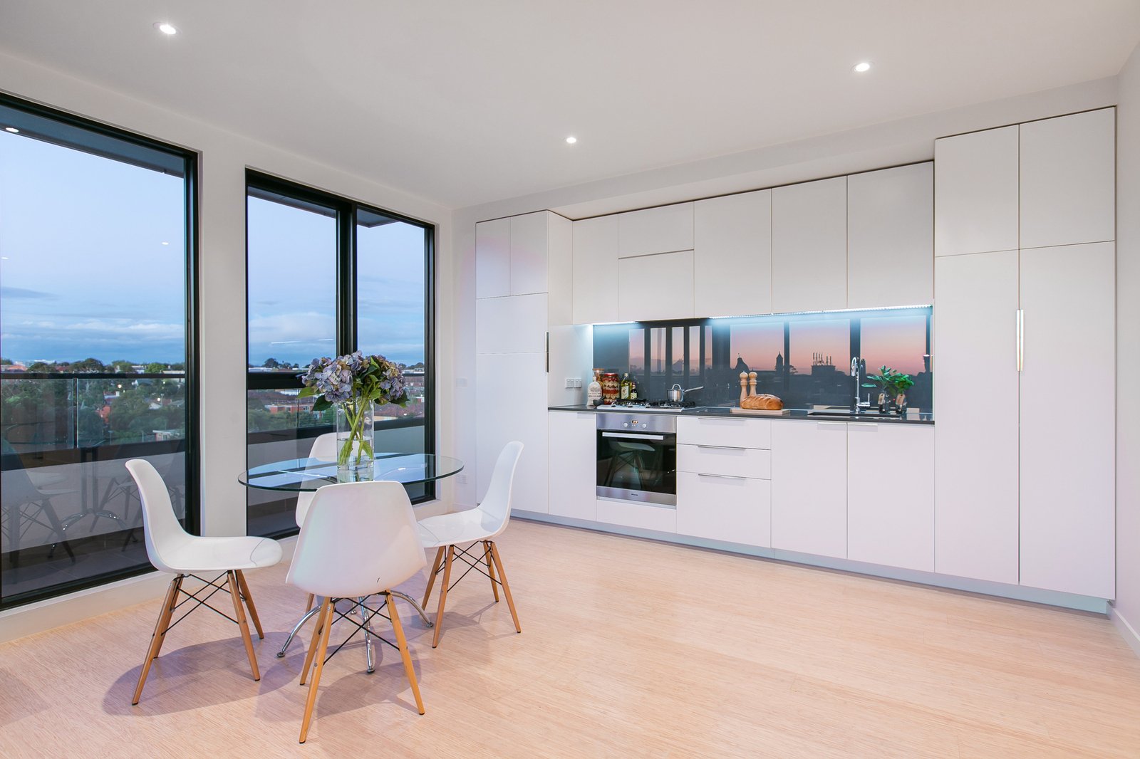 Bathed in natural light, the penthouse offers spacious open-plan living and dining that flows effortlessly to a large balcony capturing sweeping 360-degree views across St Kilda. A modern chef’s kitchen sits at the centre of the home, complete with stone benchtops, integrated fridge, Mielie appliances, dishwasher and gas cooking—perfect for everyday living or entertaining.