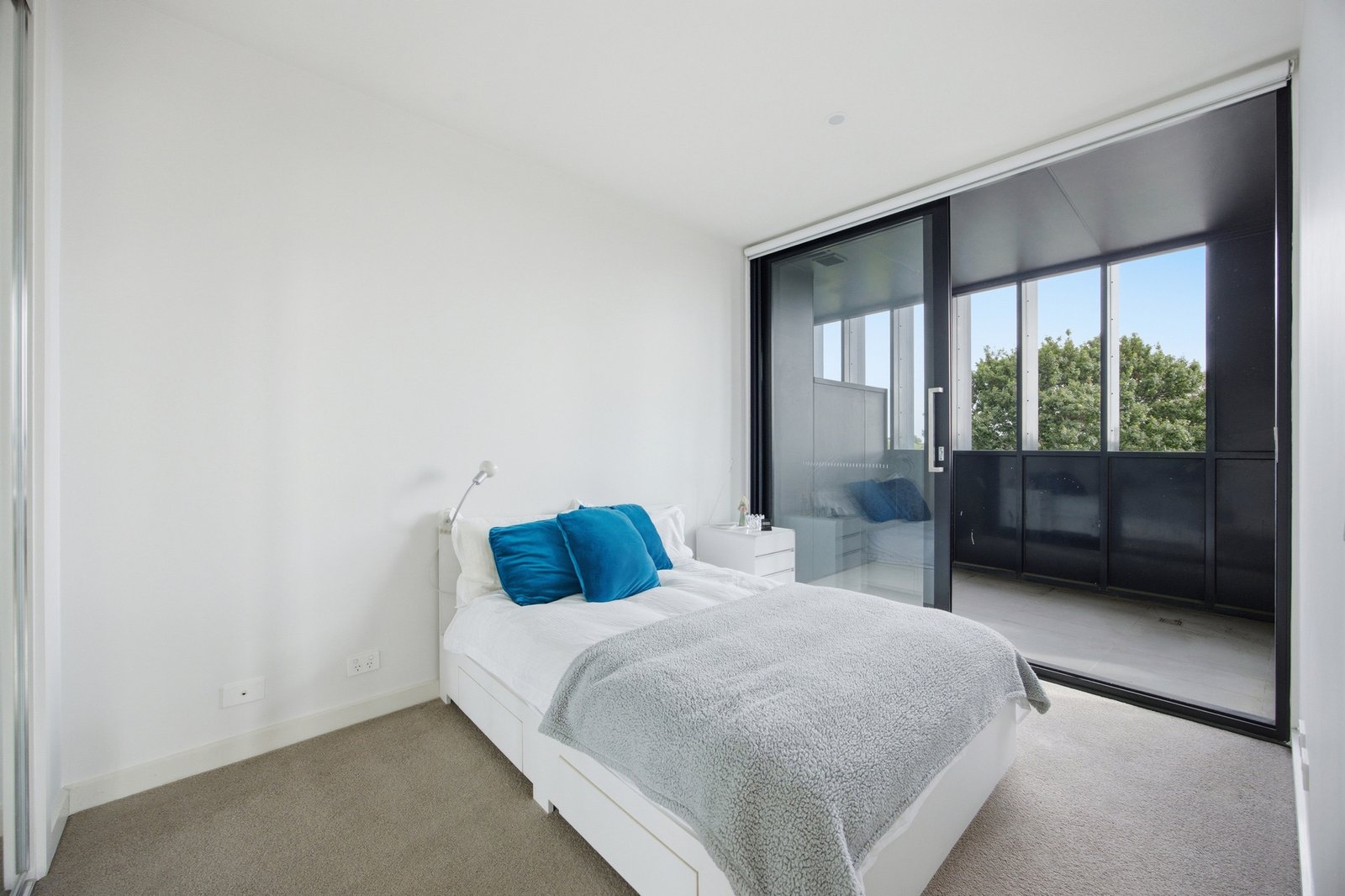 The generously proportioned bedroom is fitted with mirrored robes and opens directly to the balcony, sharing the same green outlook and reinforcing the easy connection between indoor spaces and outdoor retreat. The bathroom continues the contemporary palette, fully tiled with a walk-in shower.