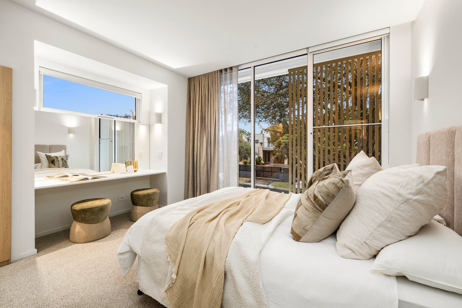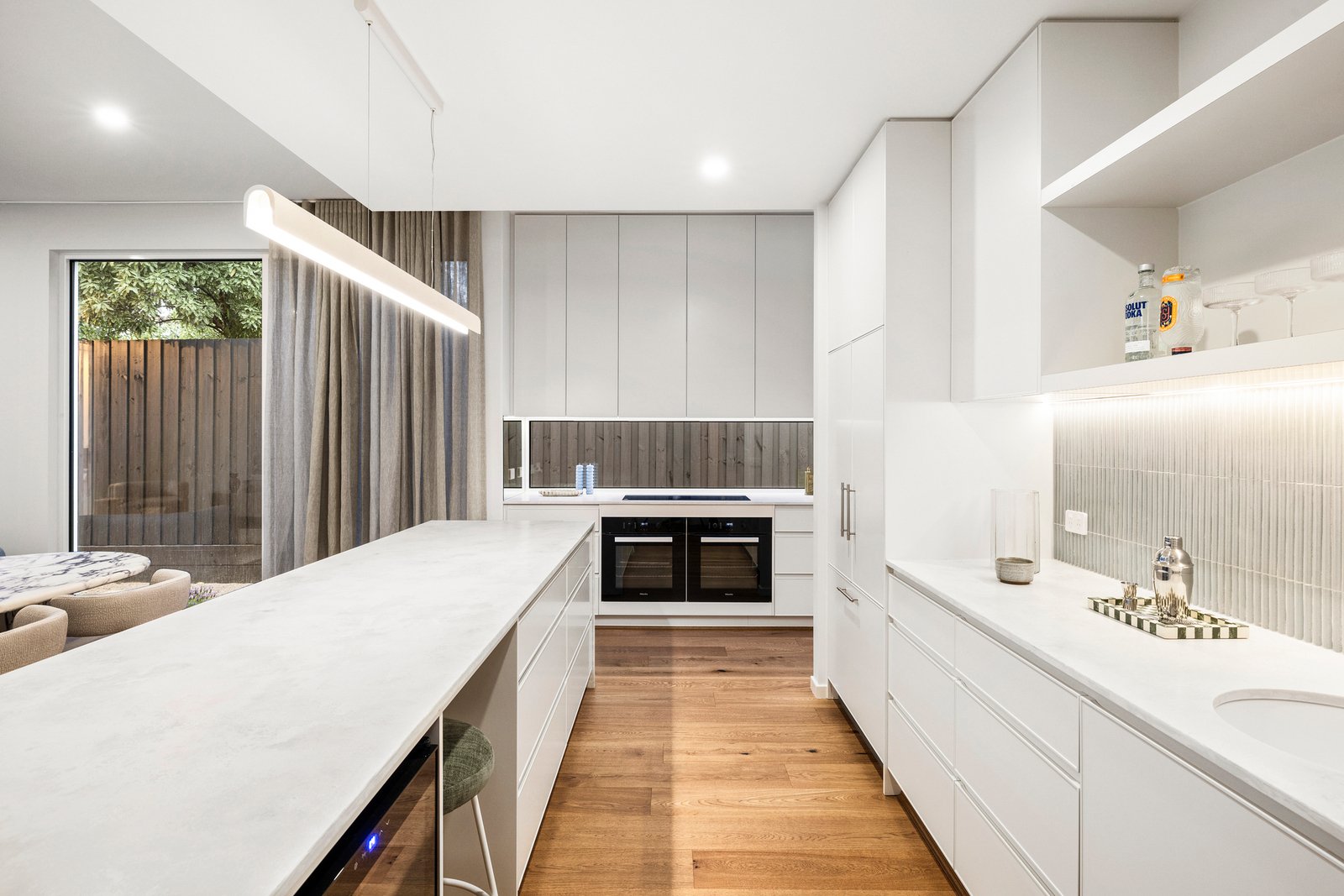 Inside, beautifully curated interiors by I Visualise It embrace soft, muted hues and layered textures inspired by the nearby sand and sea. Beneath soaring 3m ceilings, the light-filled open-plan living and dining zone is anchored by a statement kitchen appointed with Lavistone benchtops, premium Miele appliances, an integrated fridge/freezer, wine fridge and a stunning 3D finger-tiled splashback.